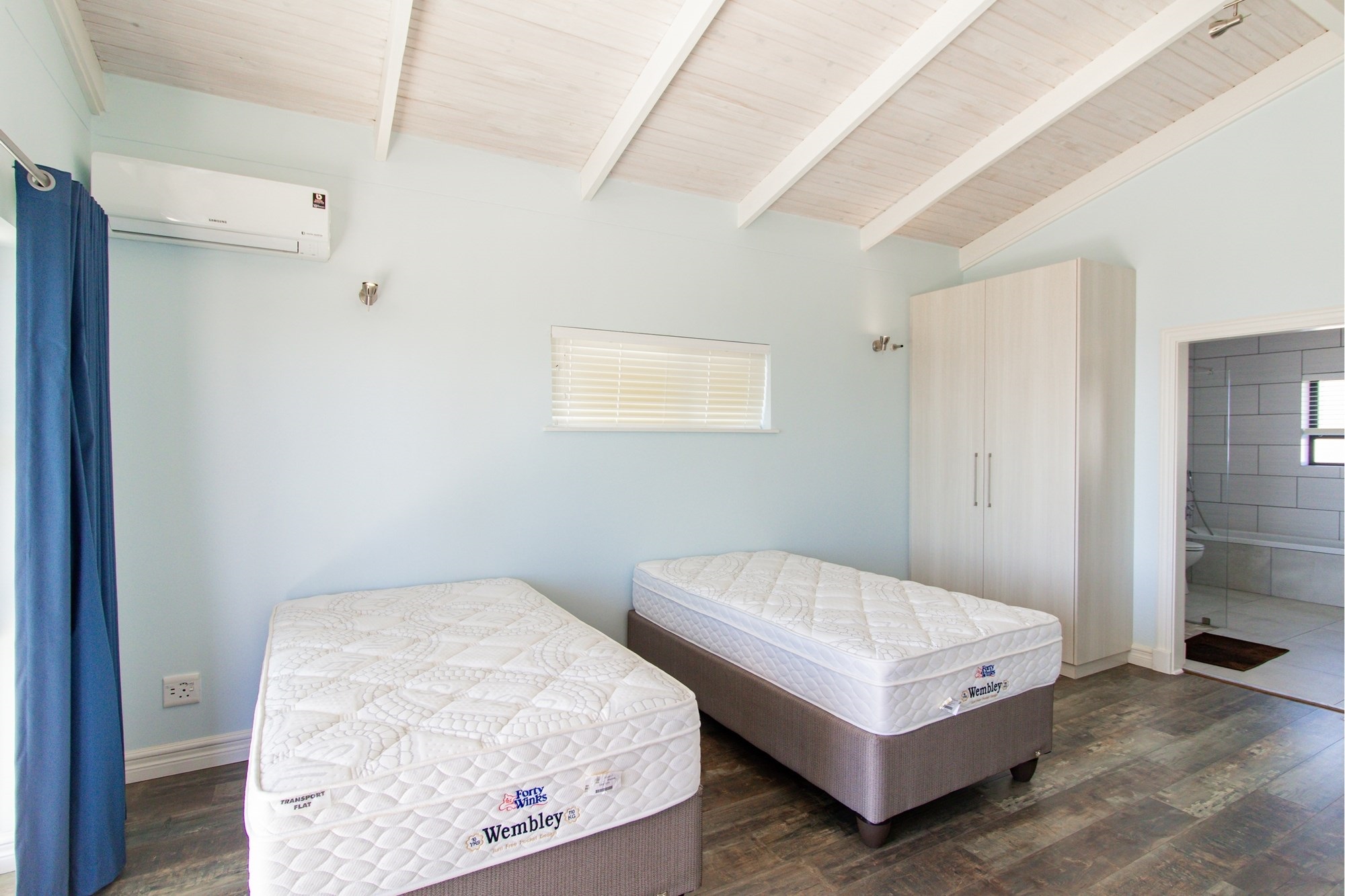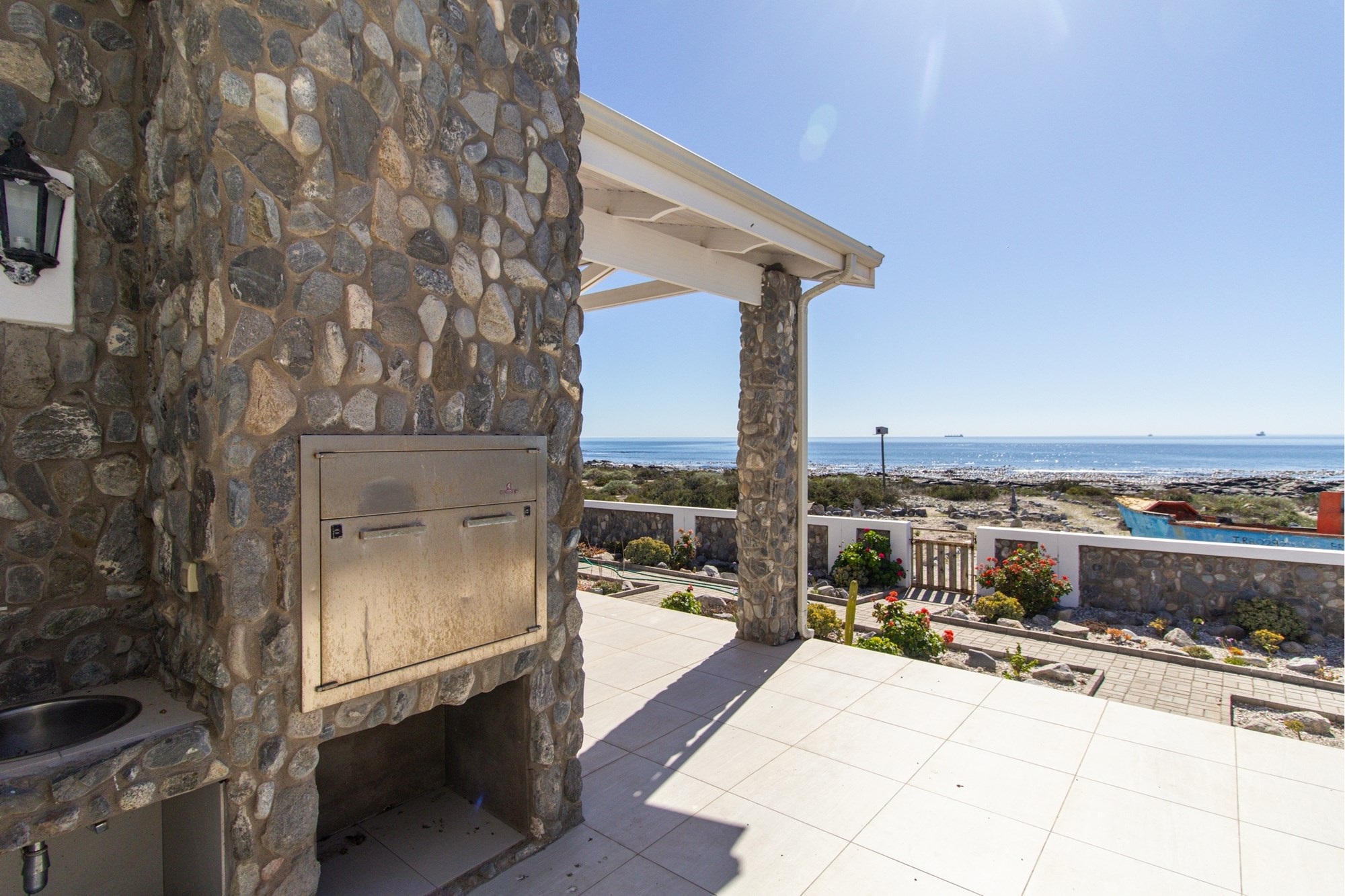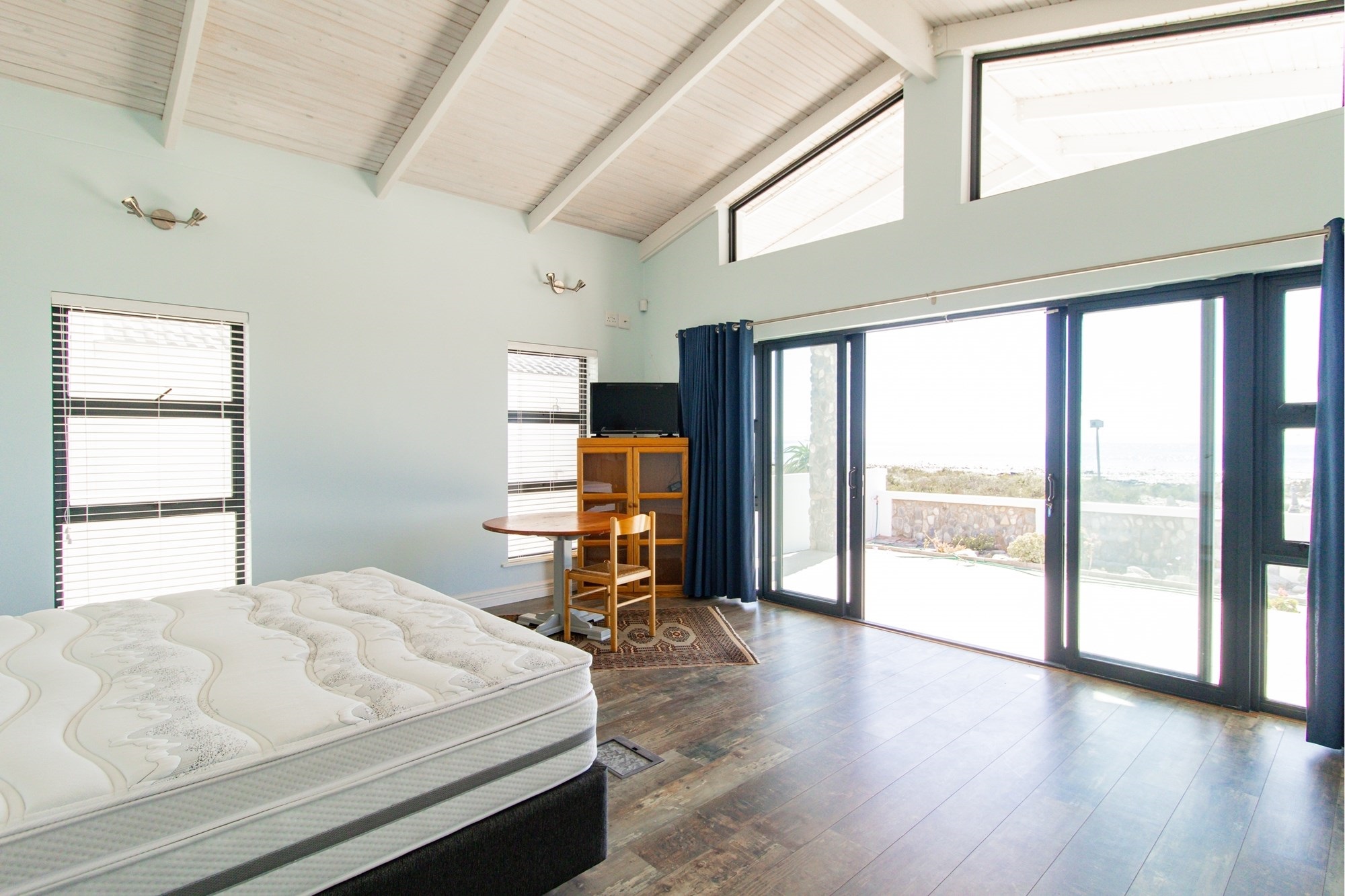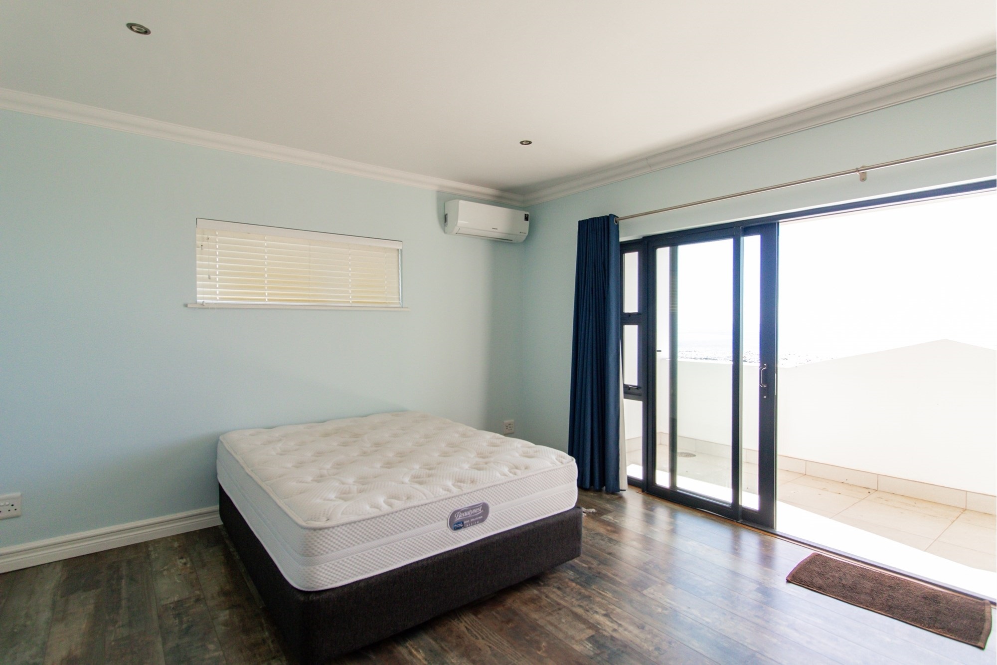 The living area includes built-in air-conditioning and a gas fireplace, creating comfort through all seasons. Sliding doors open onto a wooden deck with a built-in gas braai, perfect for entertaining while soaking up breath-taking sunsets over the Atlantic.