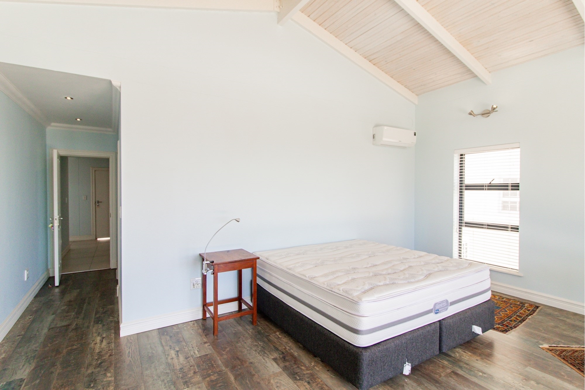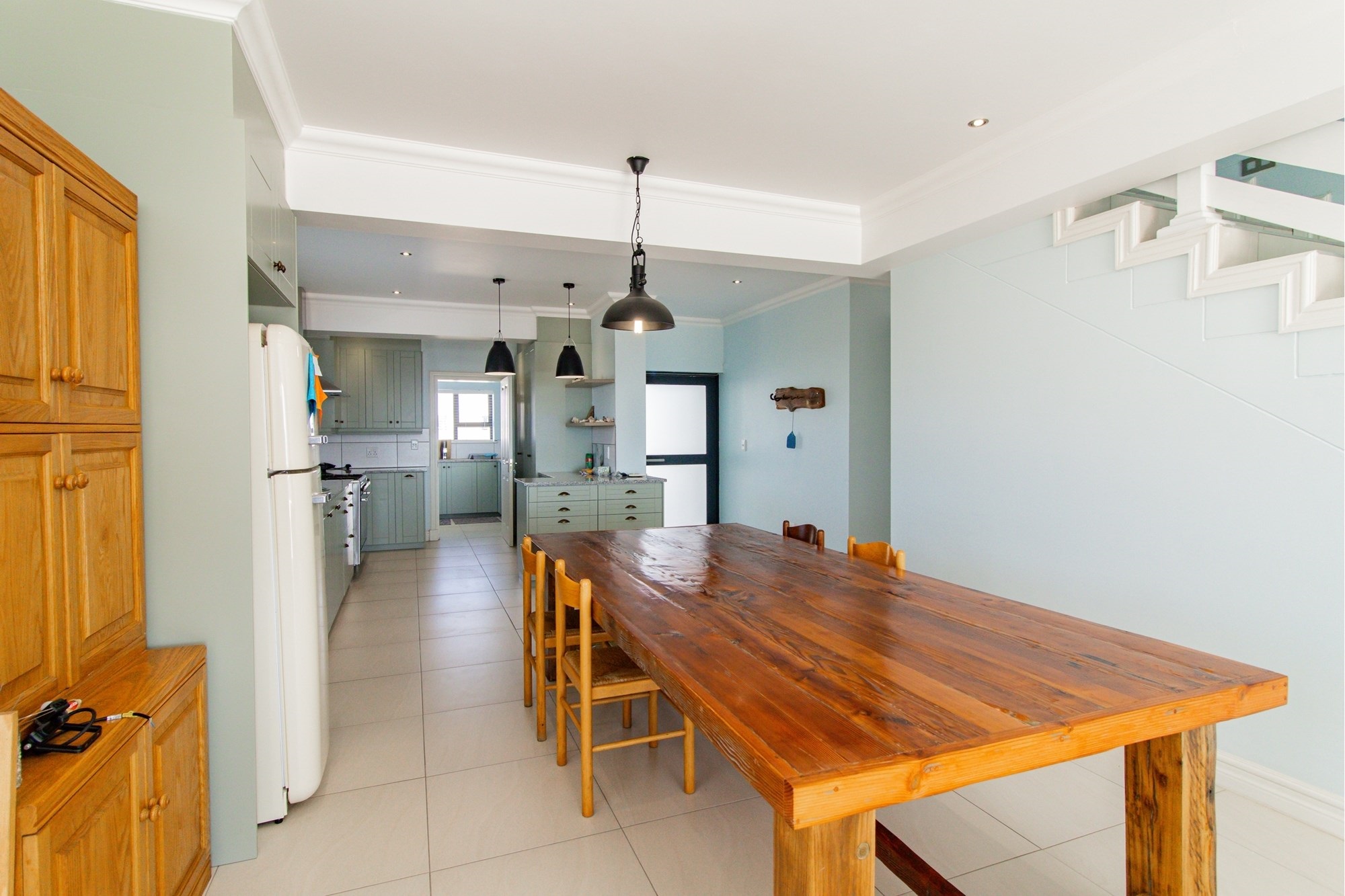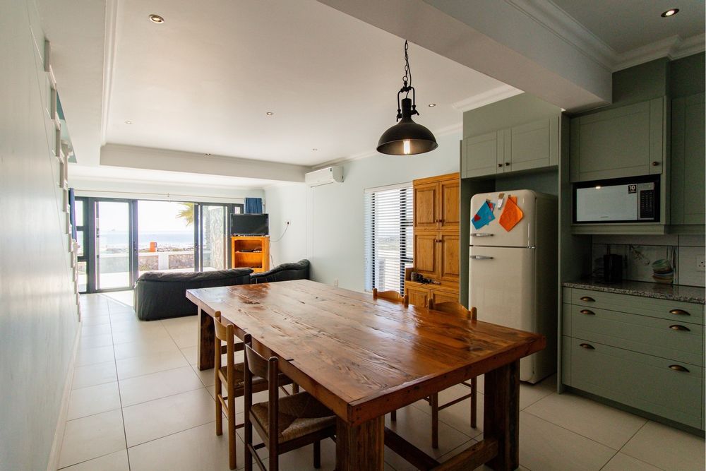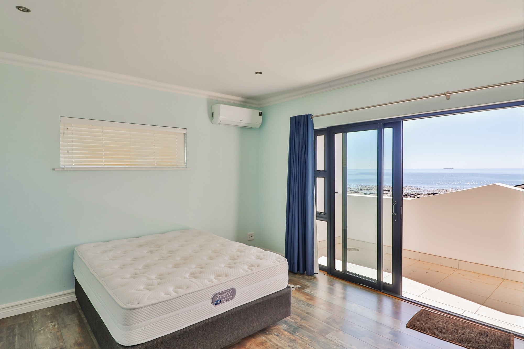 The living area includes built-in air-conditioning and a gas fireplace, creating comfort through all seasons. Sliding doors open onto a wooden deck with a built-in gas braai, perfect for entertaining while soaking up breath-taking sunsets over the Atlantic.