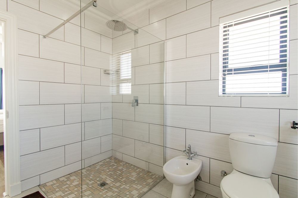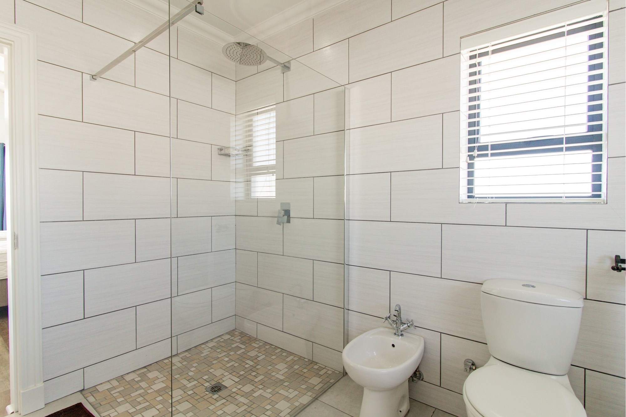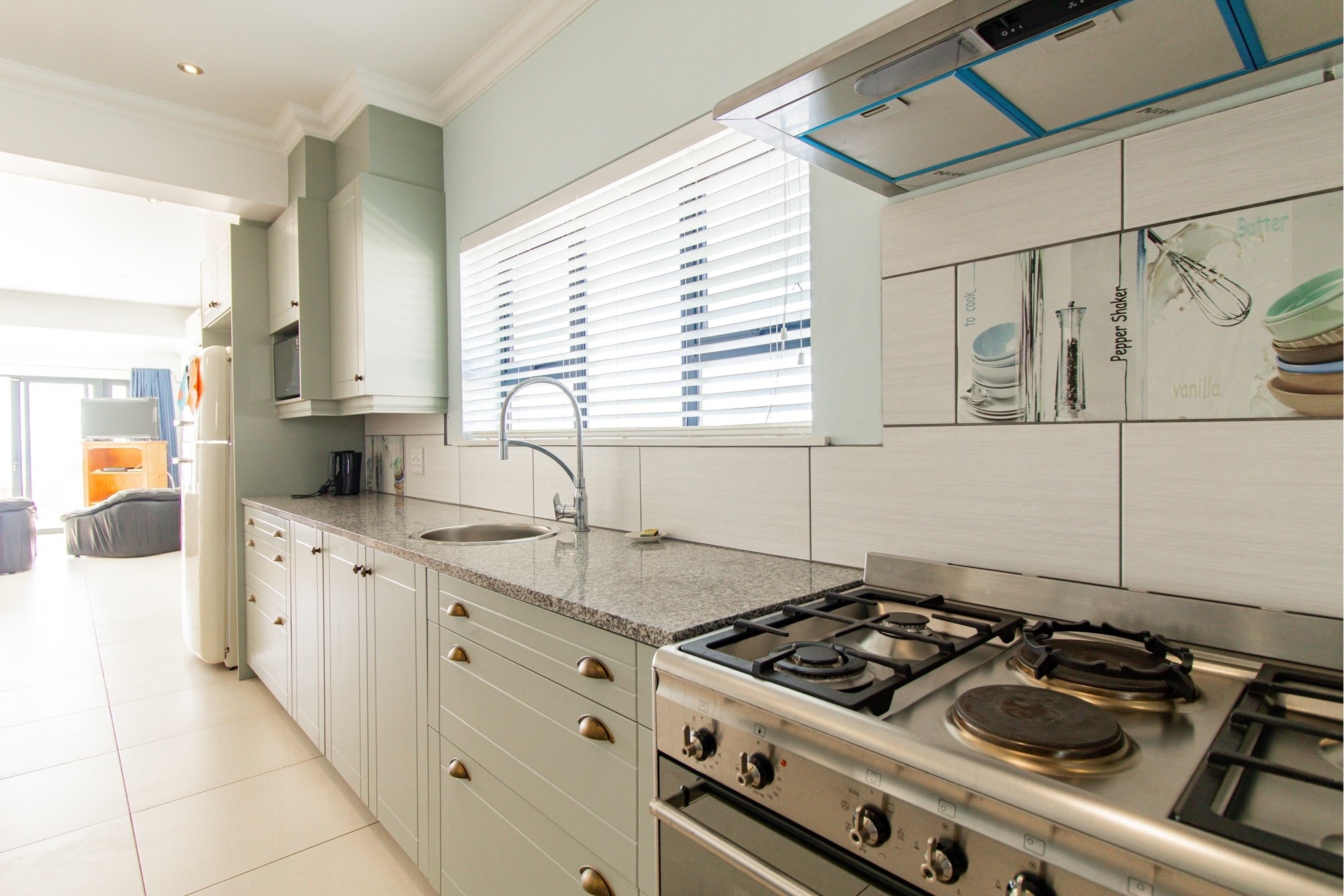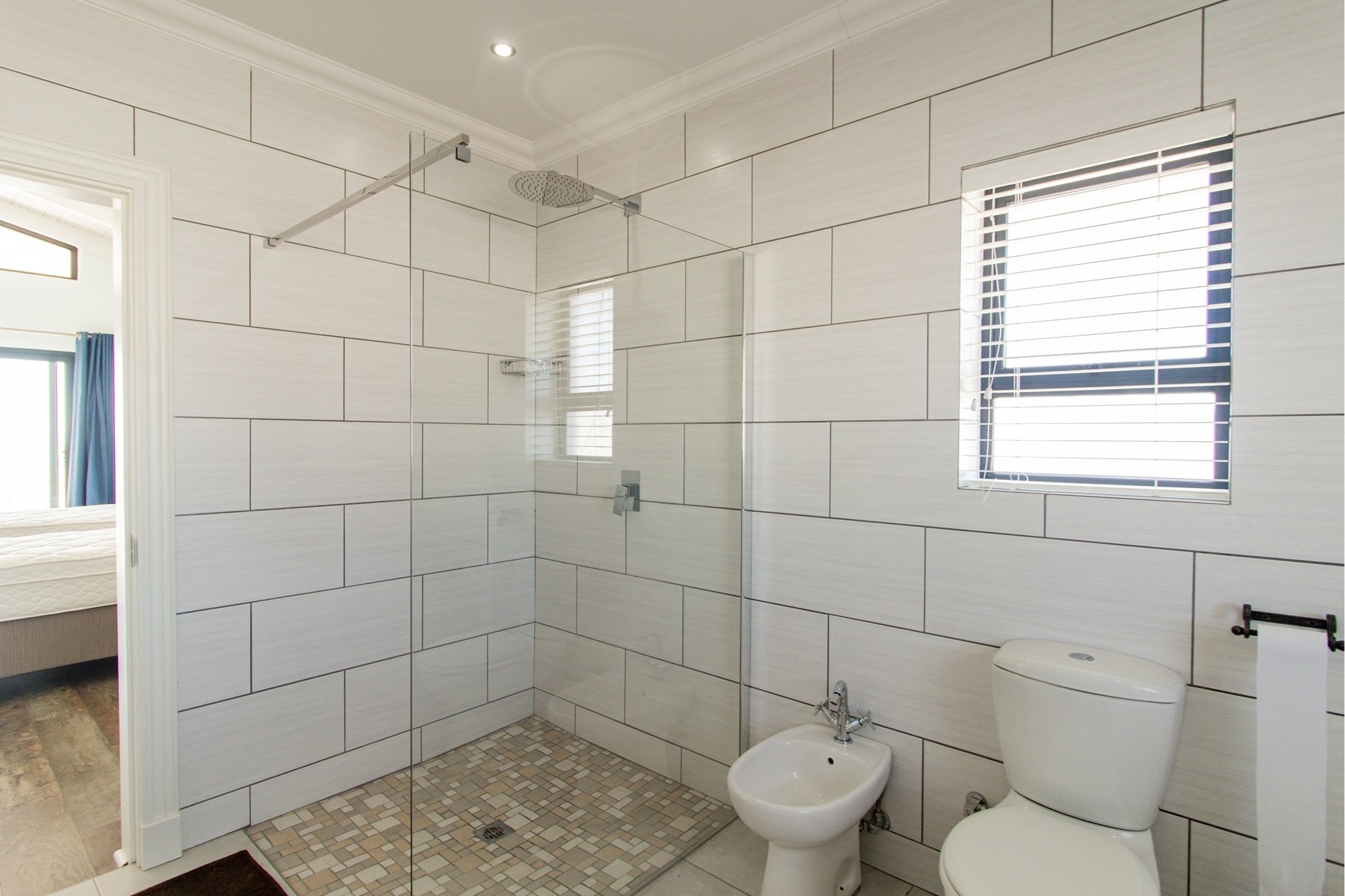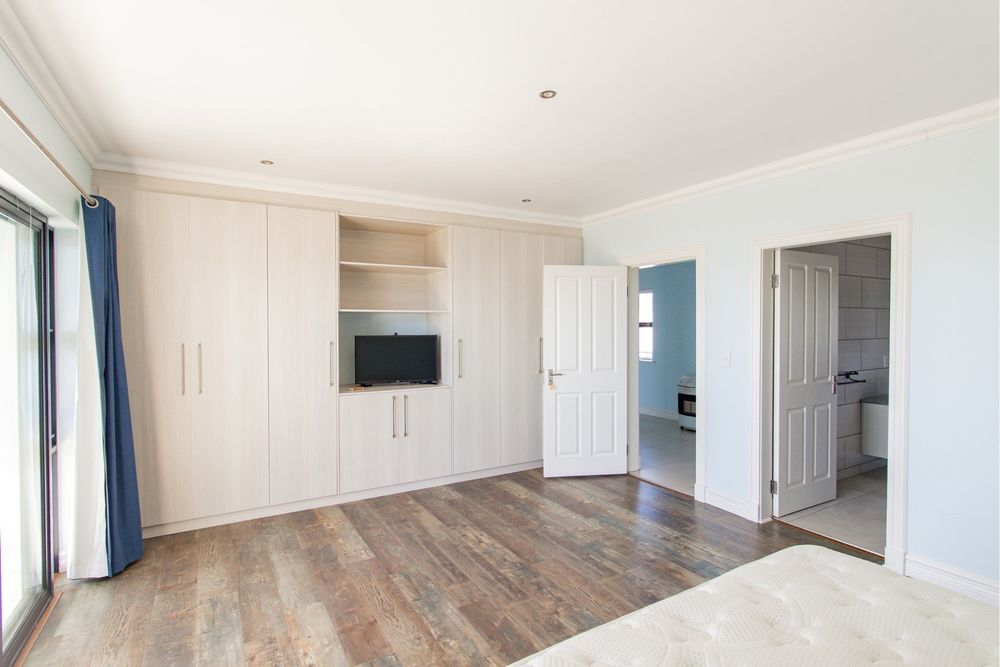 The living area includes built-in air-conditioning and a gas fireplace, creating comfort through all seasons. Sliding doors open onto a wooden deck with a built-in gas braai, perfect for entertaining while soaking up breath-taking sunsets over the Atlantic.