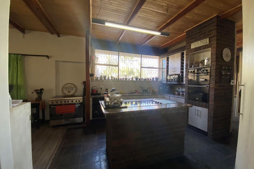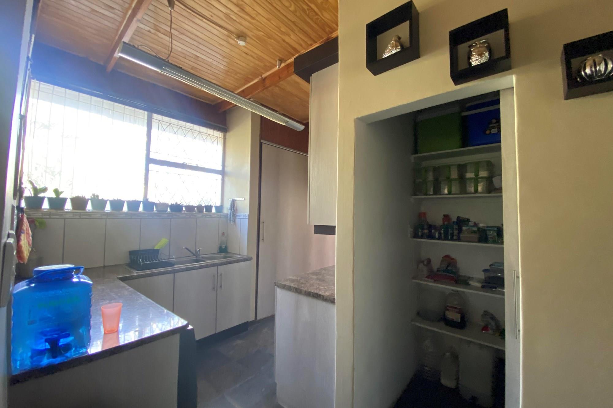 This property boasts an open plan kitchen with ample cupboard space with gas stove and electric separate oven, specious pantry and scullery, the kitchen seamlessly connects to the dining area that leads to the living area.