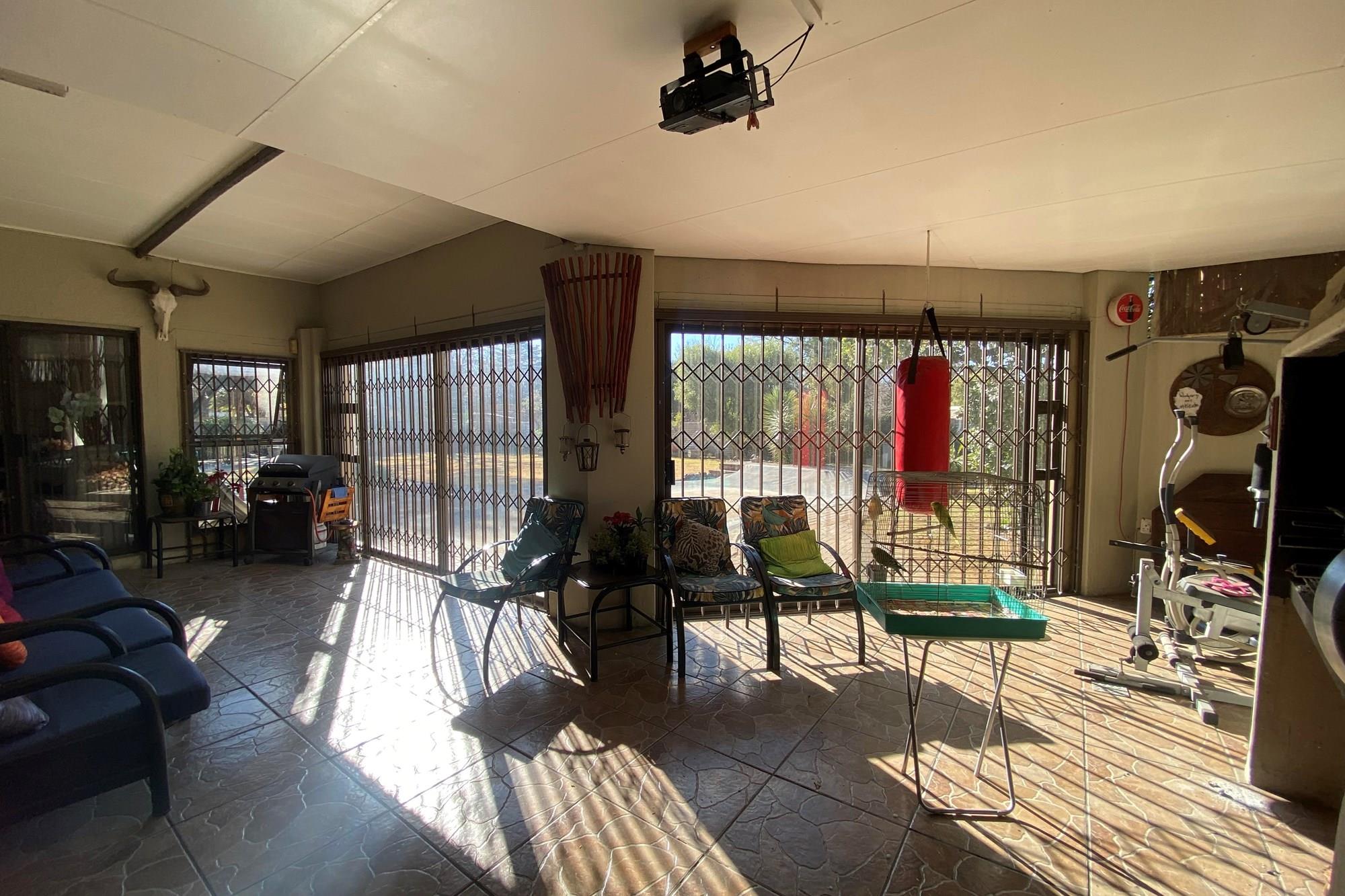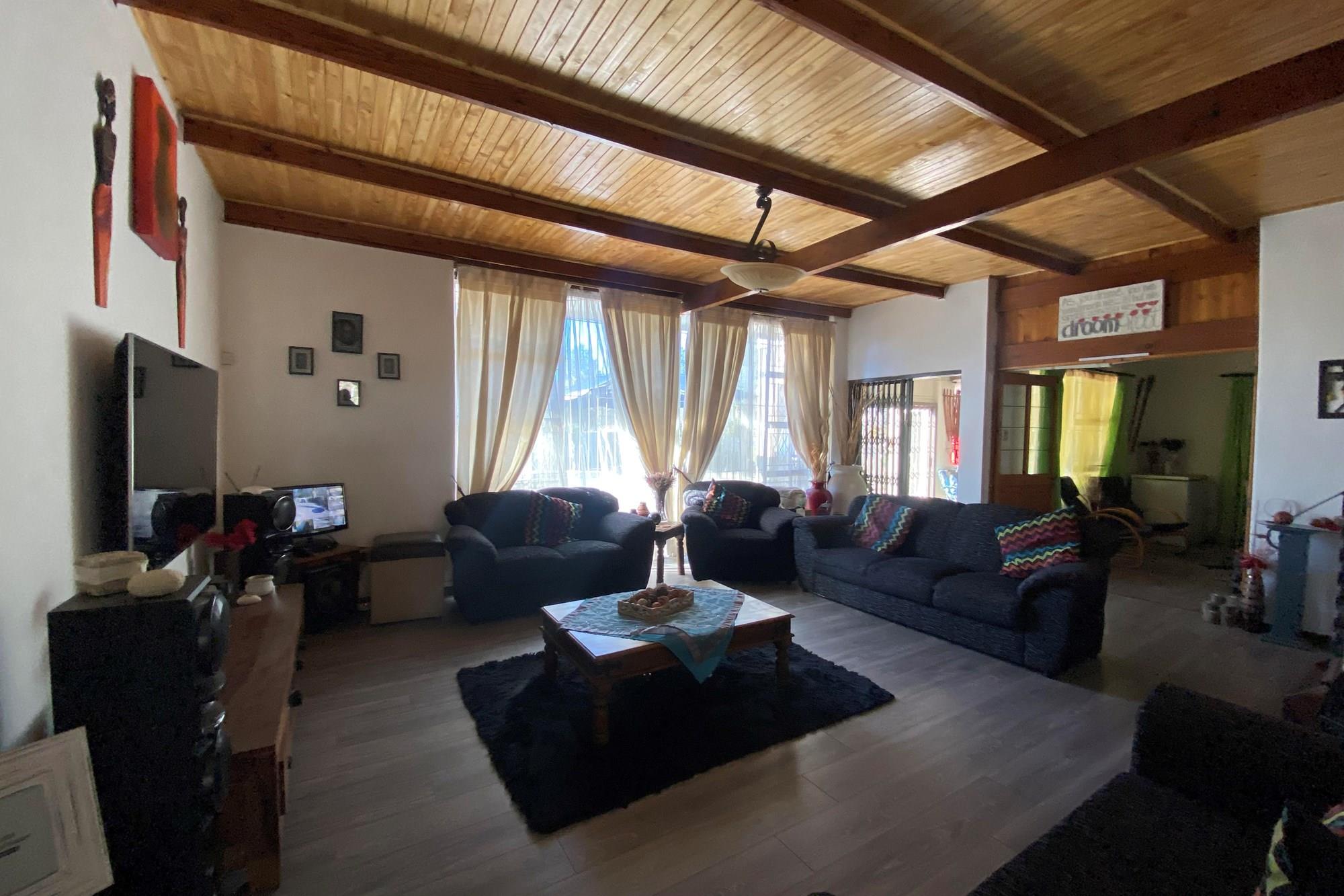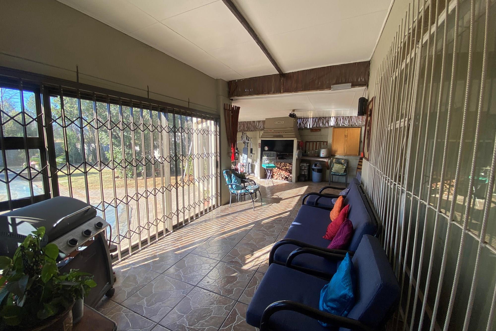 The living area with glass sliding doors leading to the indoor entertainment area with build in braai. Enjoy the view of the sparkling swimming pool and ever green garden while enjoying a quality time with your family during braai days.