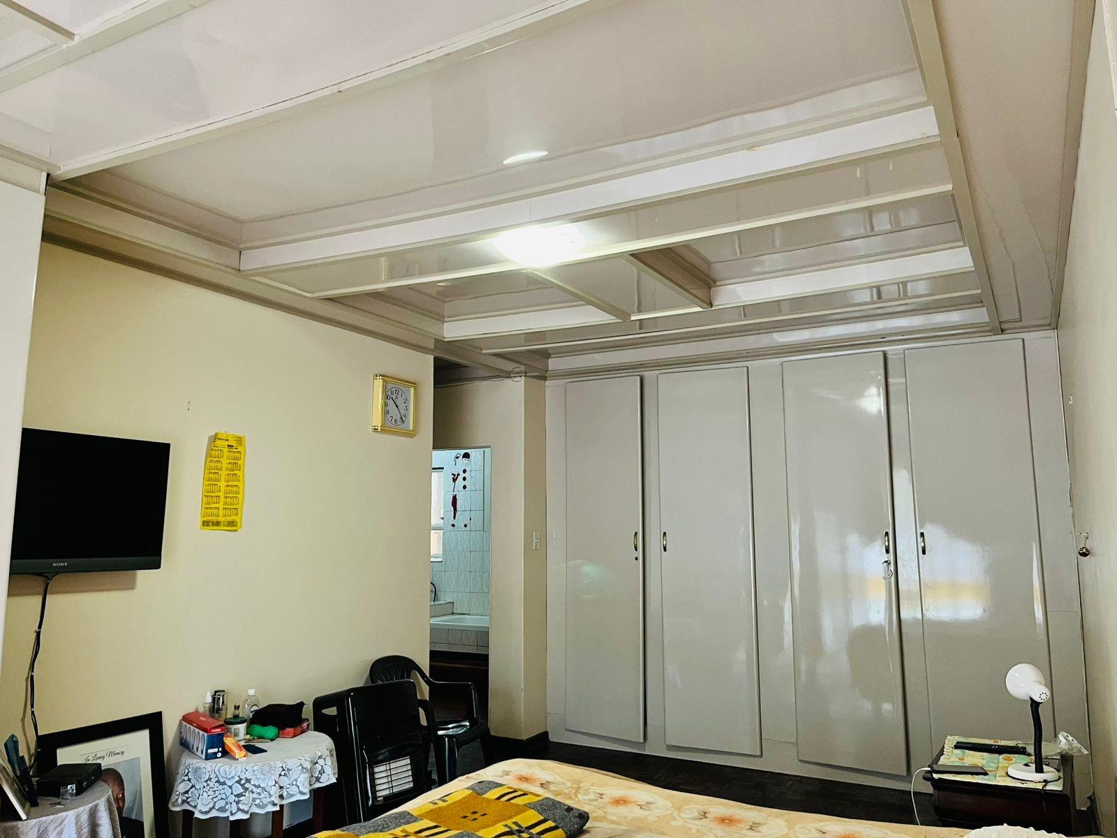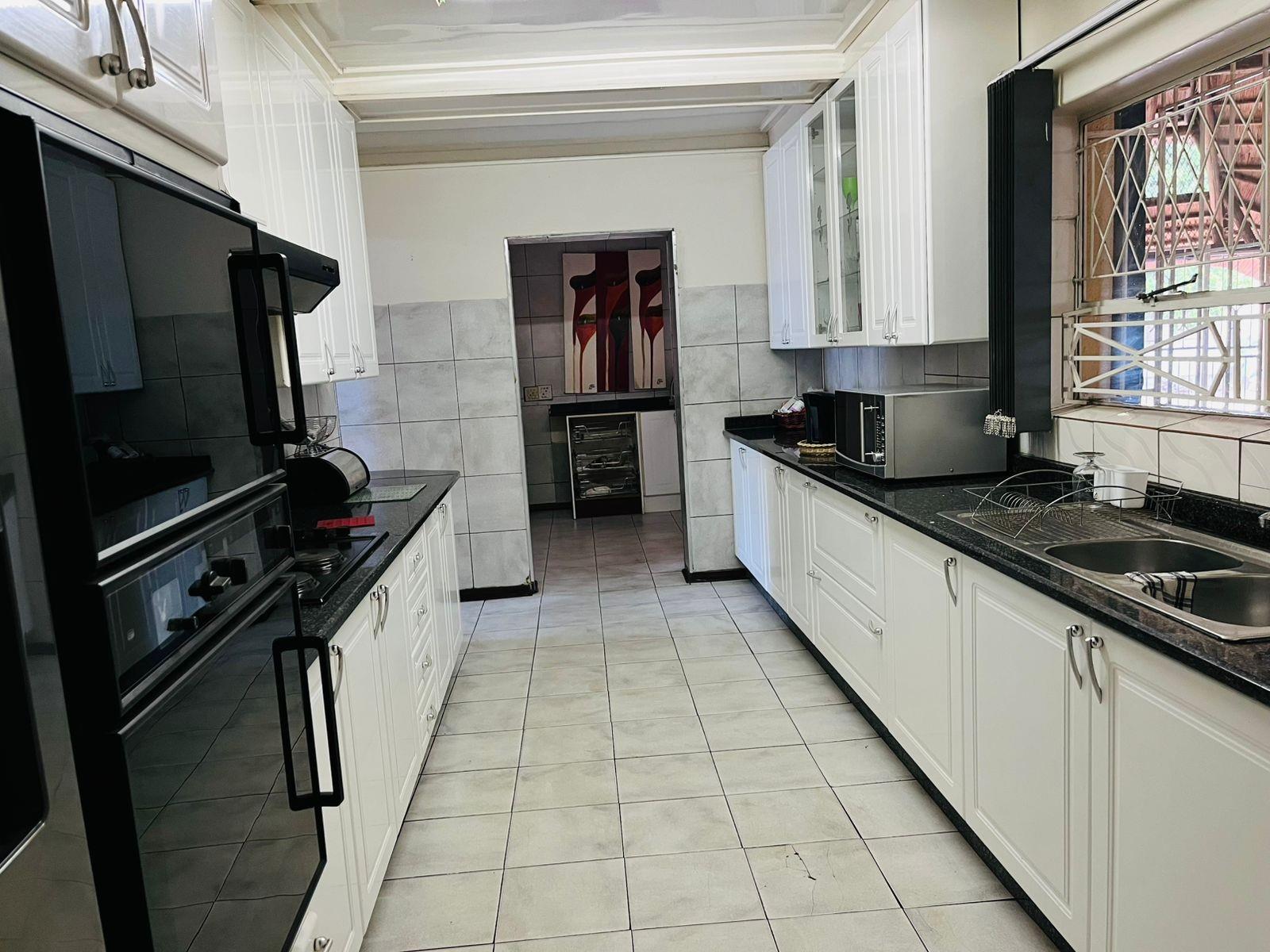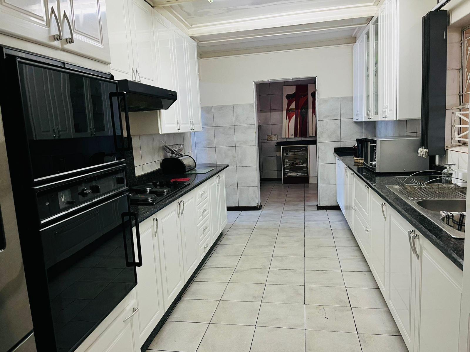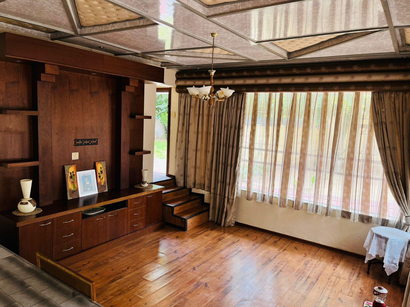 Safety and comfort are prioritized with features such as an alarm system, built-in cupboards, and various bedroom accommodations including double, queen, and king-sized beds. The home is adorned with laminated and tiled floors, adding a touch of elegance throughout.