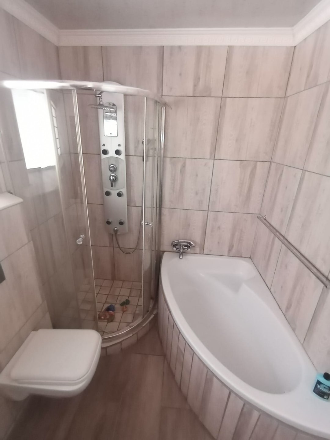 3 Bedrooms with built-in closets. 1 Full bathroom with bathtub, shower, basin, and toilet. Also, an extra guest toilet.