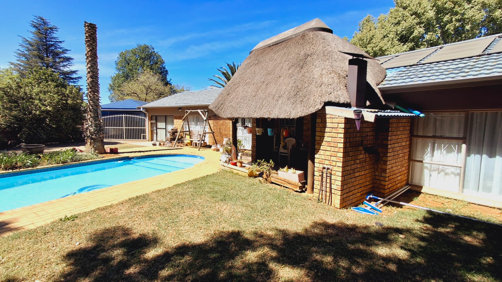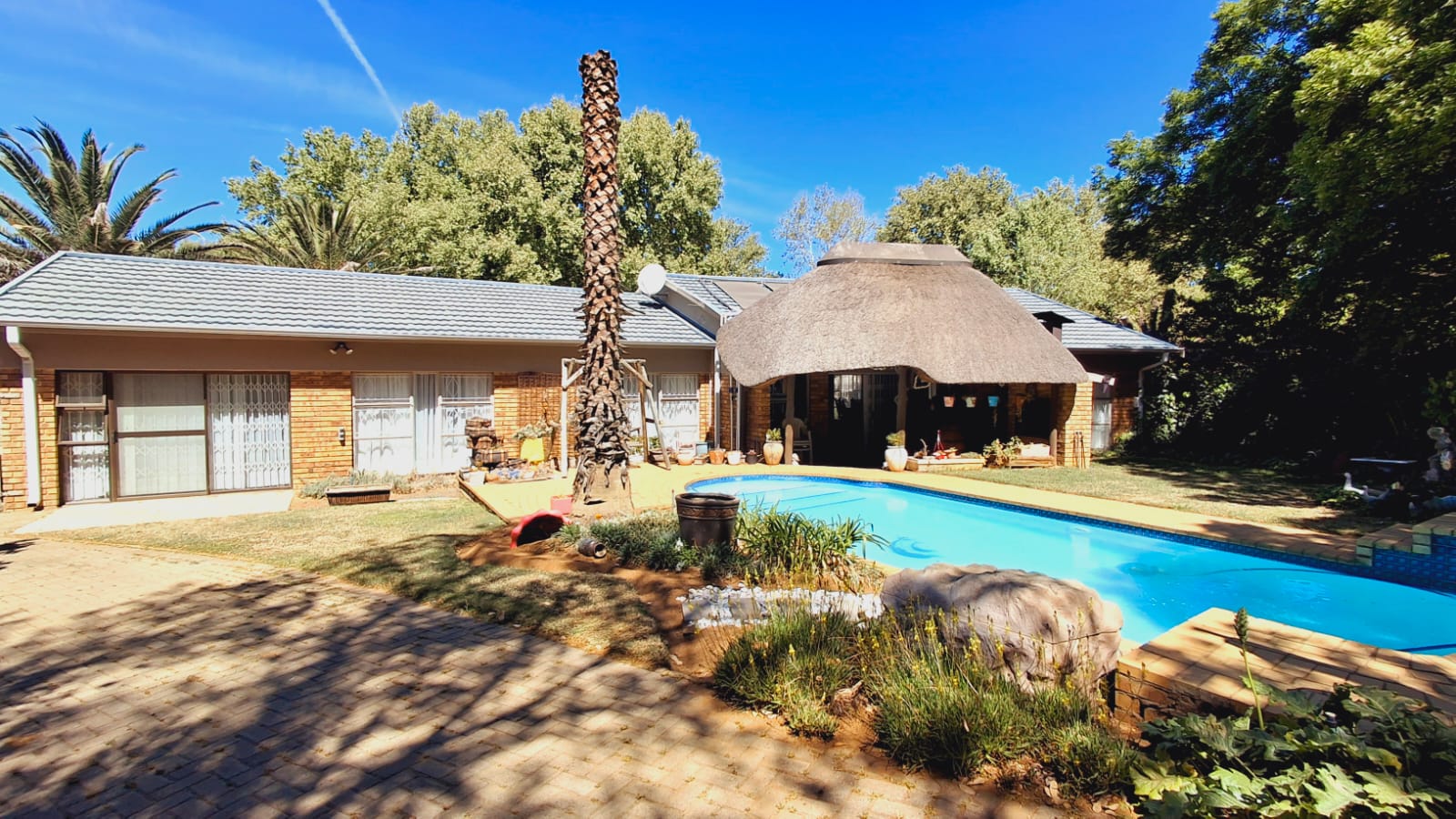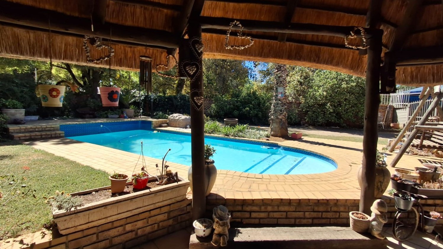 Covered Patio with Built-in Braai – Flowing seamlessly into the lush garden, this outdoor entertaining area leads directly to a sparkling blue swimming pool.