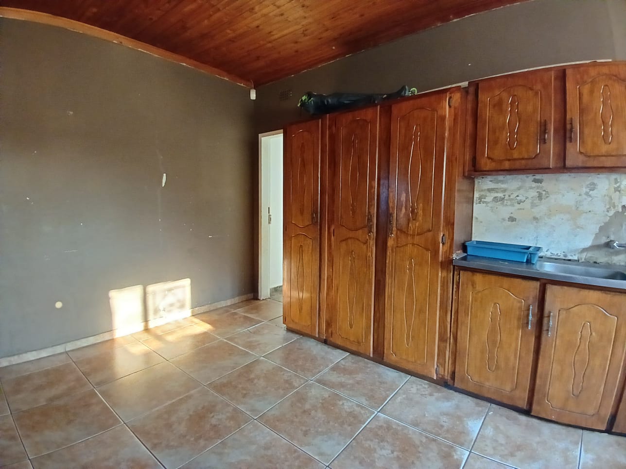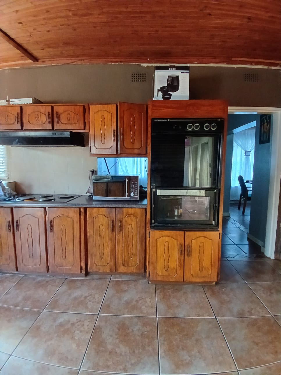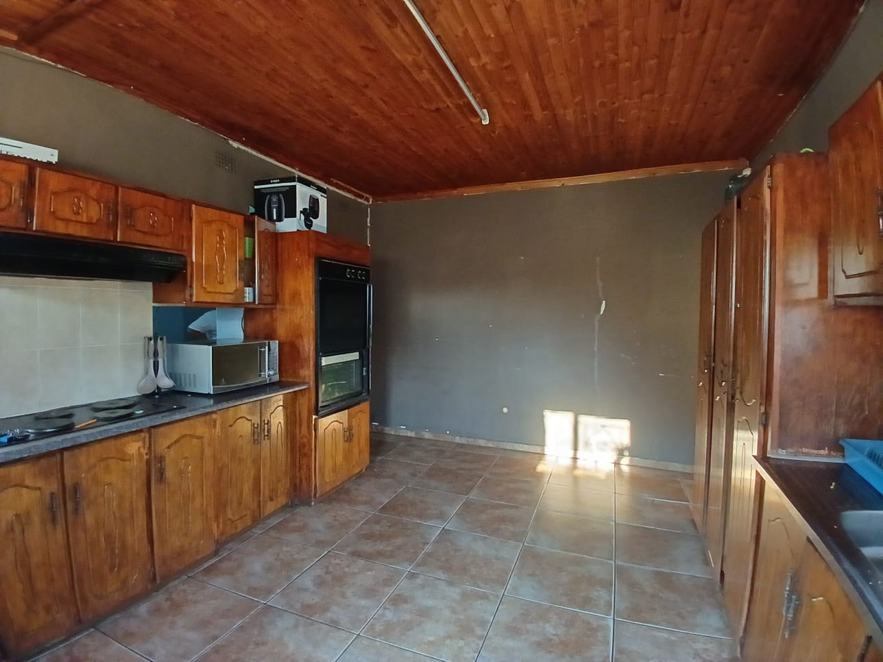 Spacious kitchen with wooden cupboards