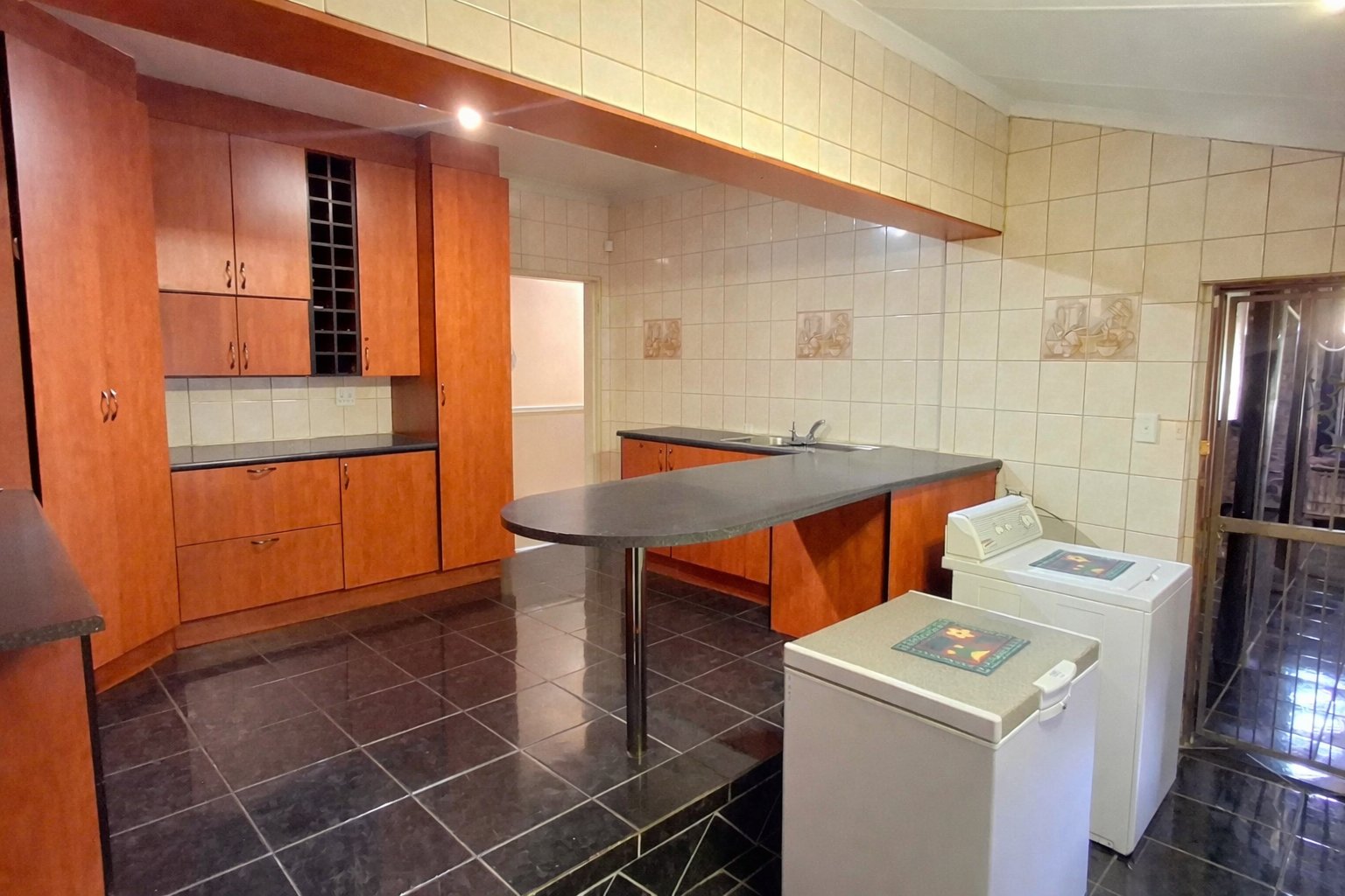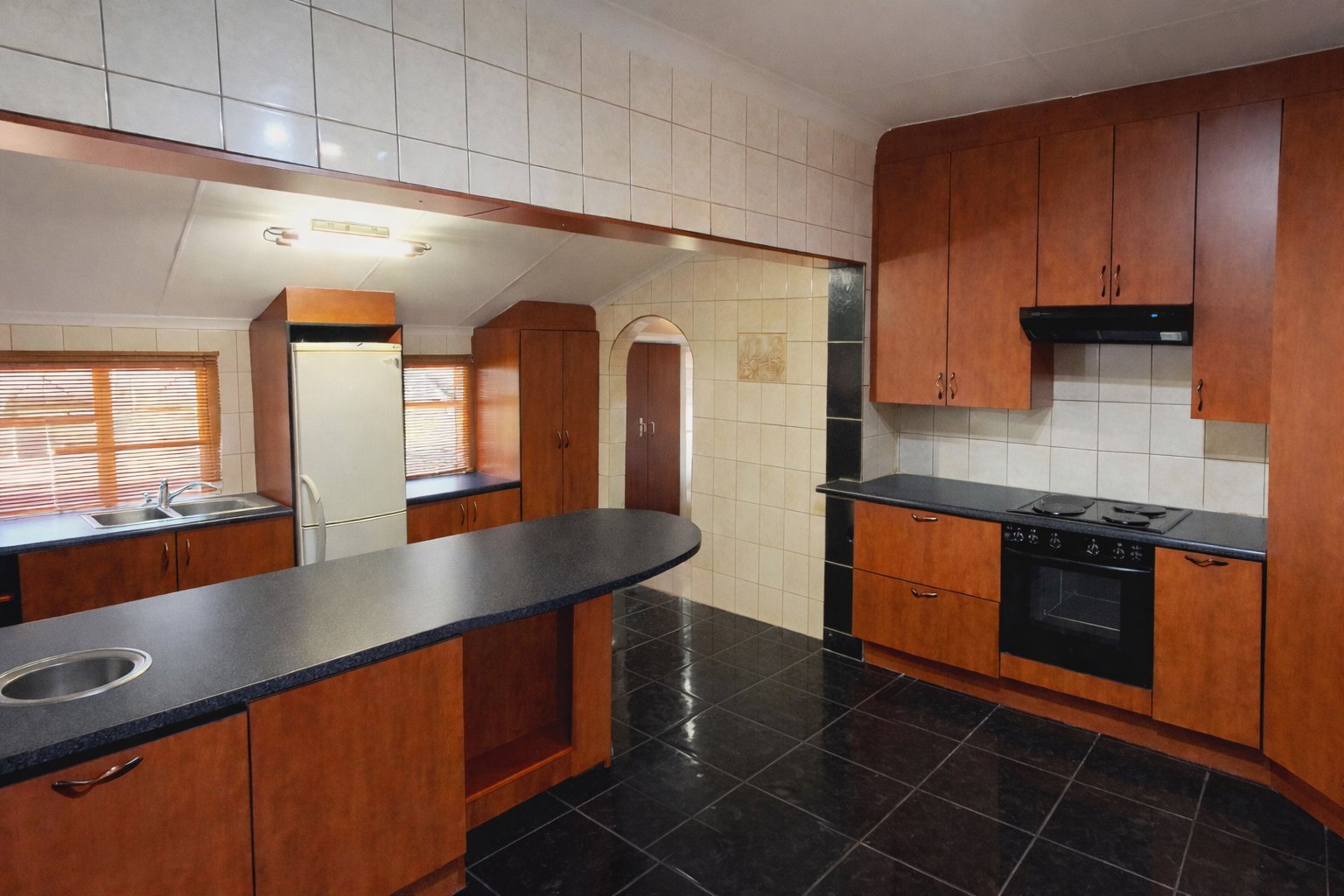 Spacious kitchen with built-in cupboards and ample storage space