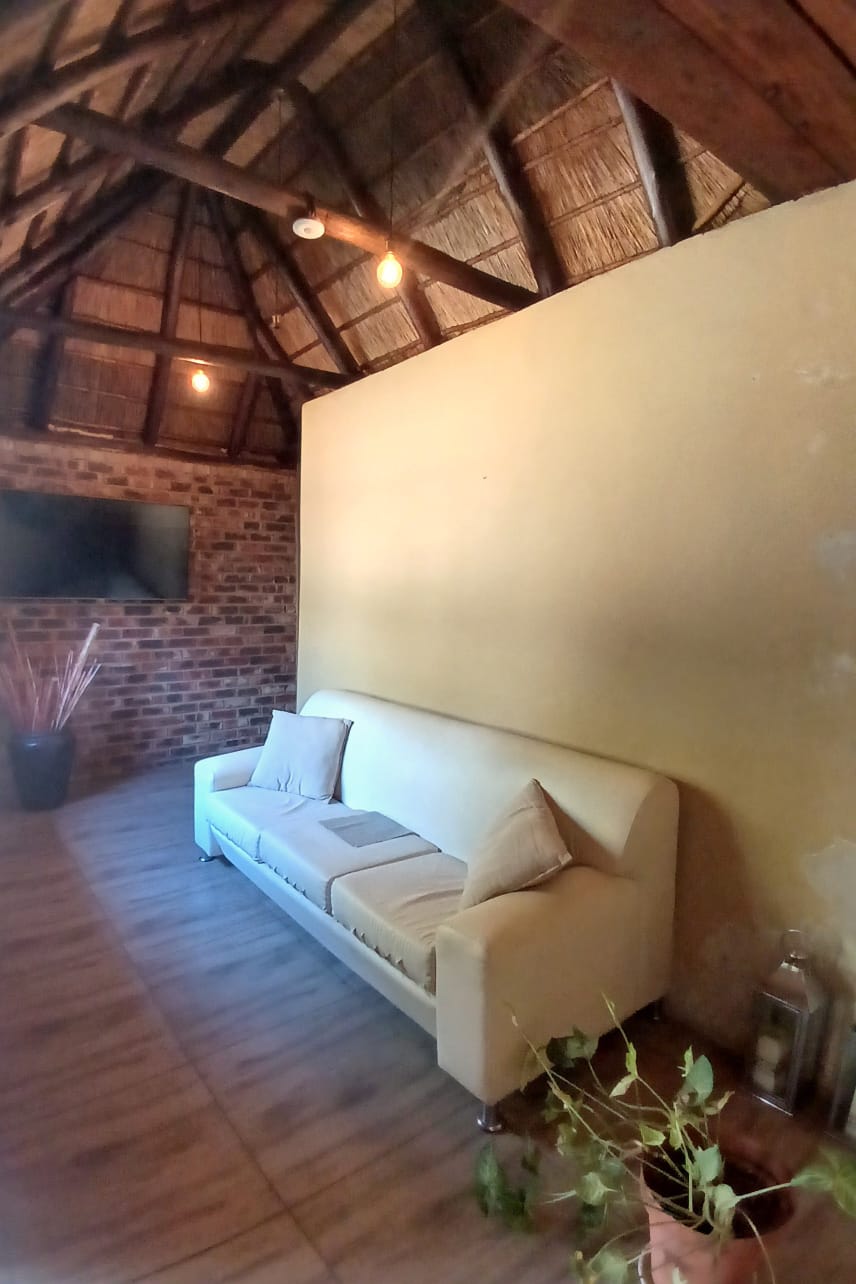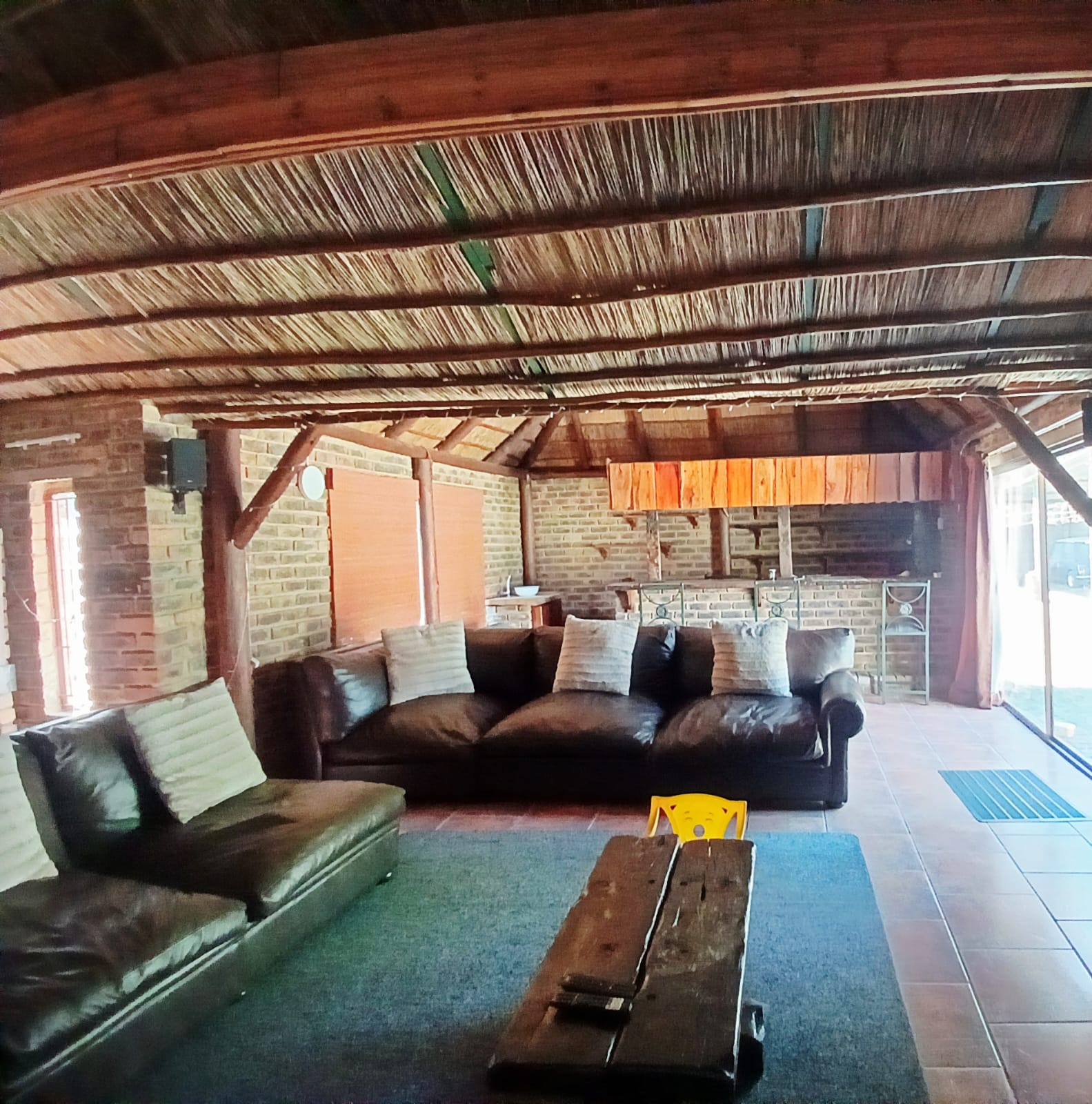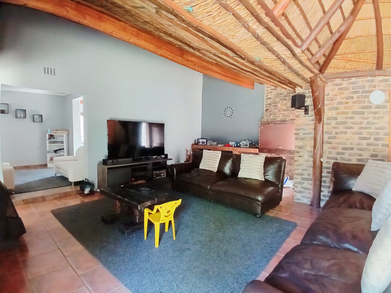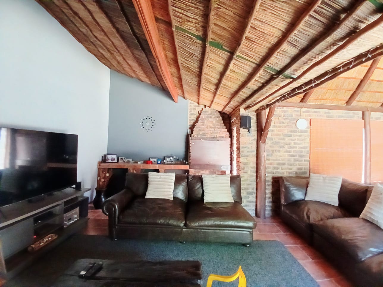 The living areas consist of a dining room, a tv room with fireplace, and an indoor braai with a built-in bar. The sliding door is leading out to the big yard.