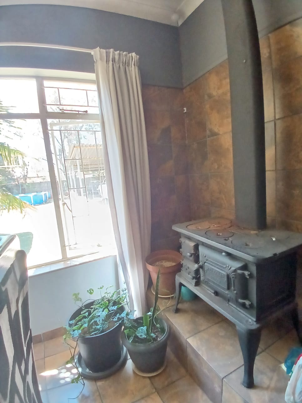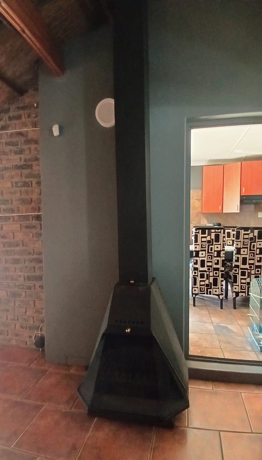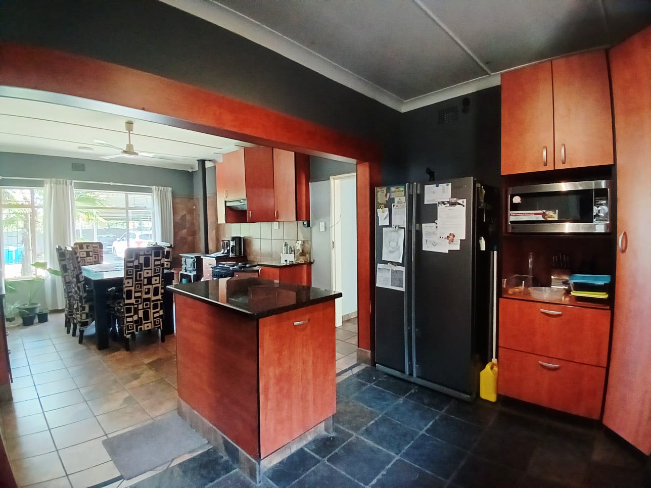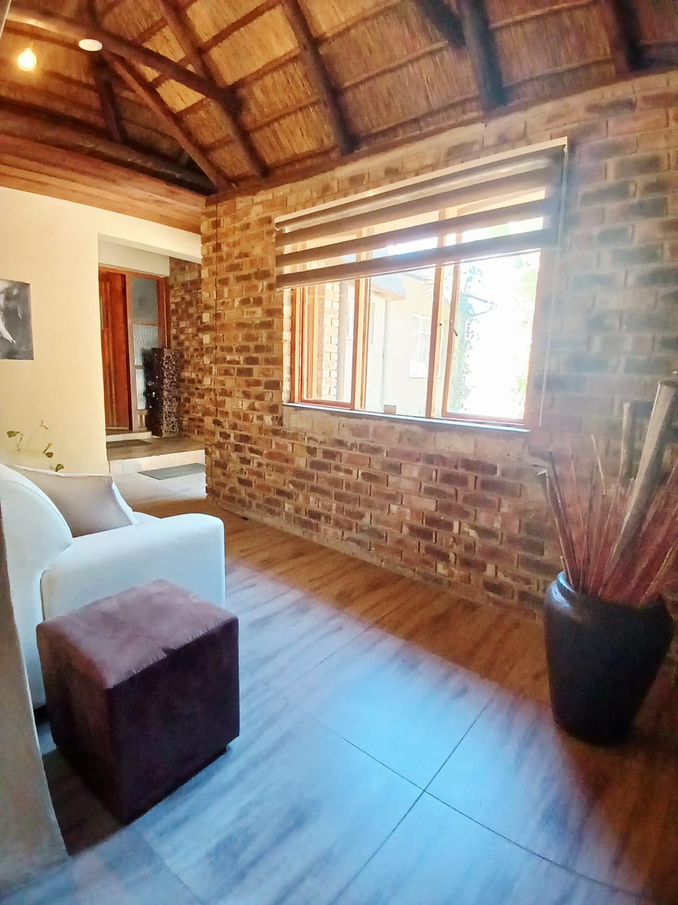 The living areas consist of a dining room, a tv room with fireplace, and an indoor braai with a built-in bar. The sliding door is leading out to the big yard.