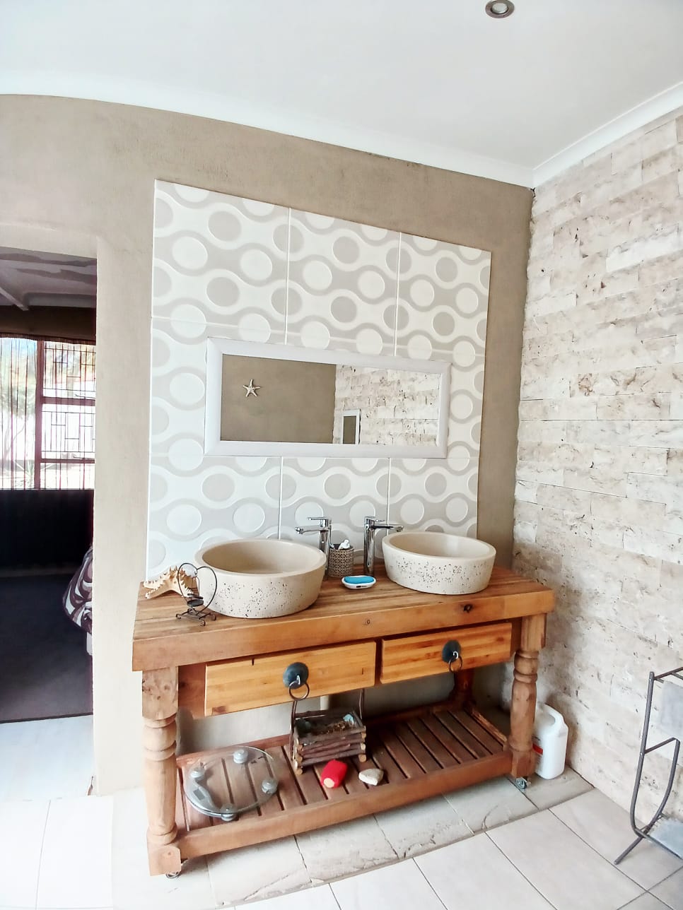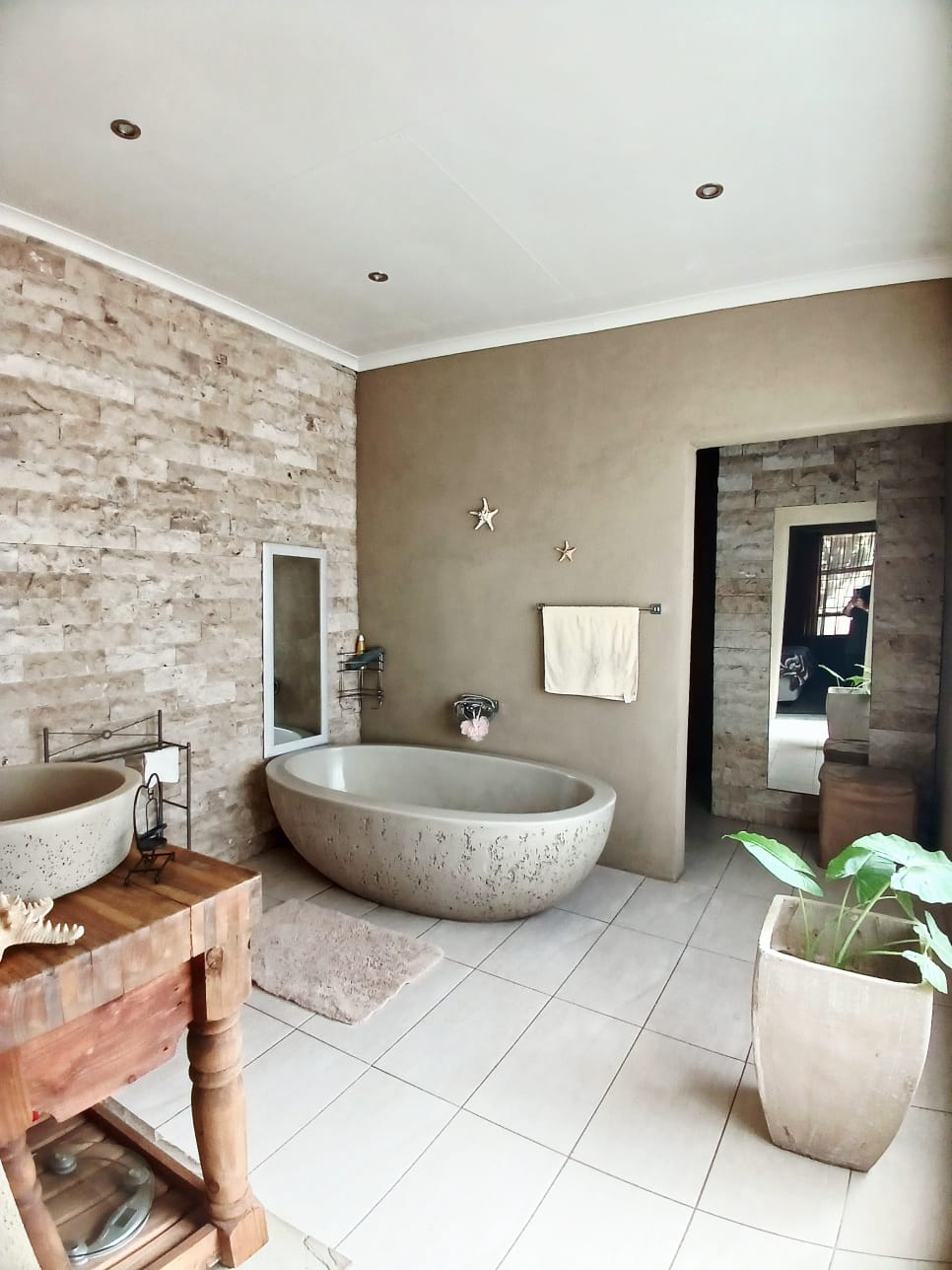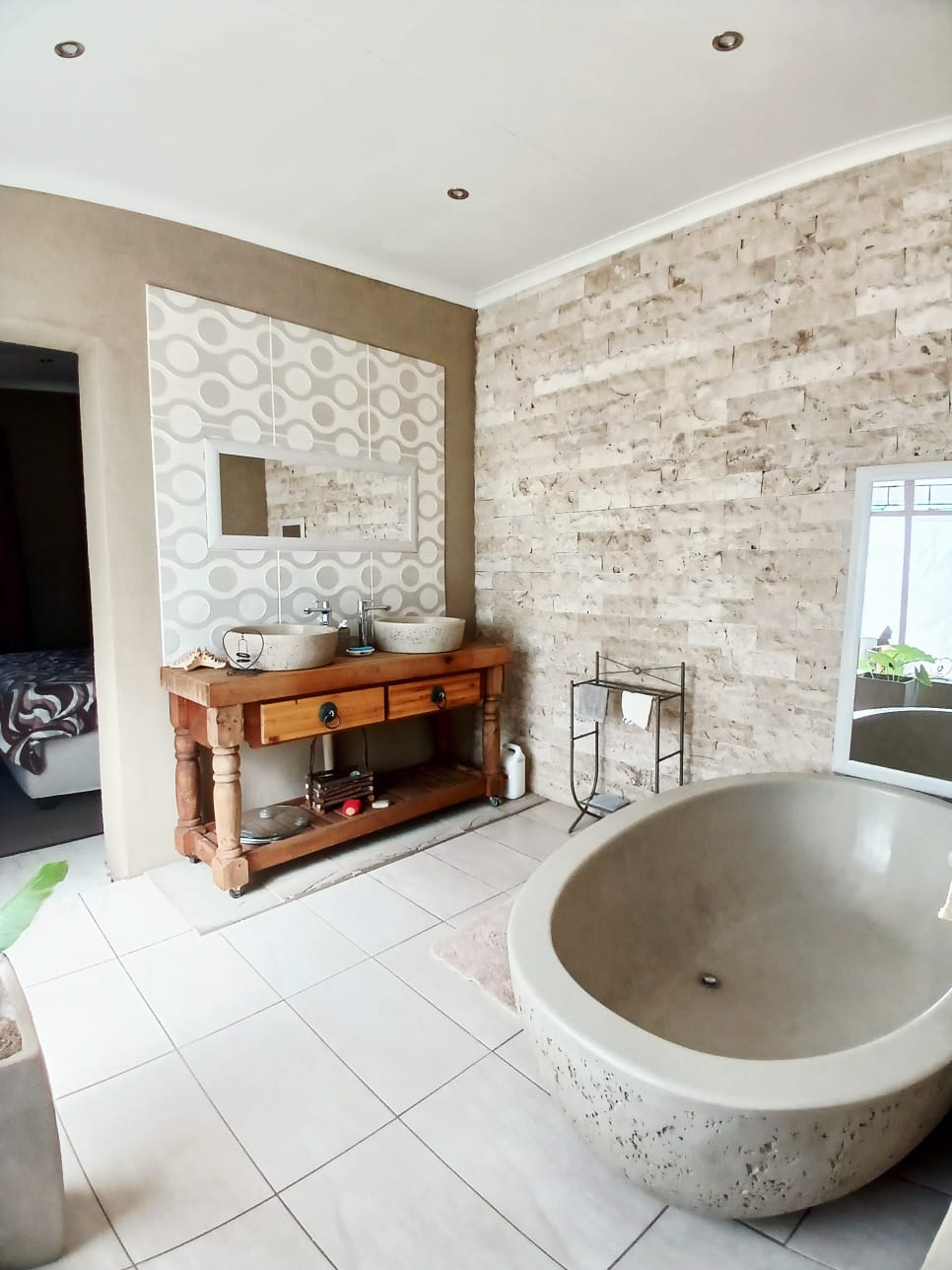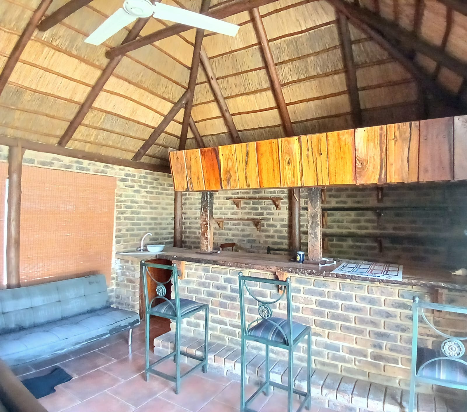 The living areas consist of a dining room, a tv room with fireplace, and an indoor braai with a built-in bar. The sliding door is leading out to the big yard.