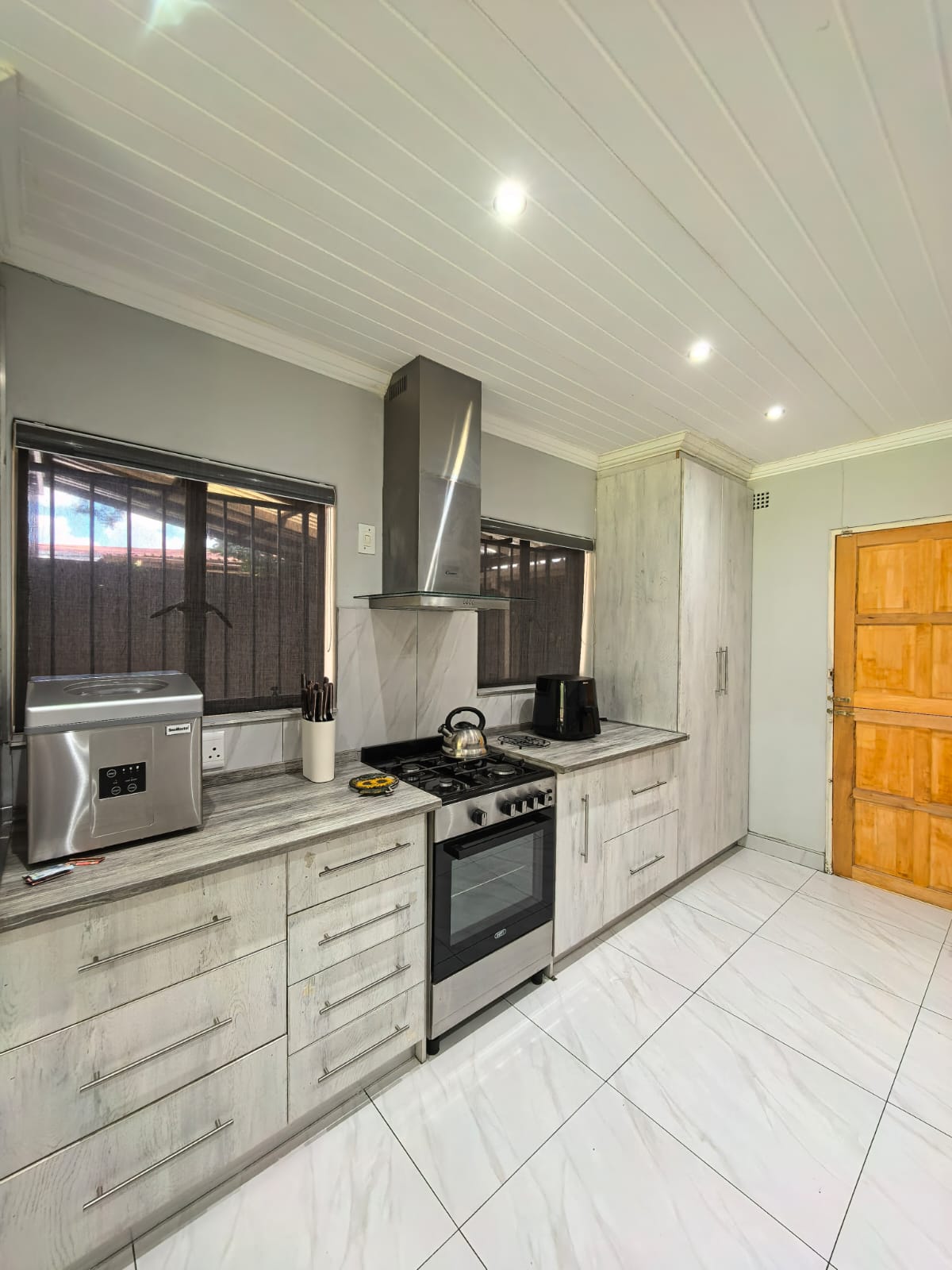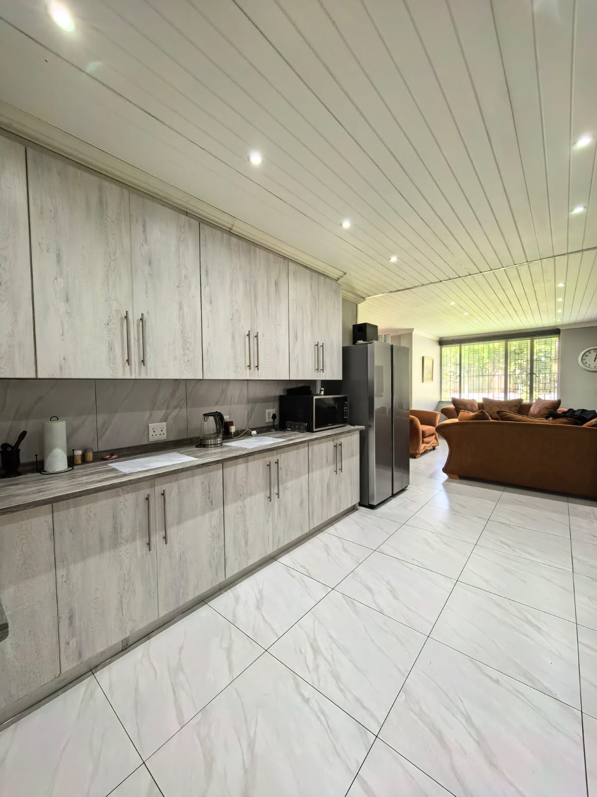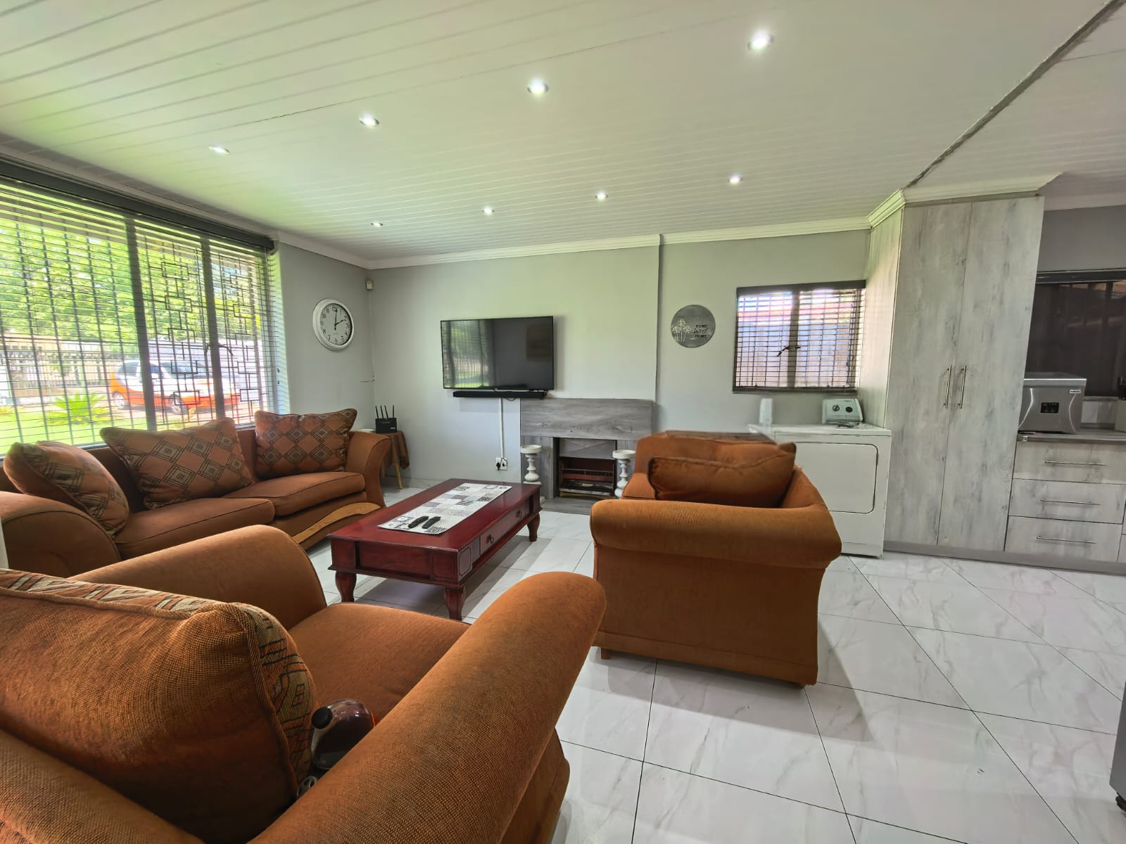 Beautiful kitchen with ample cupboard space, open plan with the lounge area with a fireplace. Entertainment area with a portable pool.
