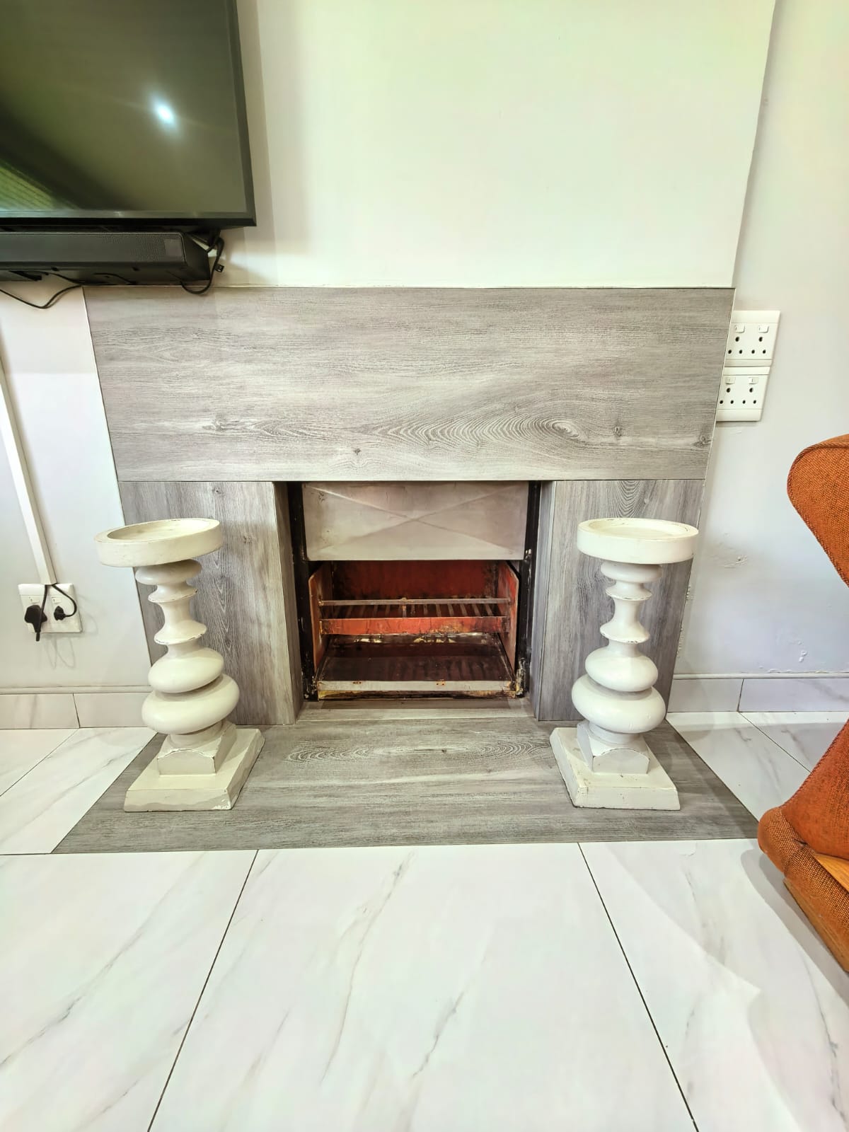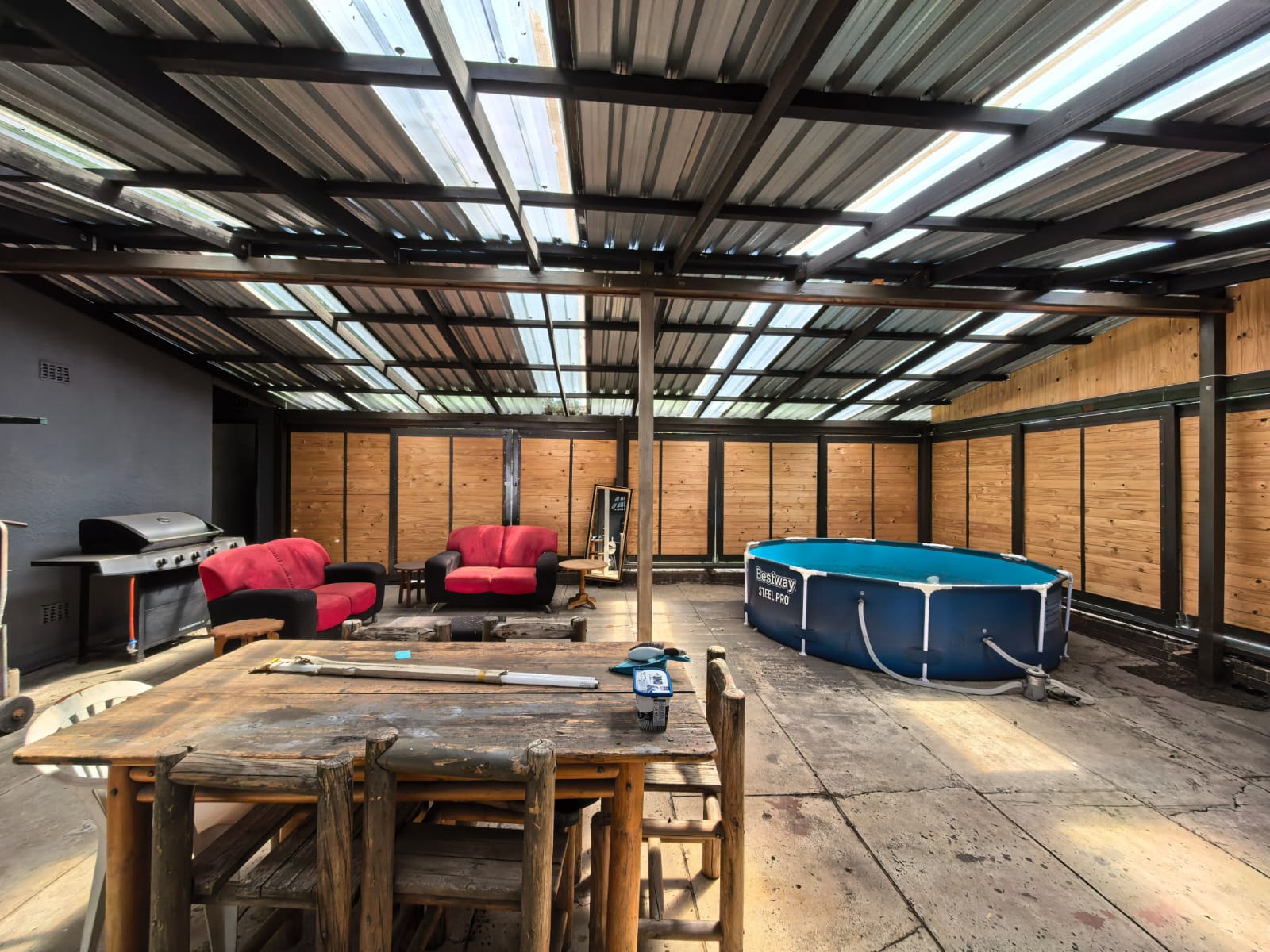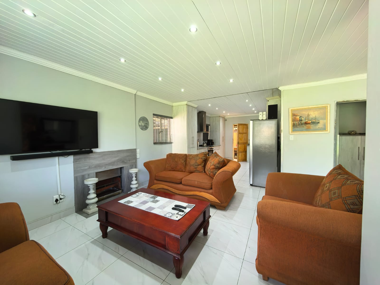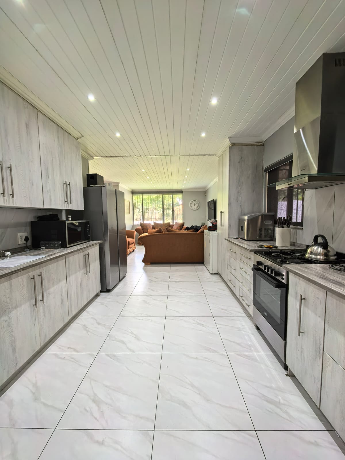 Beautiful kitchen with ample cupboard space, open plan with the lounge area with a fireplace. Entertainment area with a portable pool.