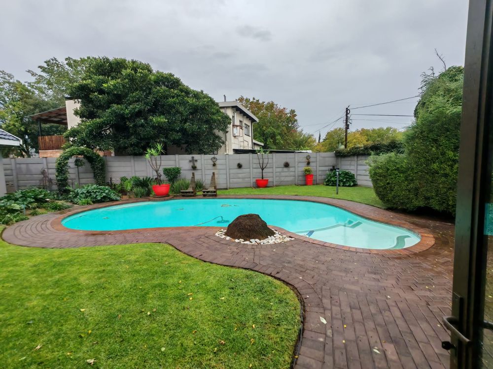 . Sparkling swimming pool with poolside seating area.