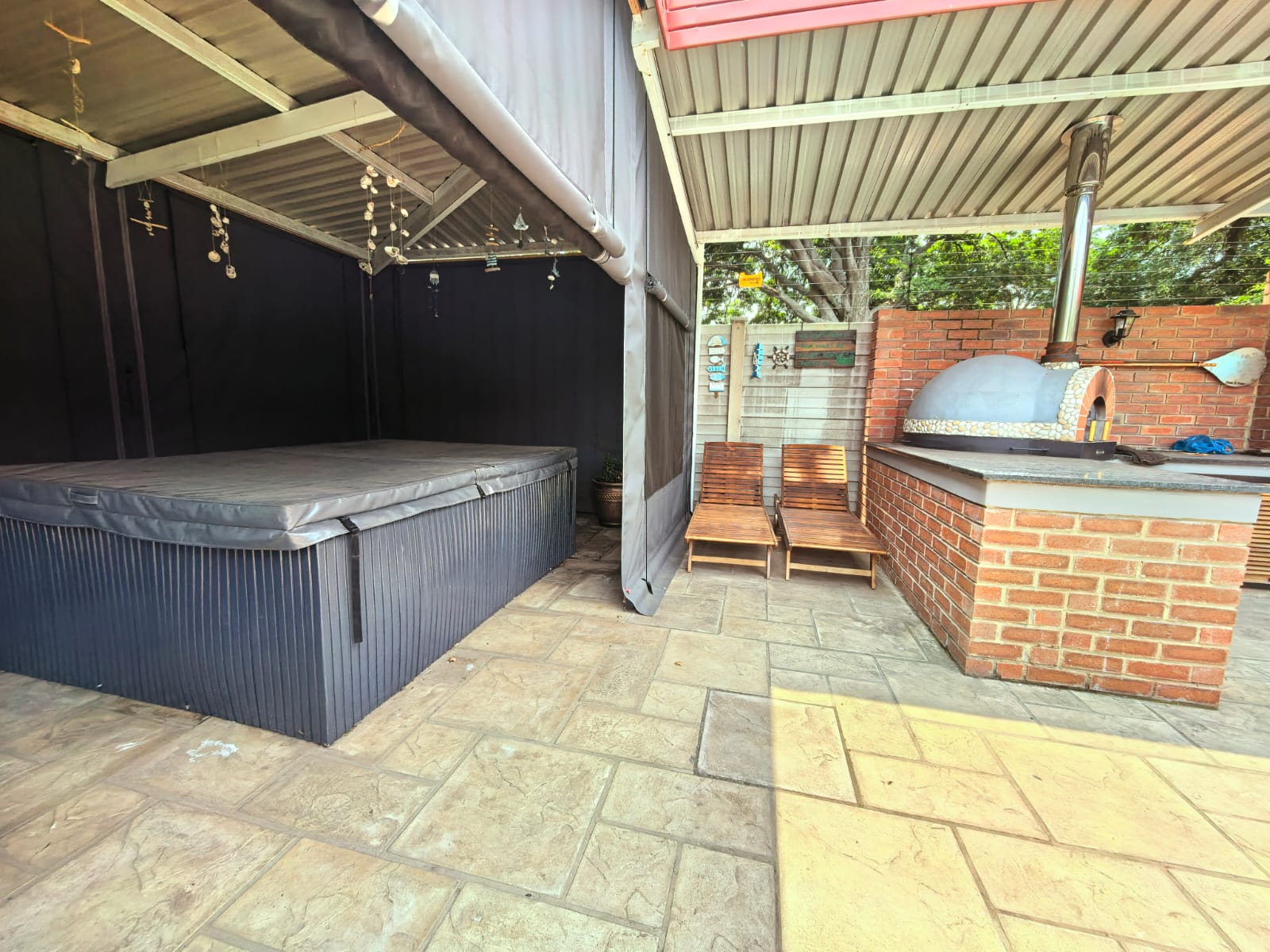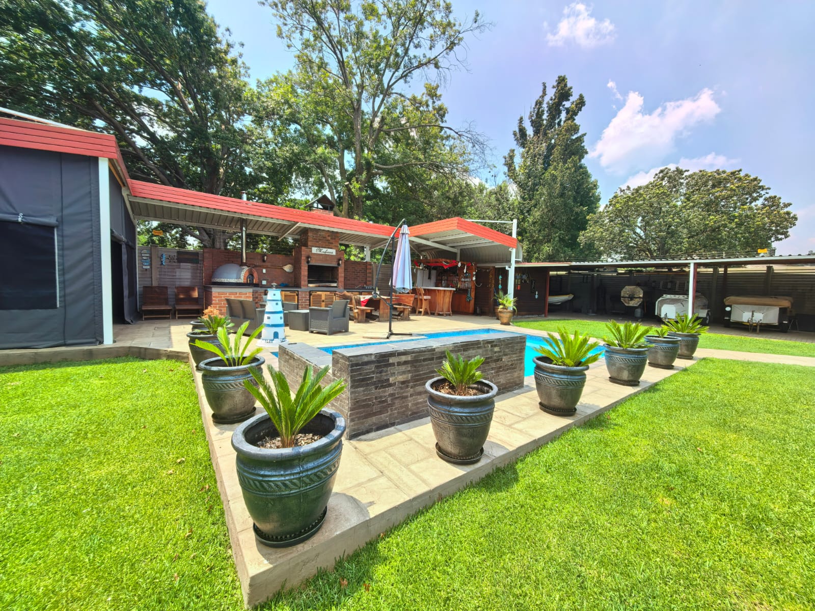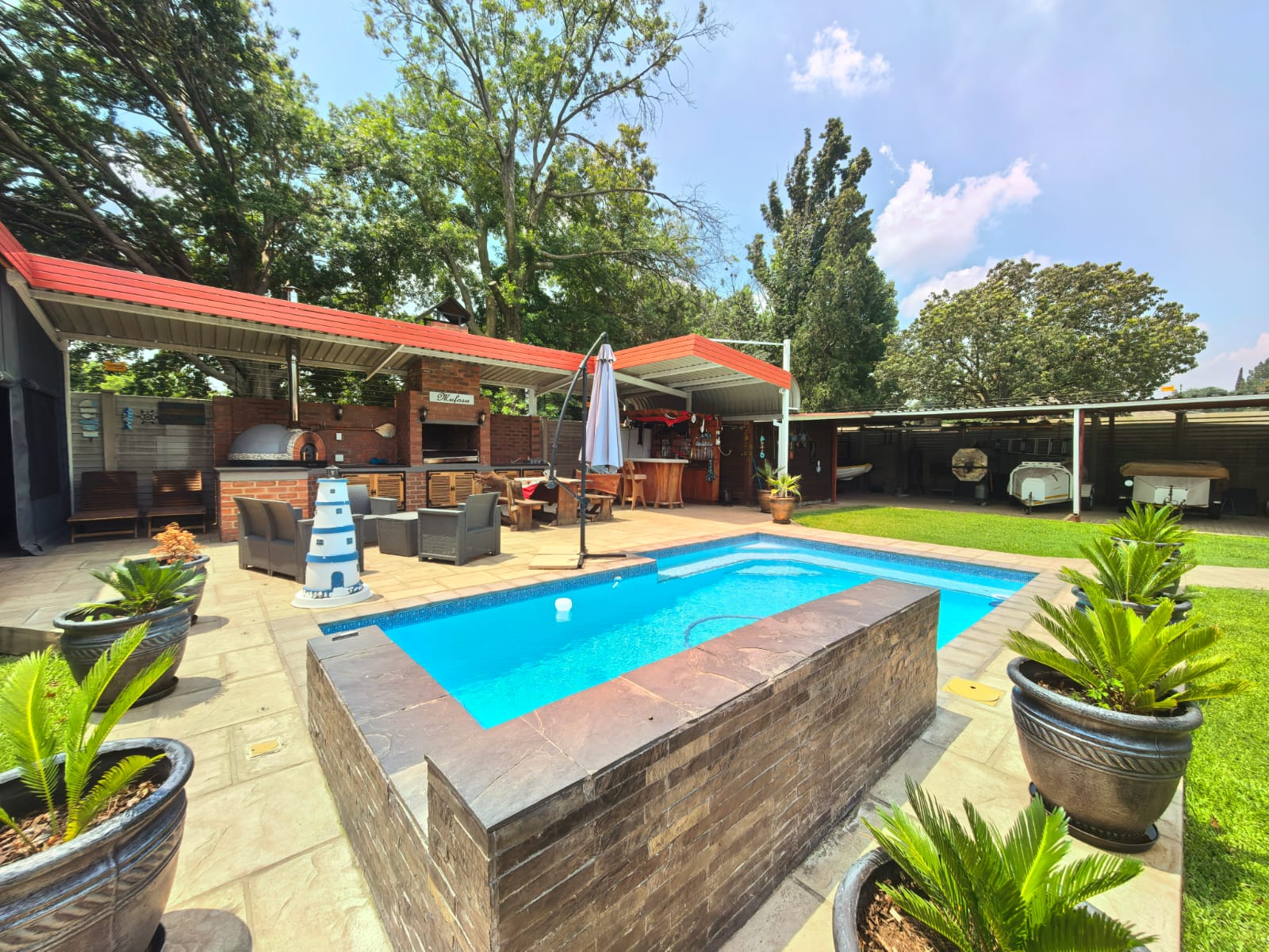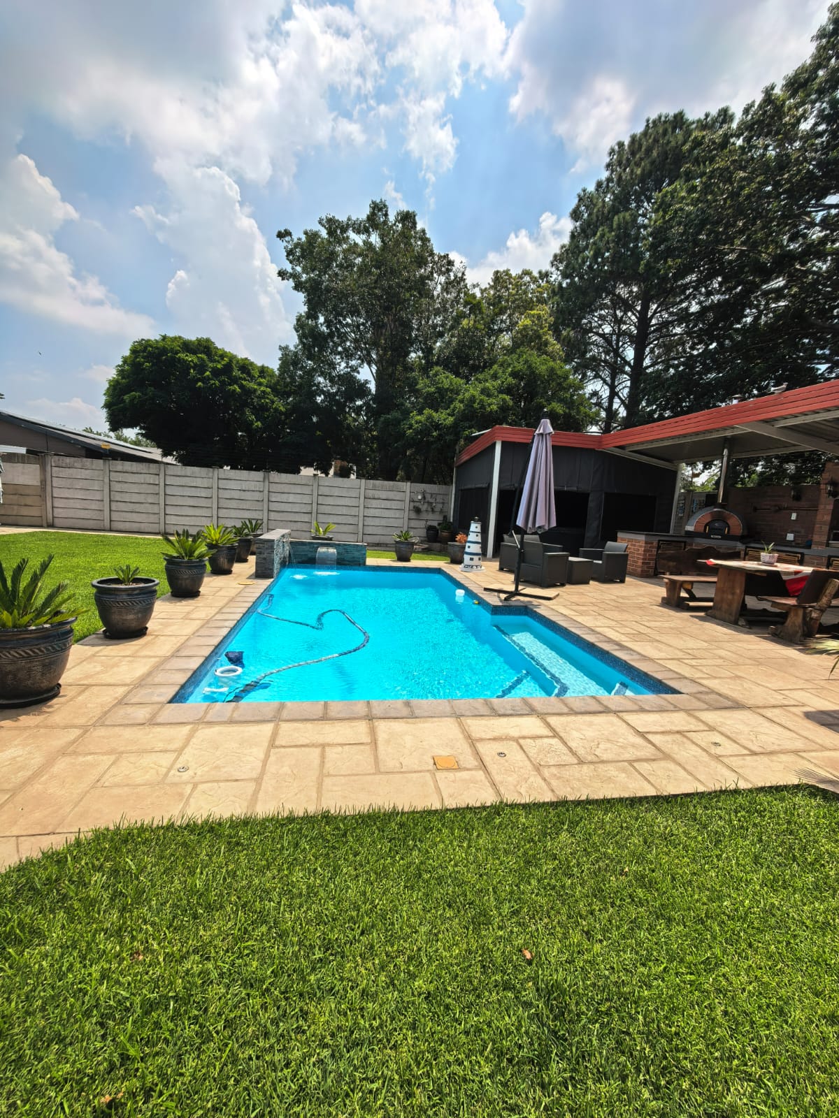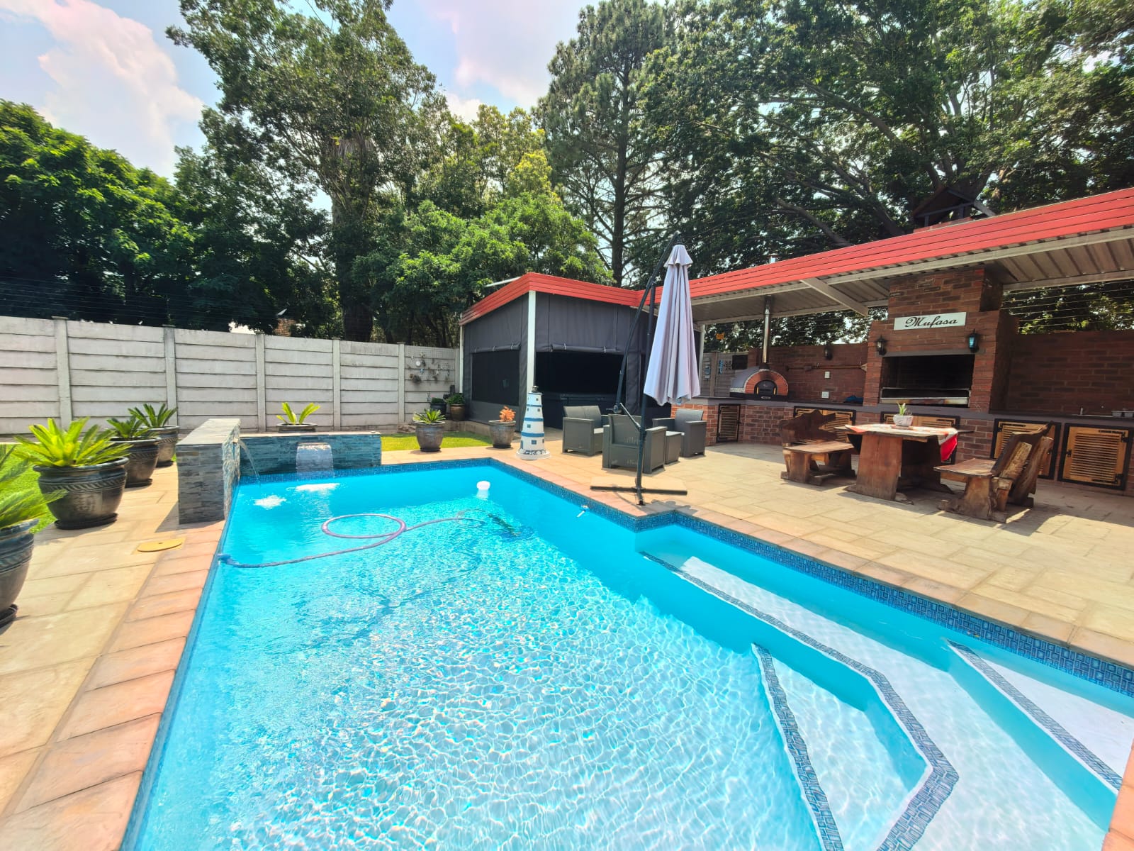 Stunning entertainment area with a built-in braai, built-in bar, pizza oven, a 10 seater jacuzzi, and a lovely sparkling swimming pool. Big yard with a borehole and sprinkler system.