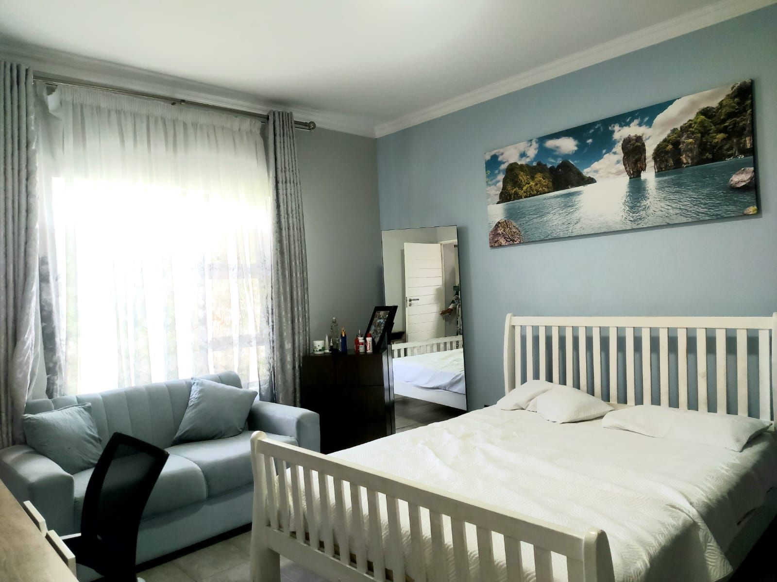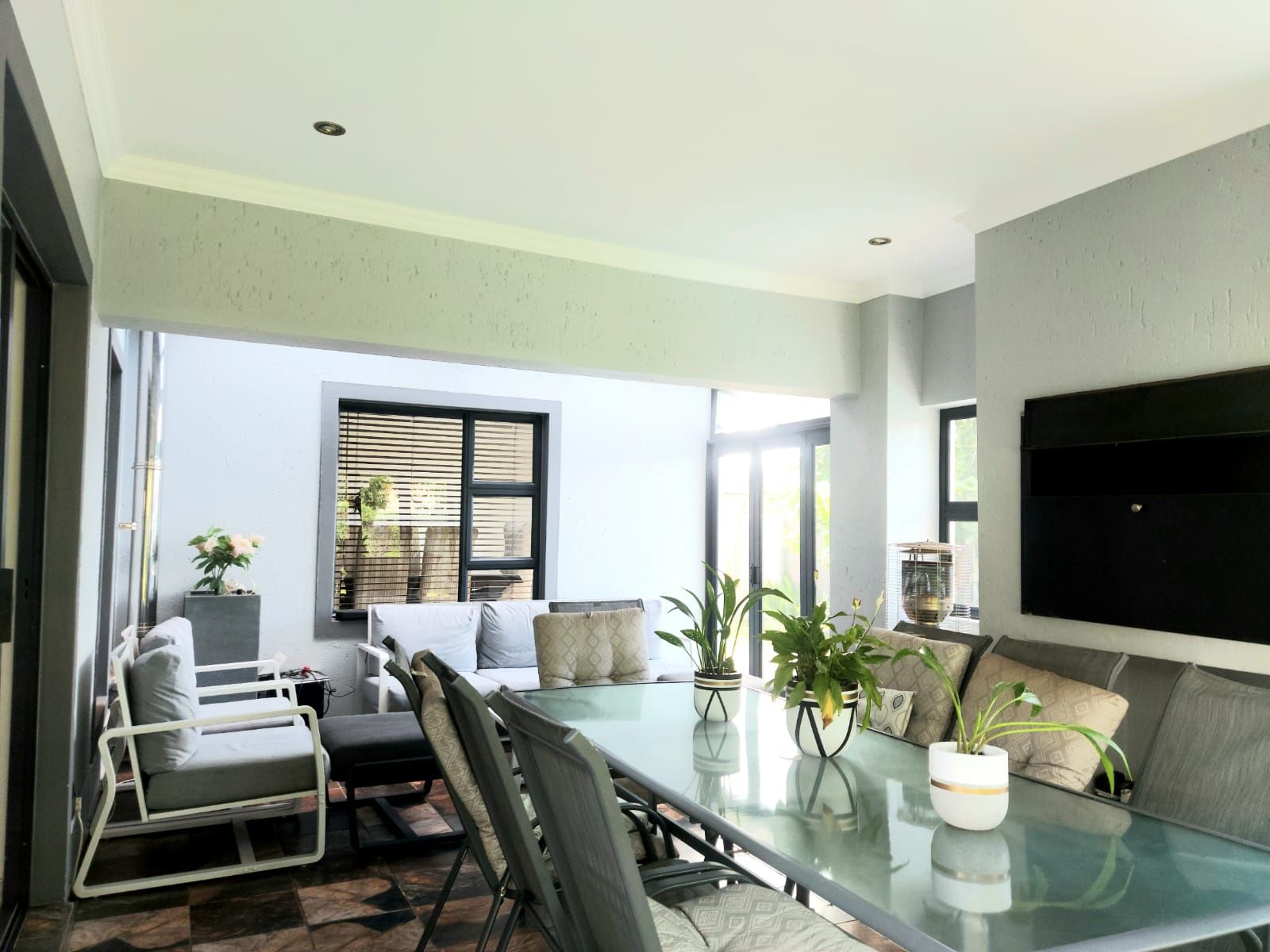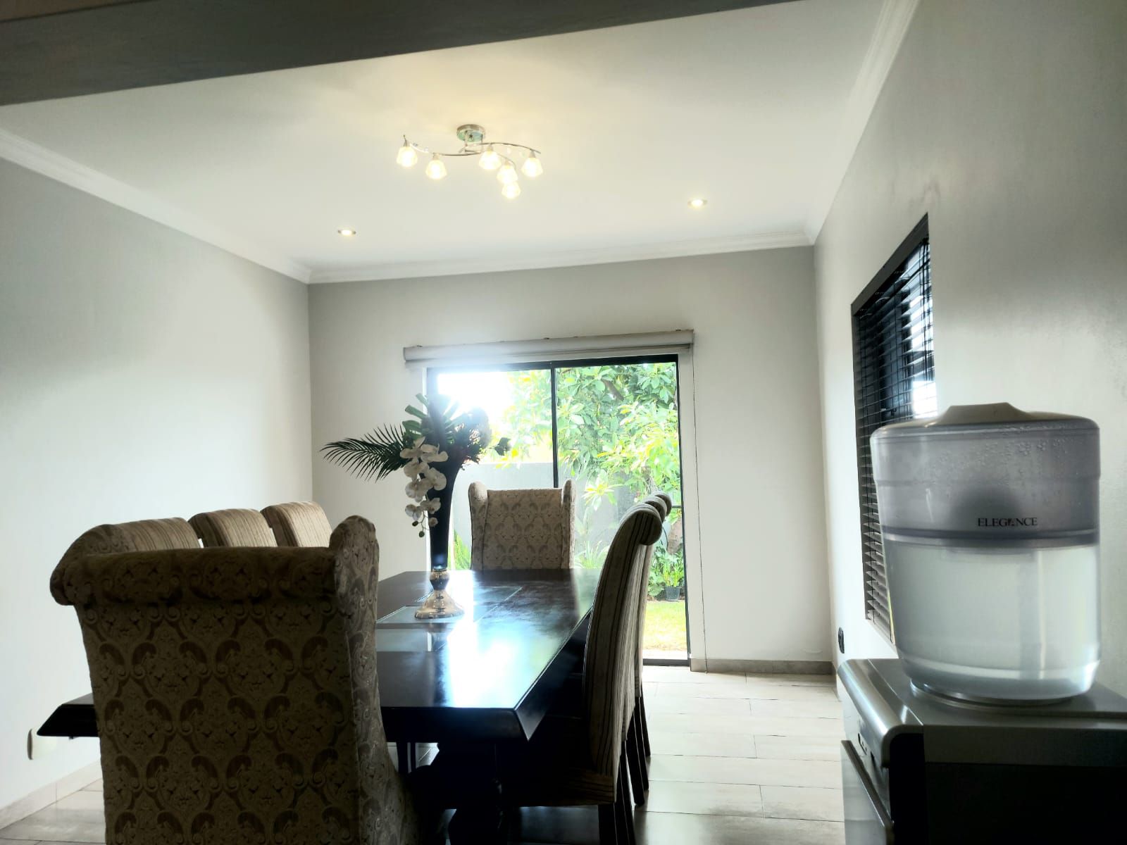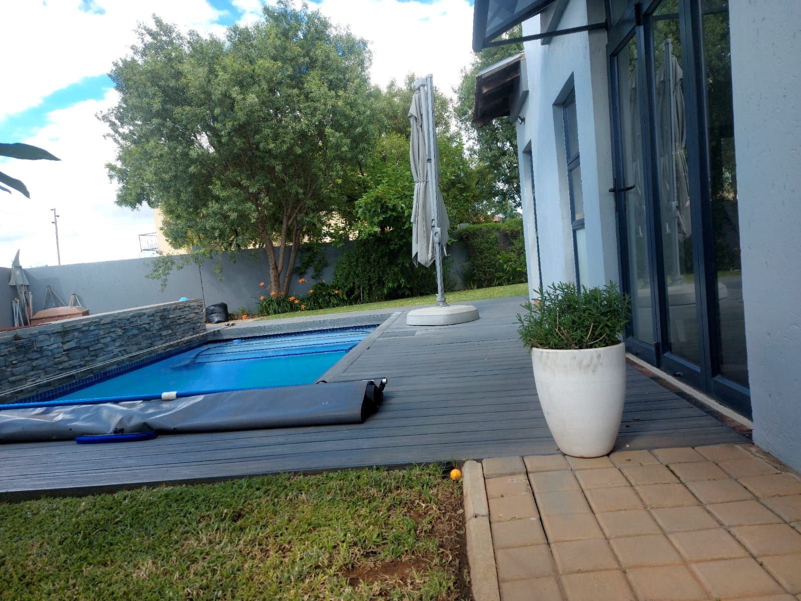An enclosed patio with a built-in braai provides the perfect setting for year-round entertaining, overlooking a sparkling swimming pool and an immaculate, well-maintained garden. Upstairs, the home features five generously sized bedrooms. The luxurious main bedroom includes a walk-in closet and a full en-suite bathroom. Two additional bedrooms share a full bathroom, while a private office offers an ideal work-from-home space. The fifth bedroom, with its own en-suite bathroom, is perfectly suited as staff quarters or guest accommodation.
