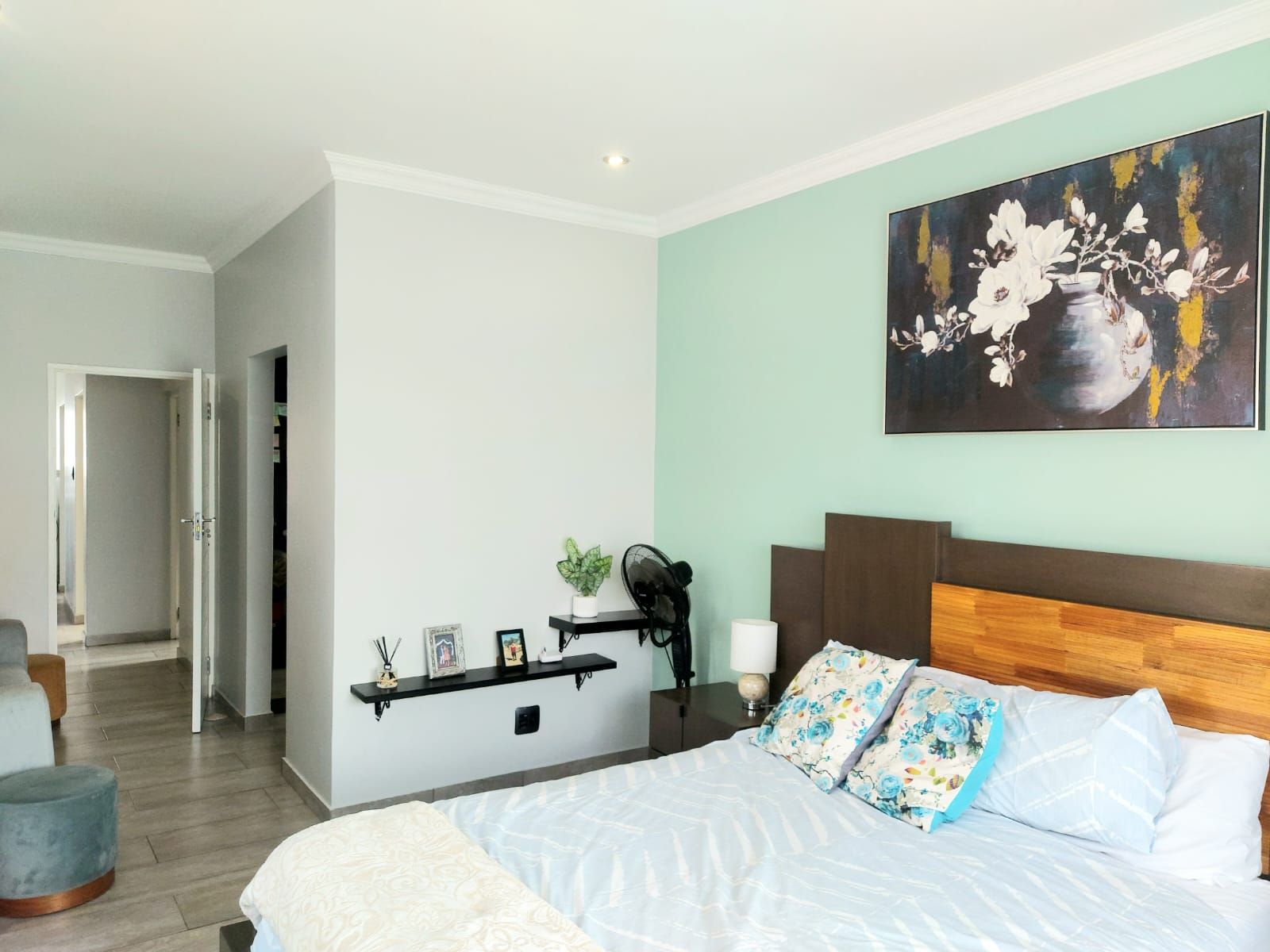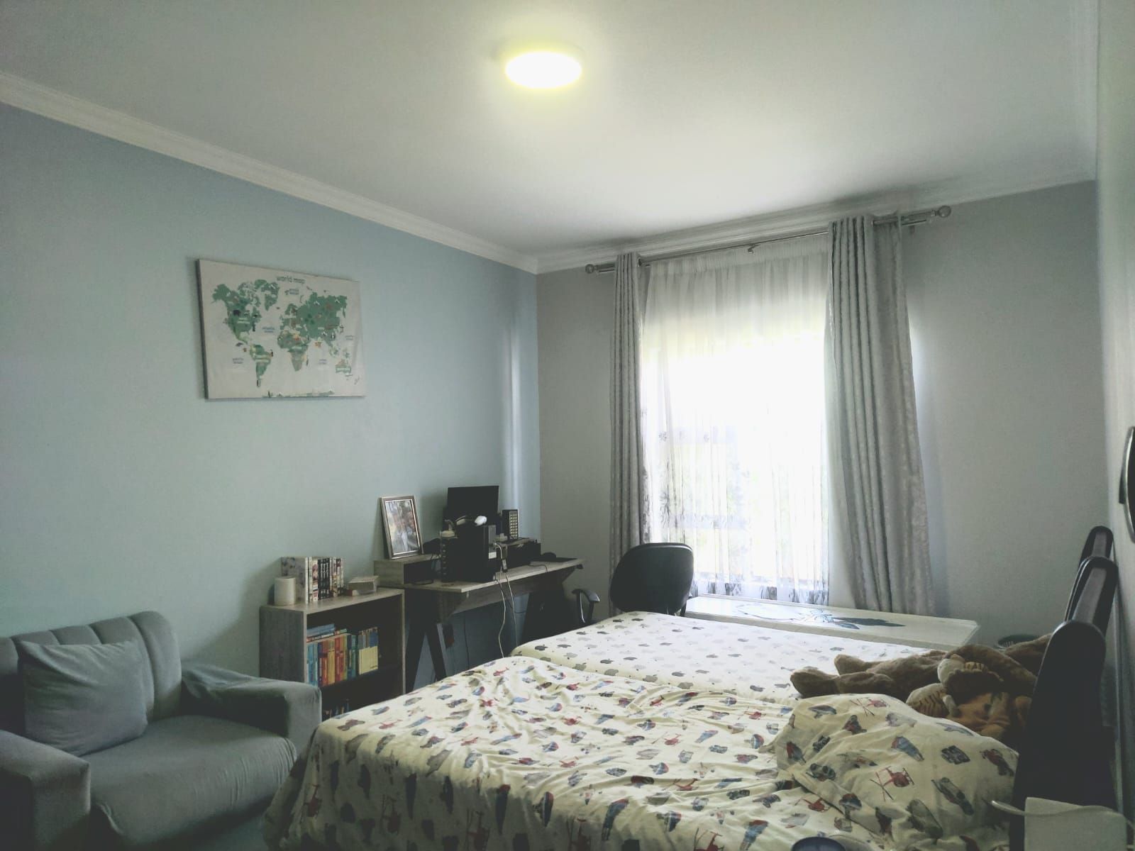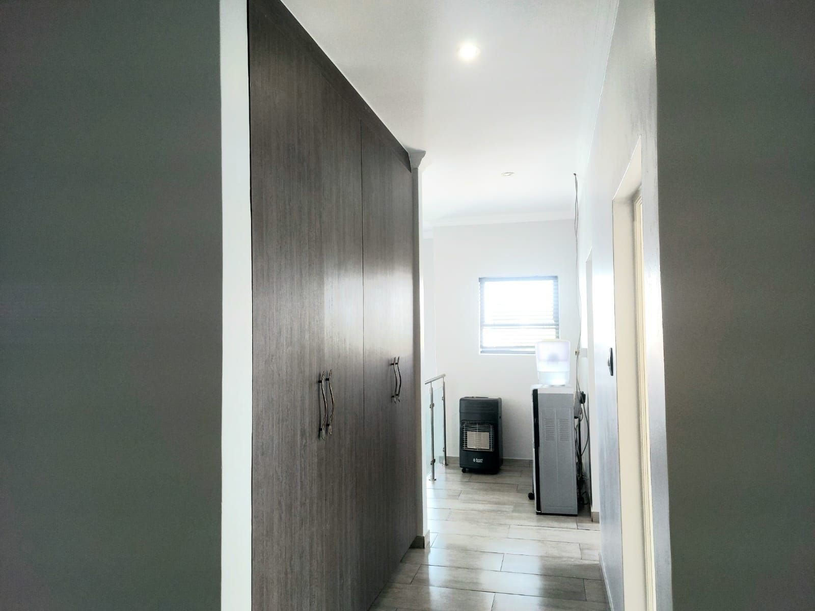 An enclosed patio with a built-in braai provides the perfect setting for year-round entertaining, overlooking a sparkling swimming pool and an immaculate, well-maintained garden. Upstairs, the home features five generously sized bedrooms. The luxurious main bedroom includes a walk-in closet and a full en-suite bathroom. Two additional bedrooms share a full bathroom, while a private office offers an ideal work-from-home space. The fifth bedroom, with its own en-suite bathroom, is perfectly suited as staff quarters or guest accommodation.