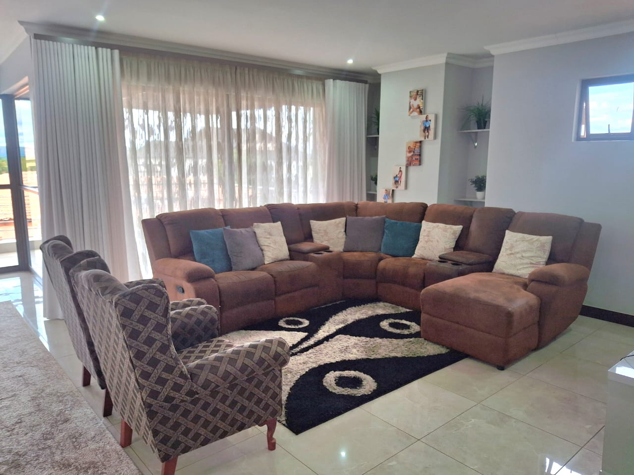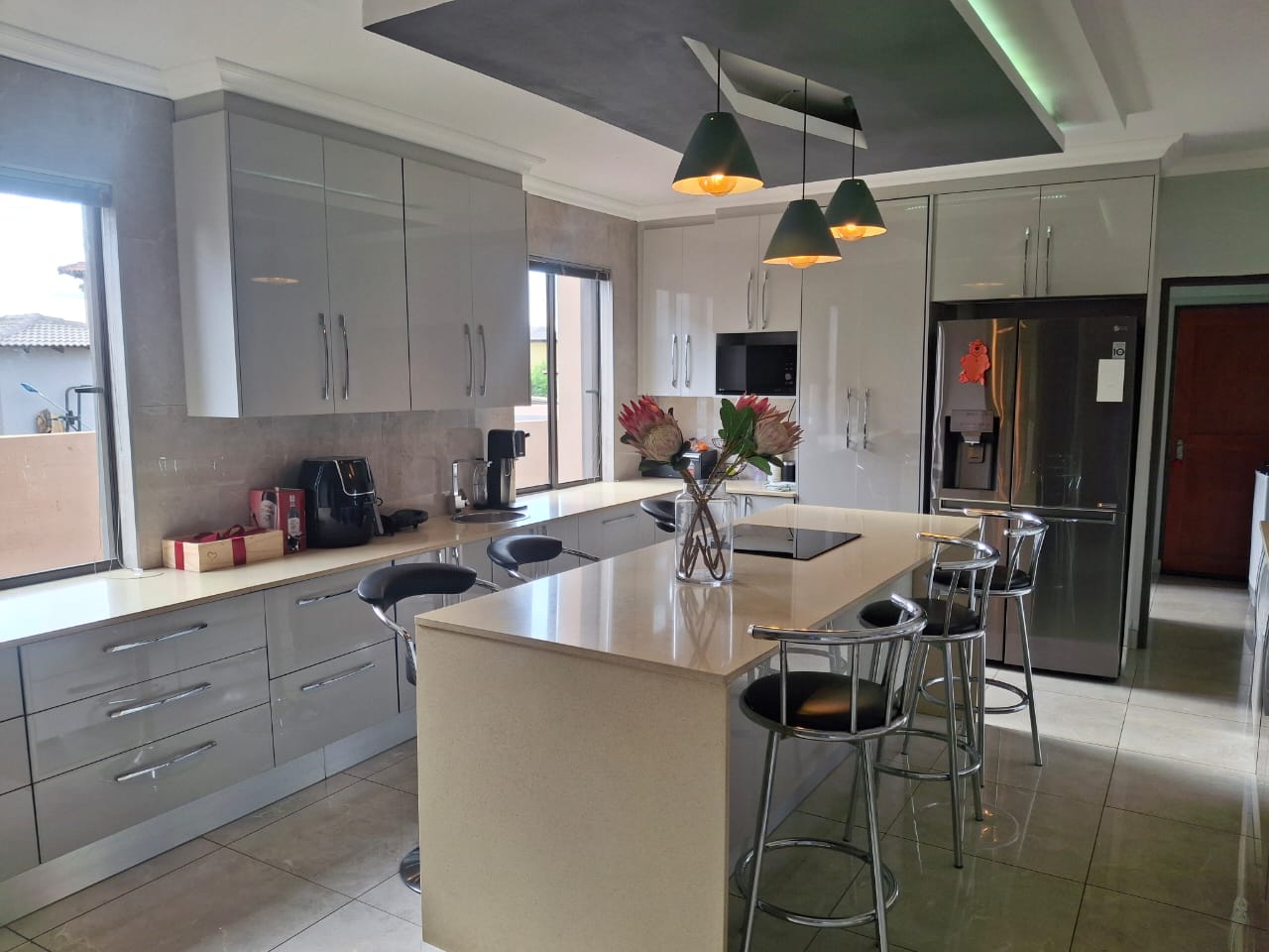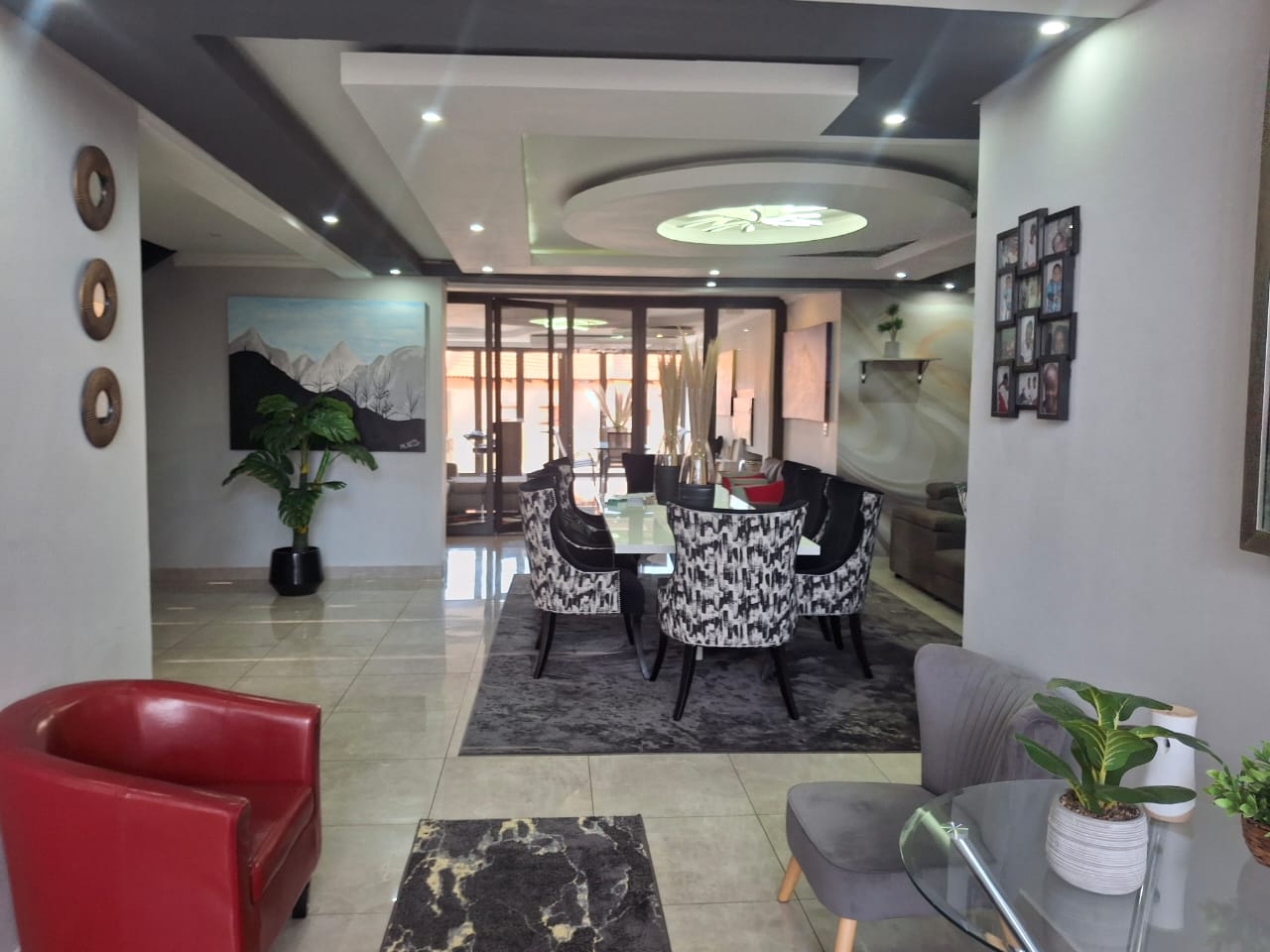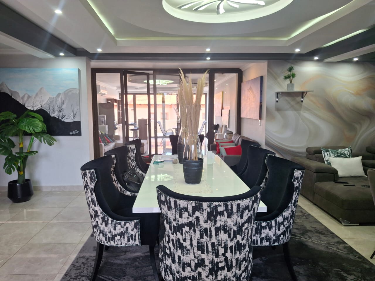 The entrance flows seamlessly into a stunning open-plan dining area and an expansive TV lounge, ideal for both relaxed family living and stylish entertaining. A well-positioned guest bedroom and guest toilet add convenience, while the elegant kitchen, complete with a scullery, blends functionality with timeless design.