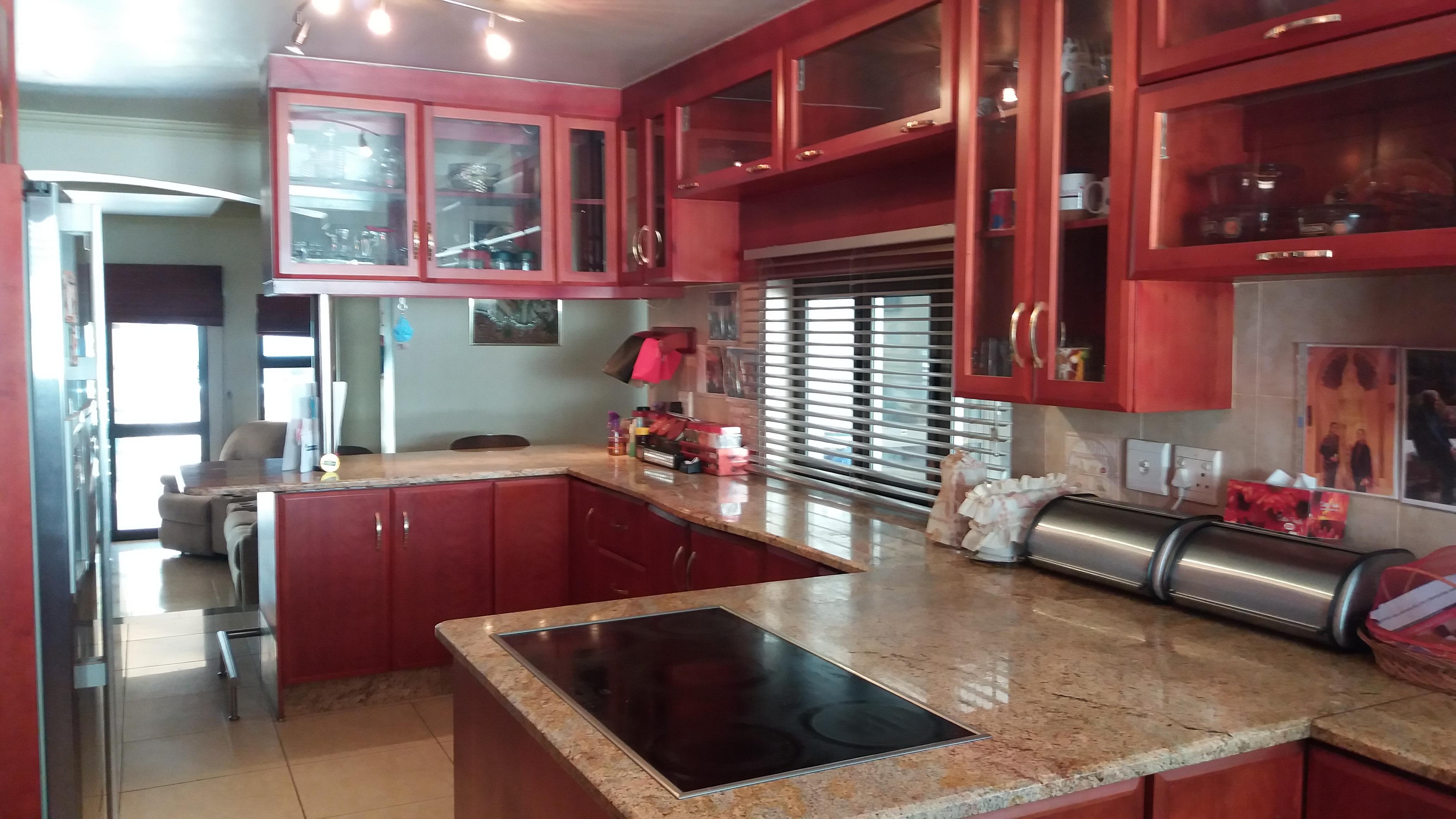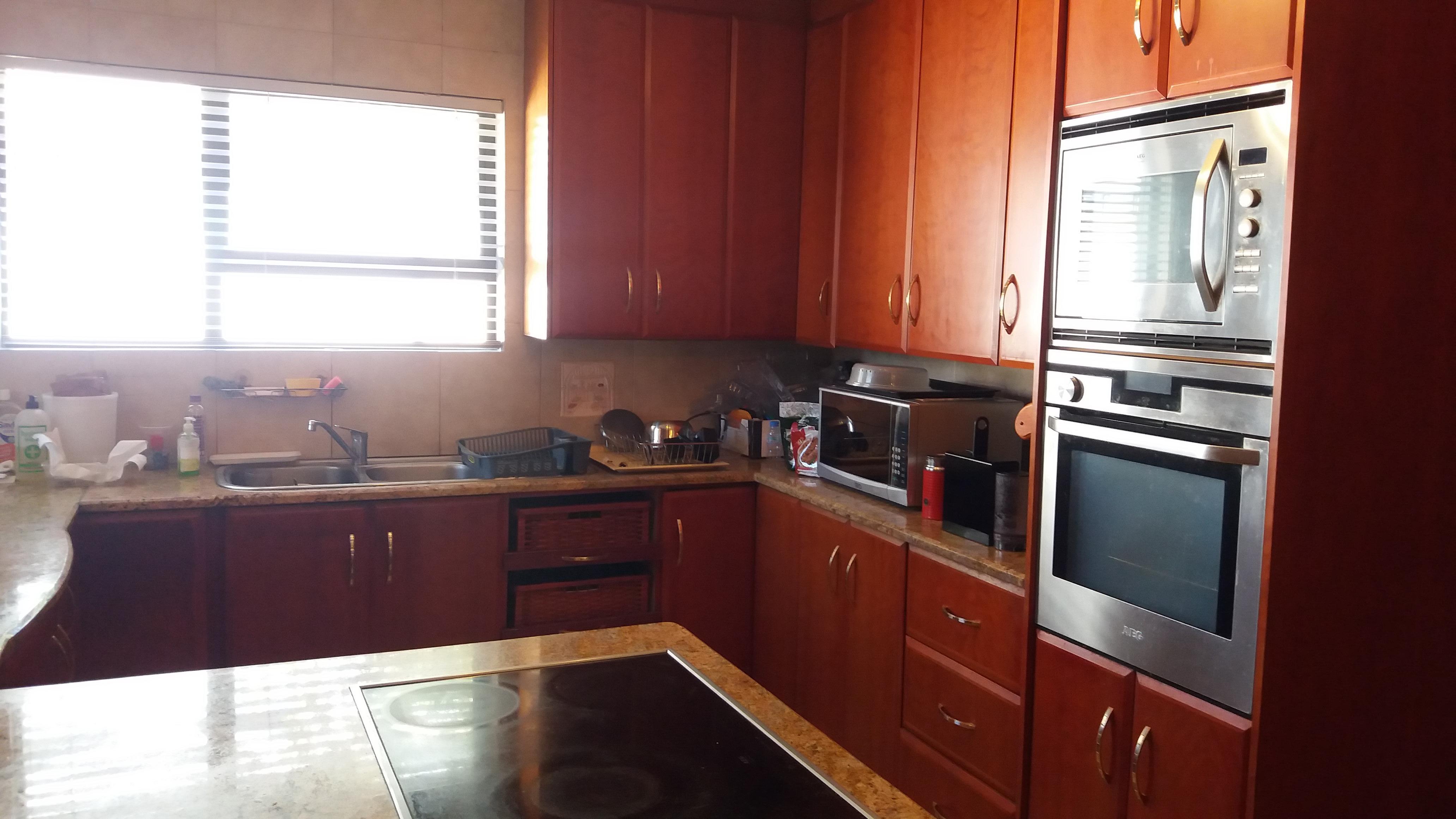Spacious kitchen, with an electric stove/oven, granite countertops throughout the kitchen with a walk-in pantry and loads of cupboard and counter space. The scullery has space for 2 undercounter appliances, a 2-plate gas stove and loads of cupboard space. Scullery opens onto the back courtyard.