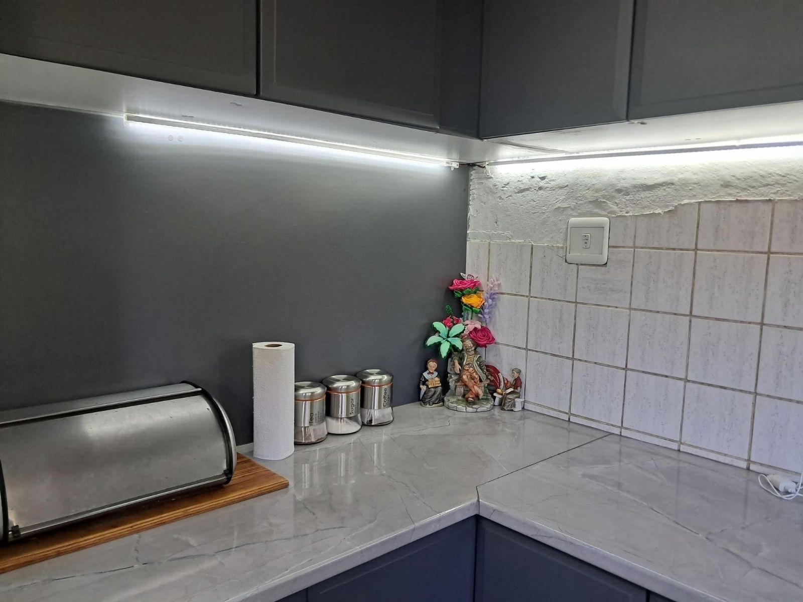 Modern kitchen with sleek post-form countertops, loads of cupboard space, and open-plan flow into the air-conditioned lounge/dining area