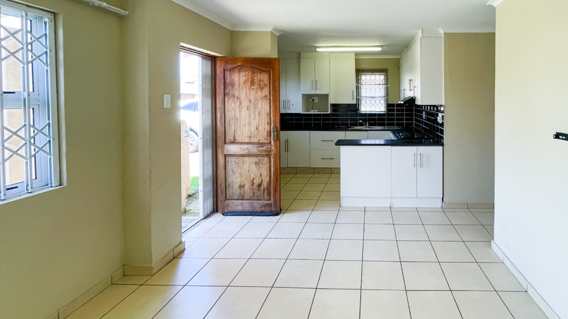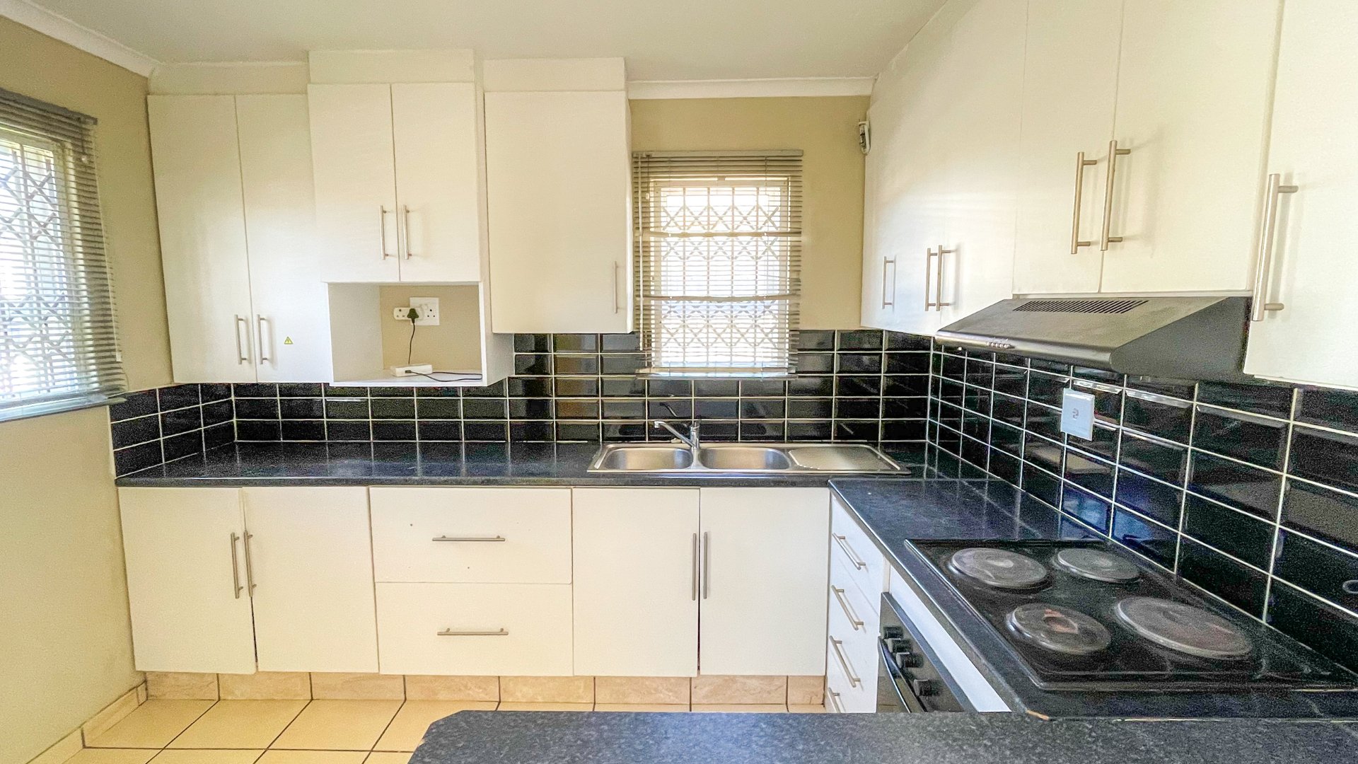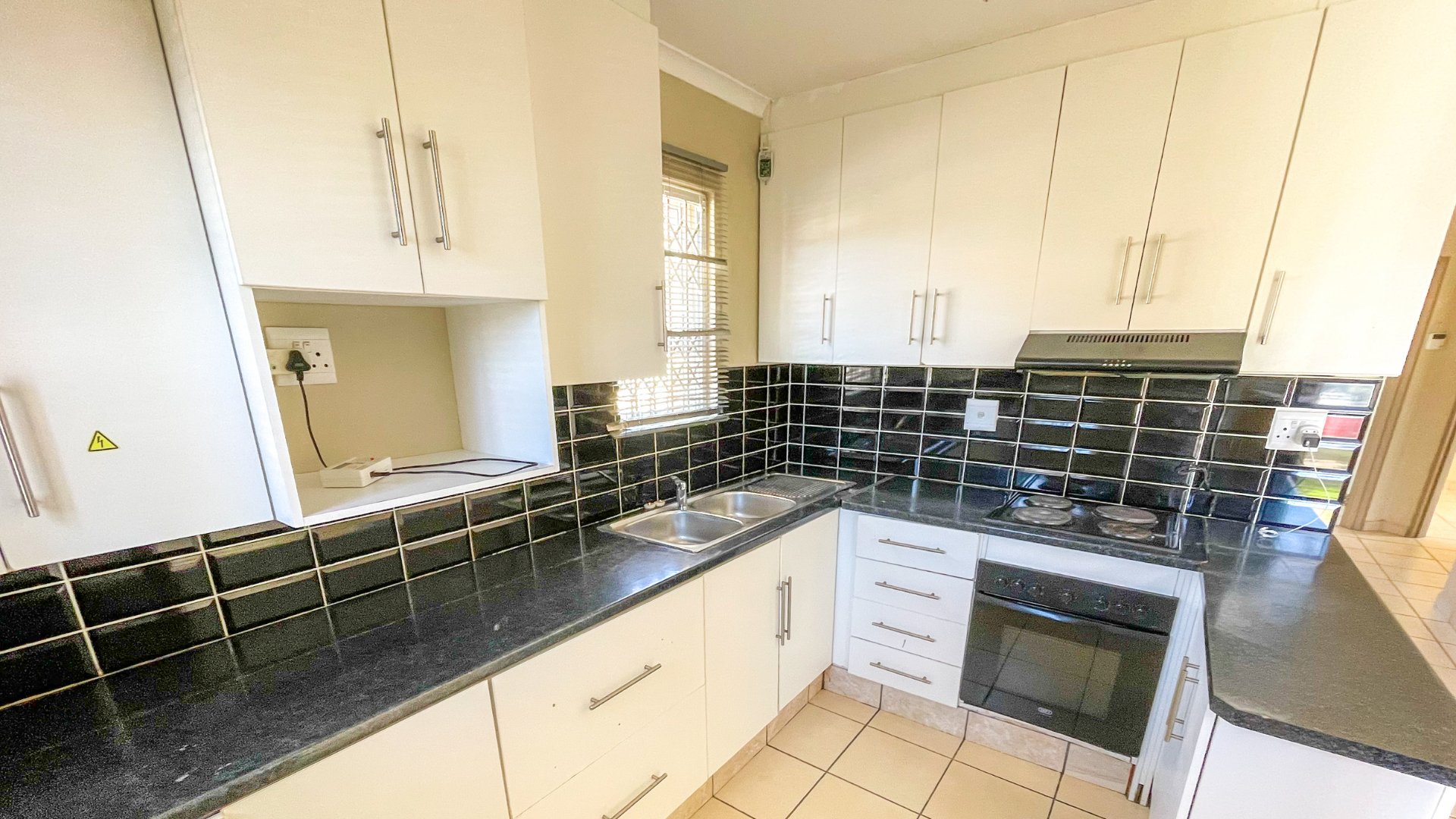 Step through the glass sliders from the brick-secured carport and you’re welcomed into a bright, tiled living area that flows into a modern fully fitted open plan kitchen. With its electric hob, under-counter oven, extractor fan, and sleek cabinetry, the kitchen is both functional and inviting.