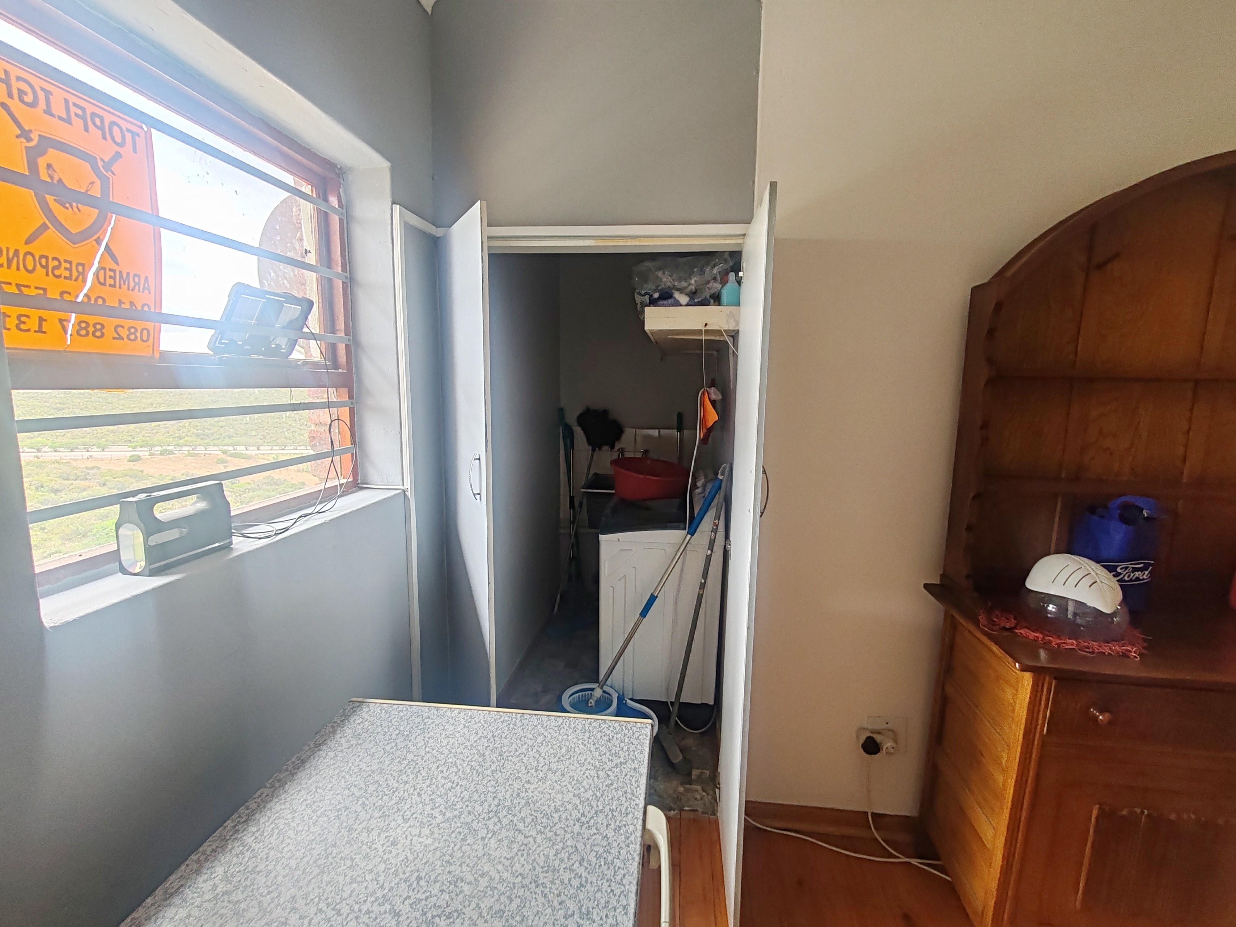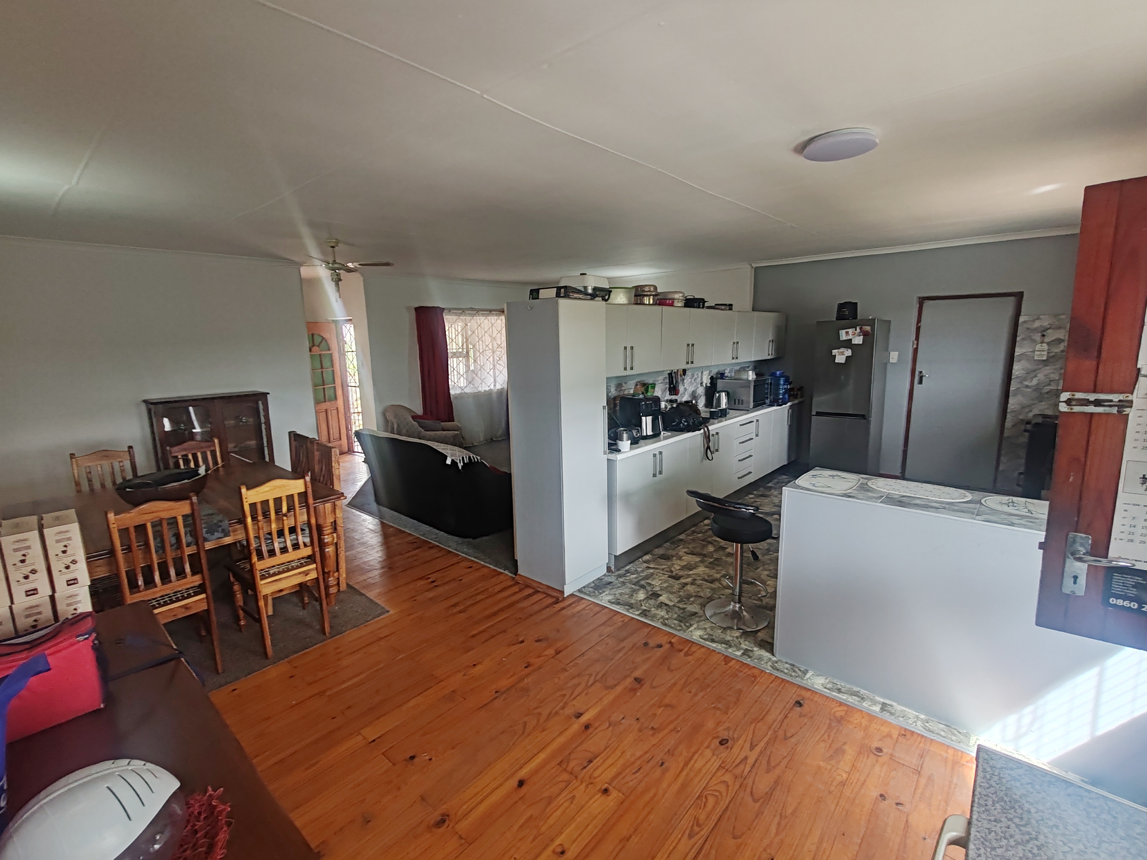 The kitchen leads out to a stoep with a built-in braai area, ideal for entertaining. A double tandem garage provides direct access into the kitchen for added convenience. The property is also equipped with a 1,500L JoJo water tank which is connected to the property.