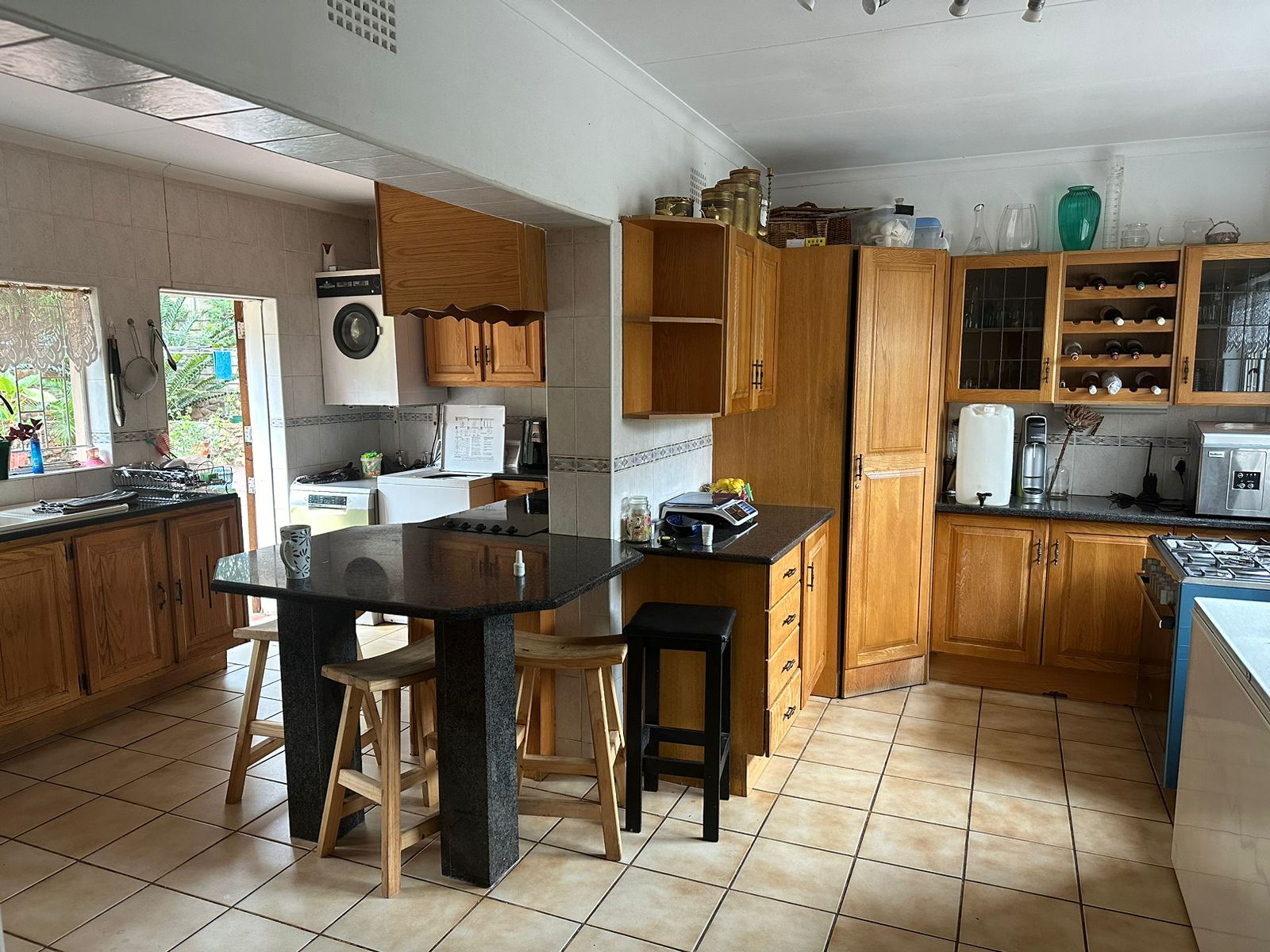 The kitchen is well-equipped with granite countertops, ample yellow wood cabinetry, a pantry, and generous space for all your appliances — a dream setup for any cooking enthusiast.