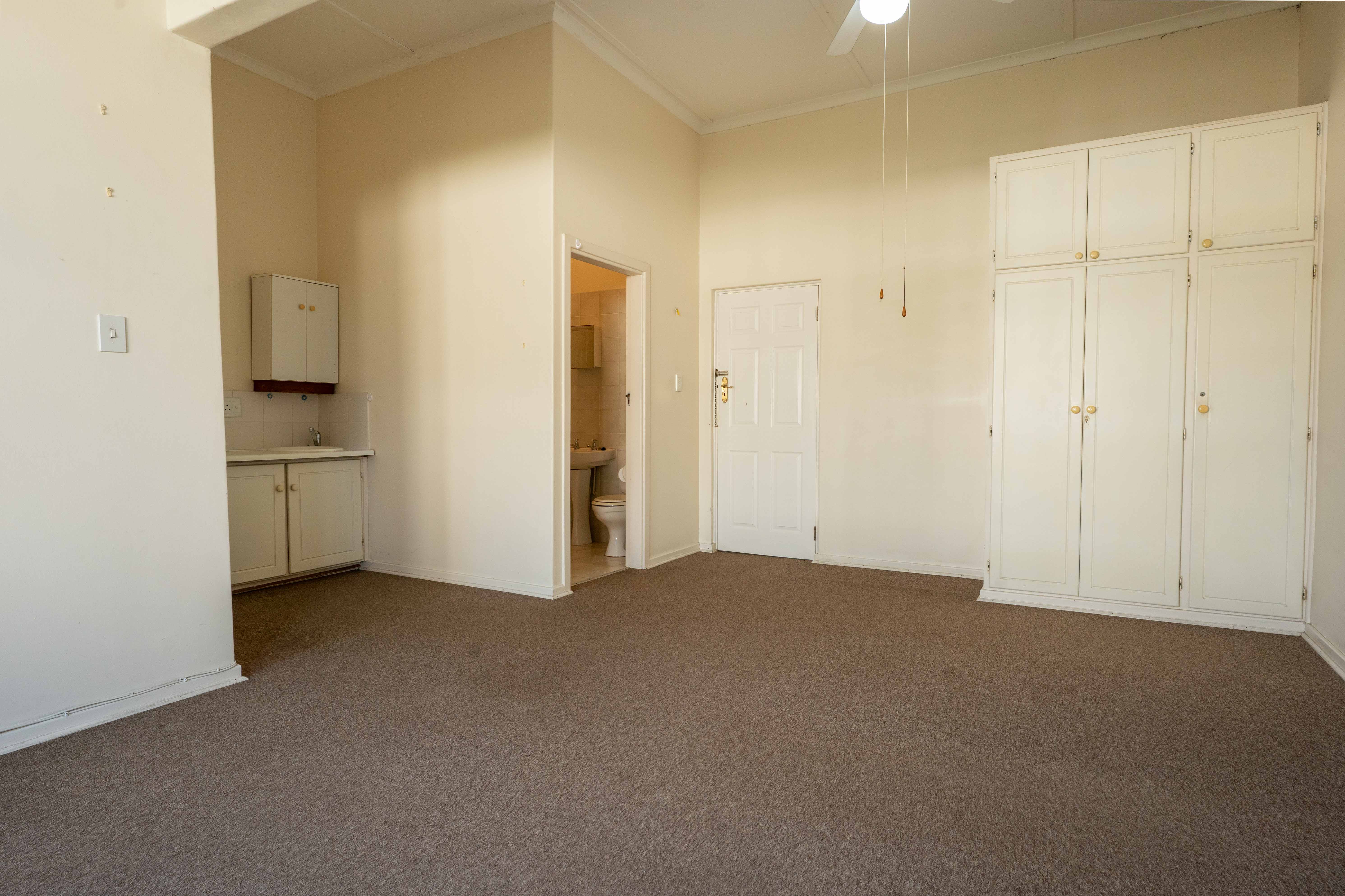 The apartment itself is sunny and spacious, with soft carpets underfoot, a cooling air conditioner for warm days, and large windows that invite in streams of natural light. An en-suite bathroom and a compact kitchenette provide convenience and independence.