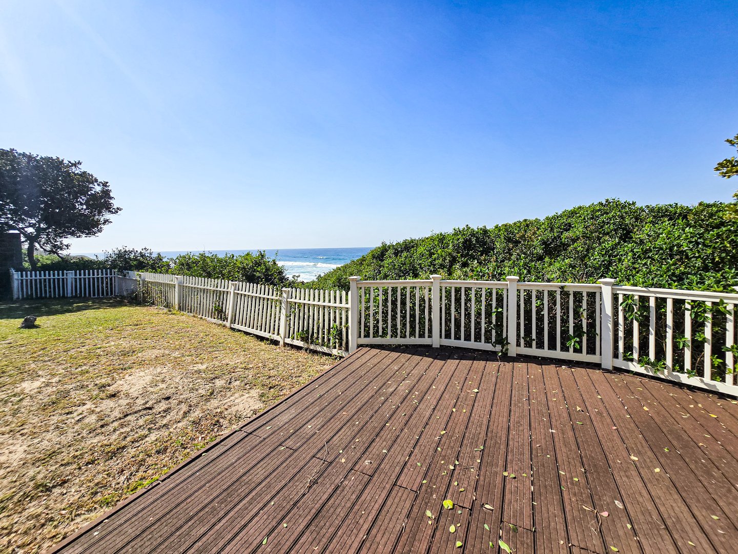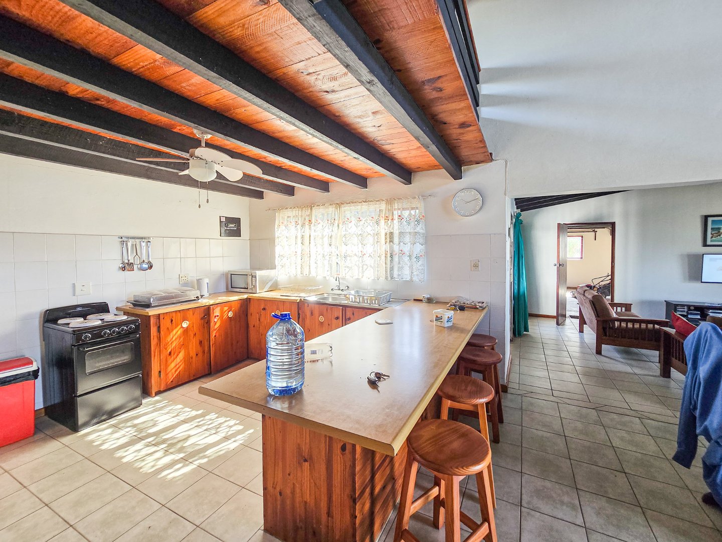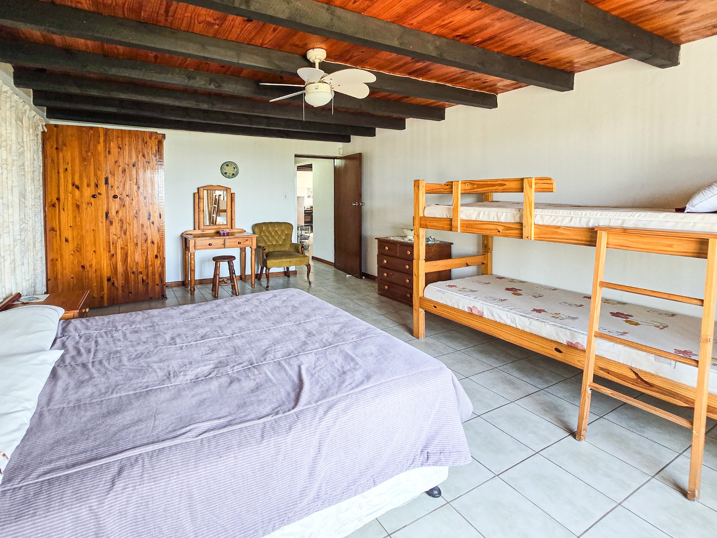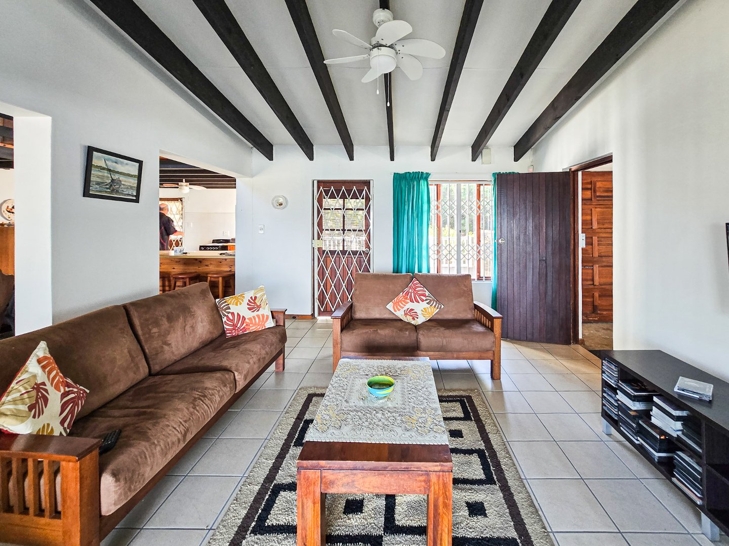 The house features an open-plan design, creating a seamless flow between the living, dining, and kitchen areas. The lounge and dining room open onto a covered patio. The garden area has a wooden deck where you can take in the stunning sea views—ideal for morning coffees or evening sundowners.