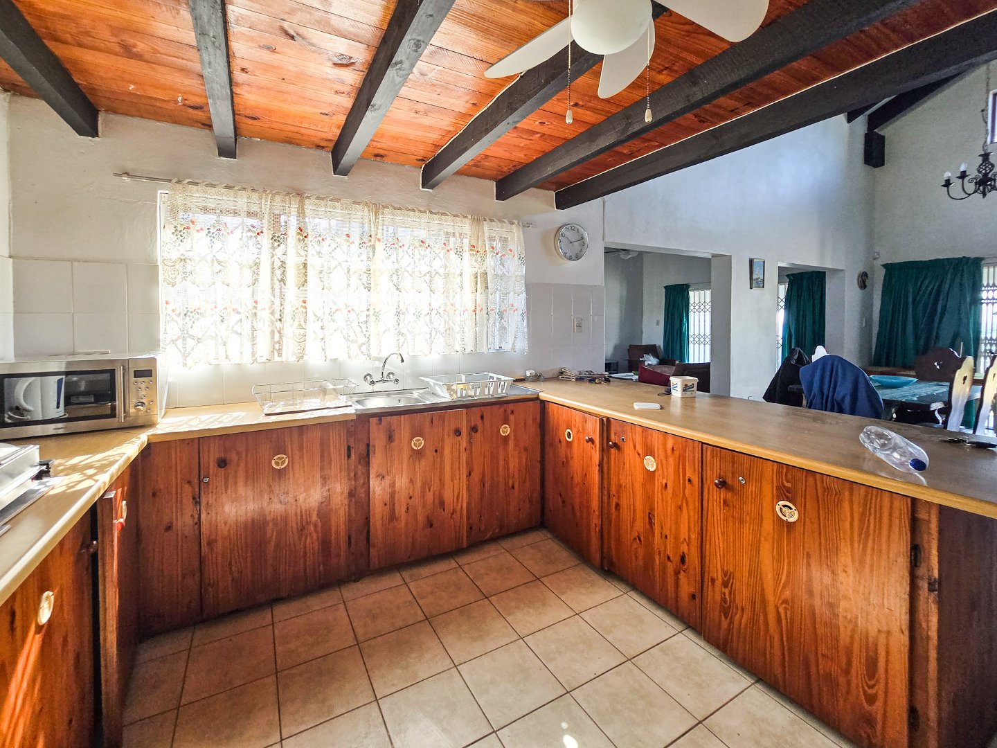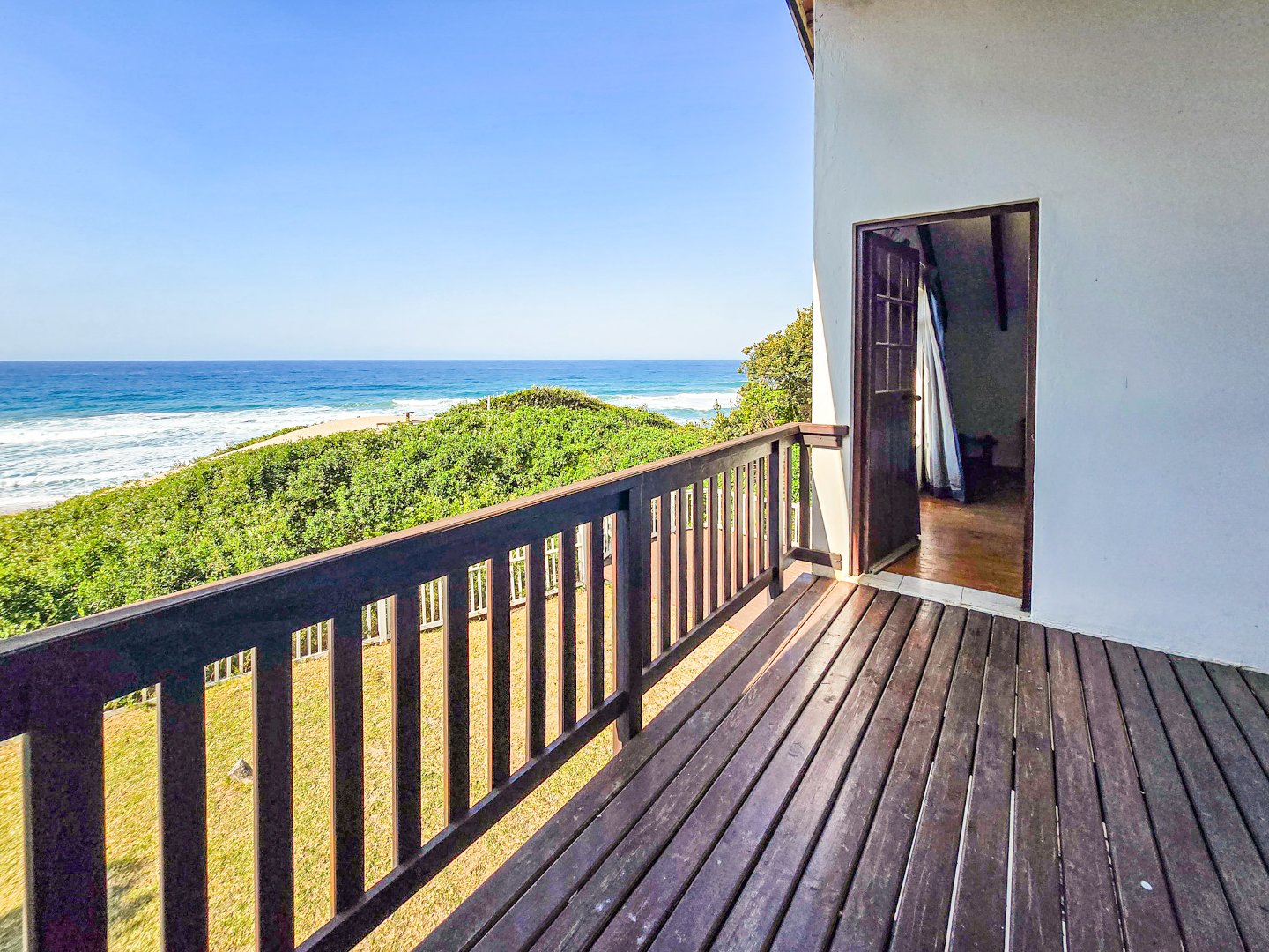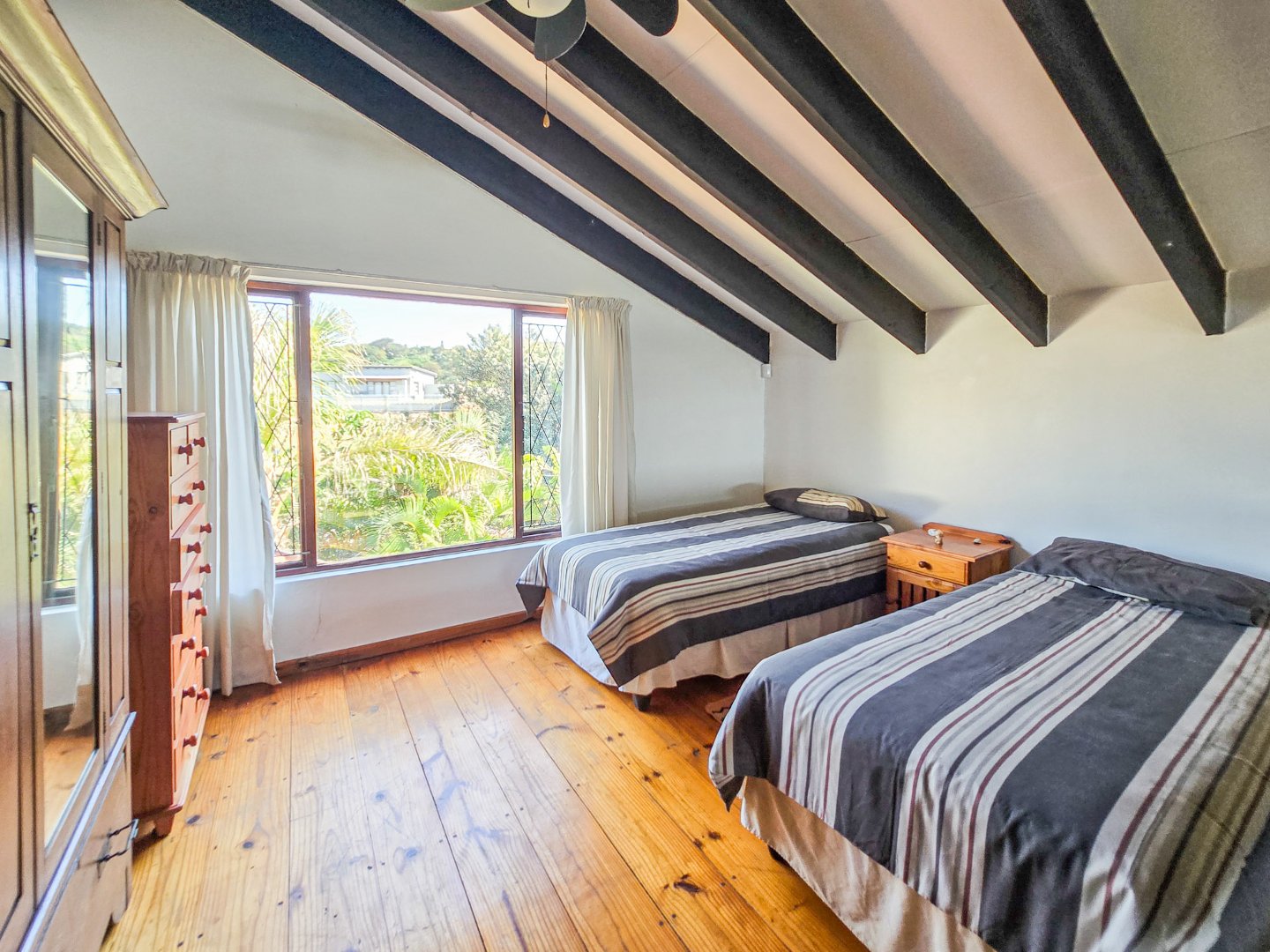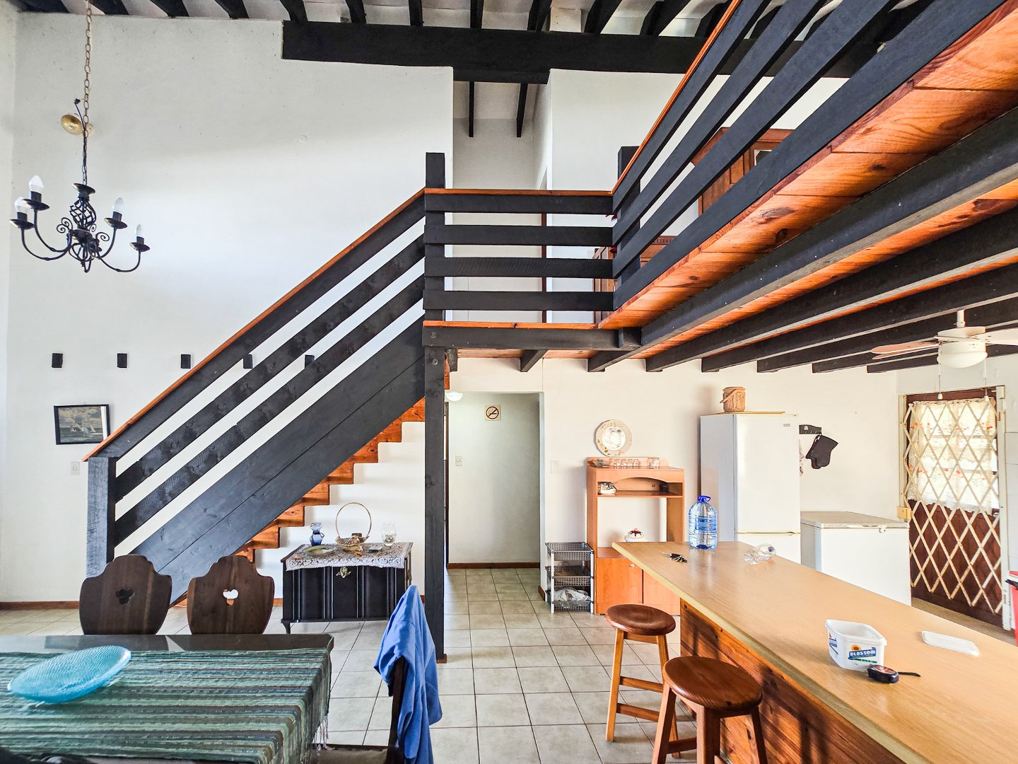 The house features an open-plan design, creating a seamless flow between the living, dining, and kitchen areas. The lounge and dining room open onto a covered patio. The garden area has a wooden deck where you can take in the stunning sea views—ideal for morning coffees or evening sundowners.