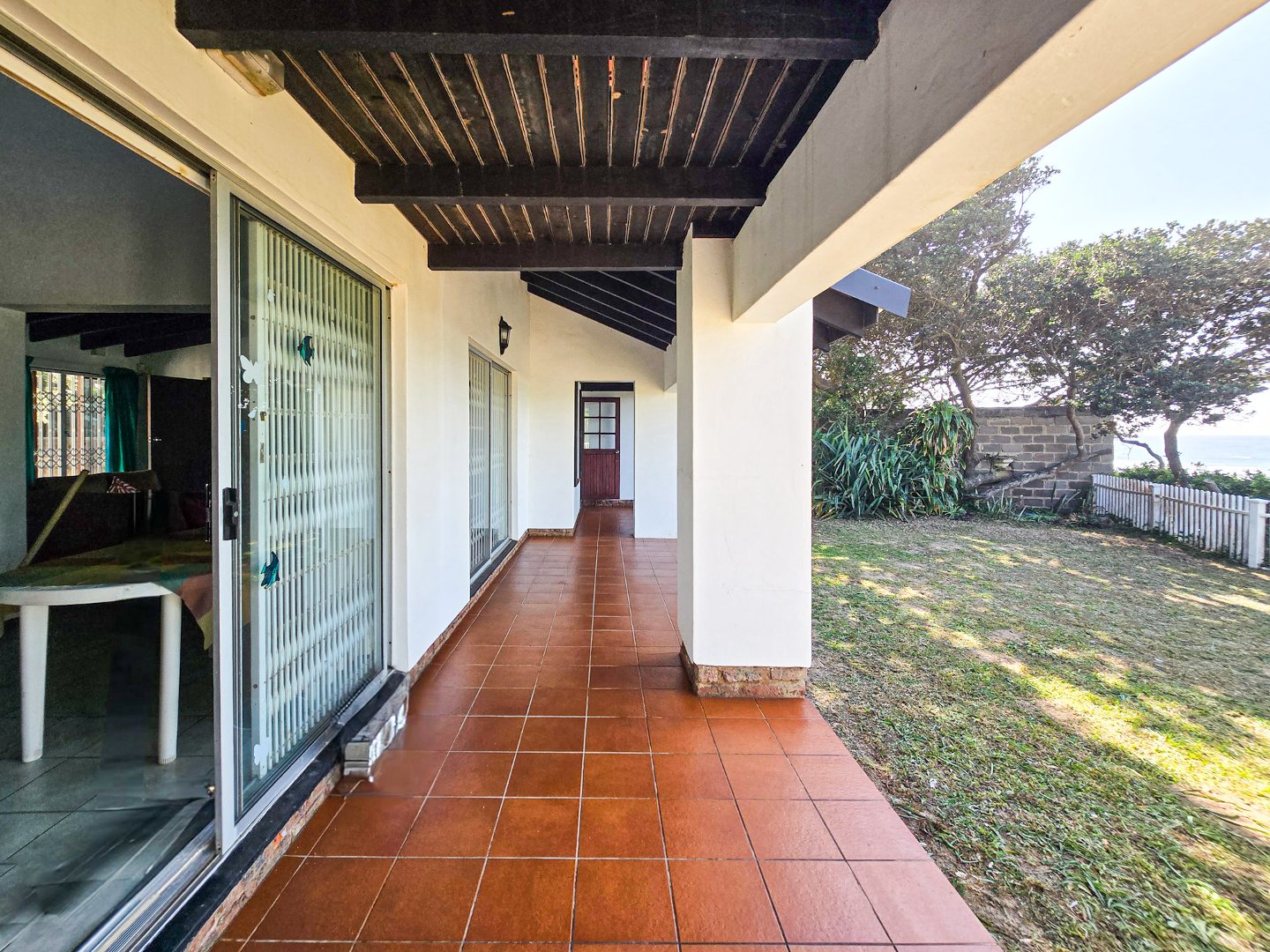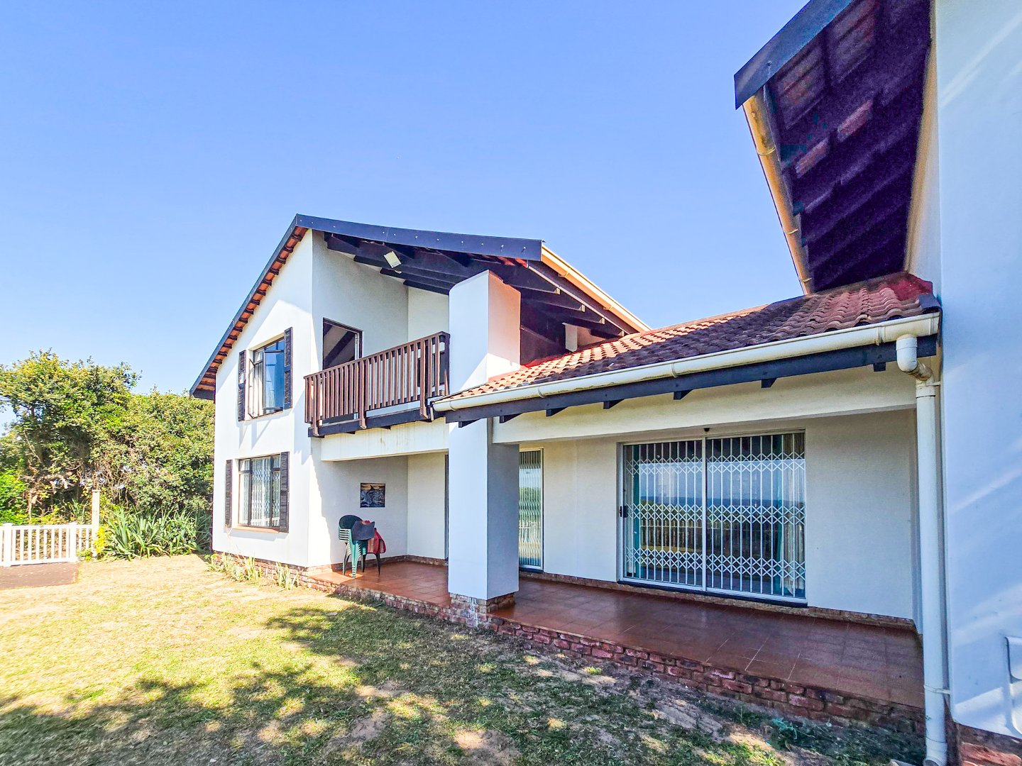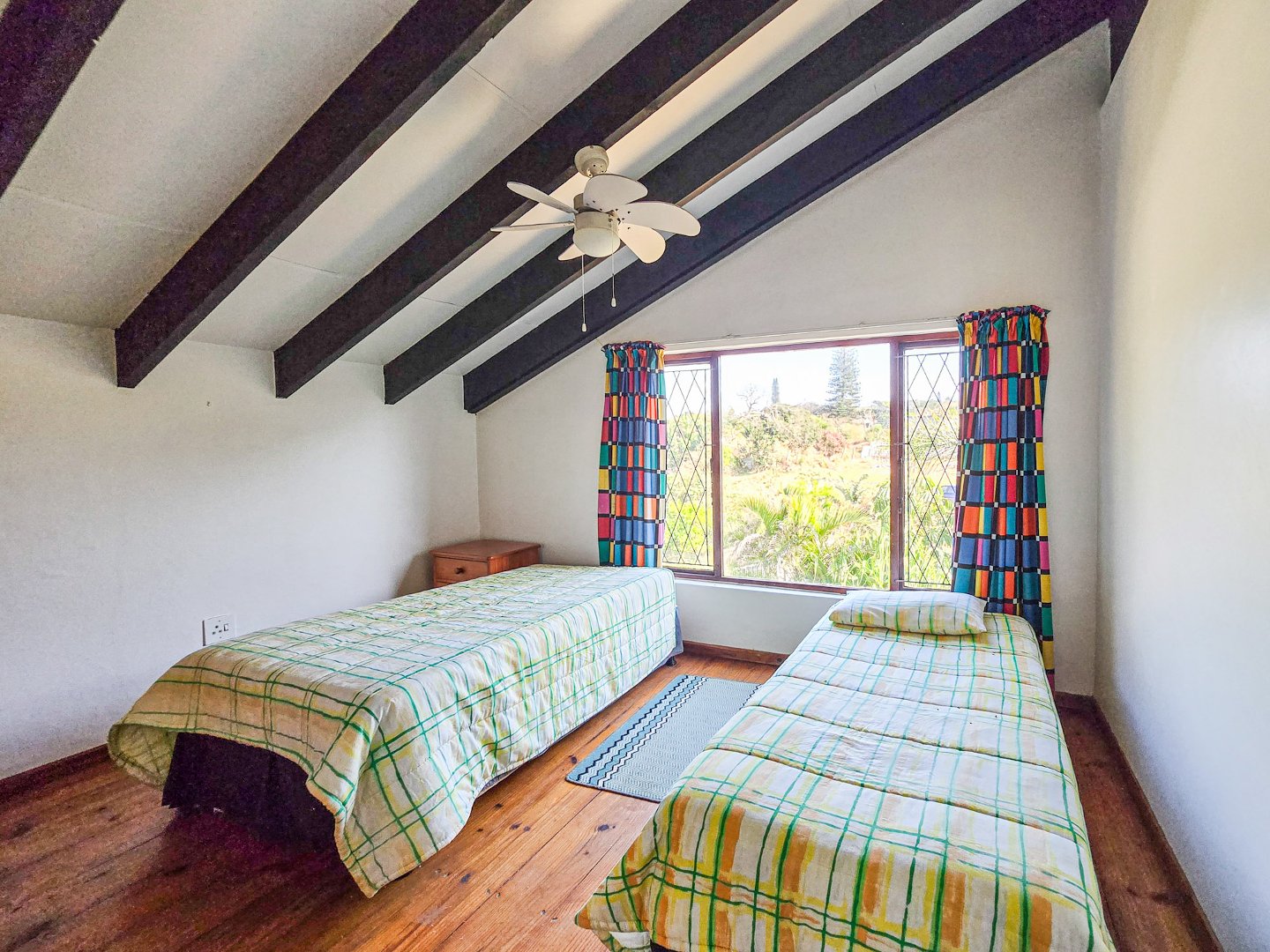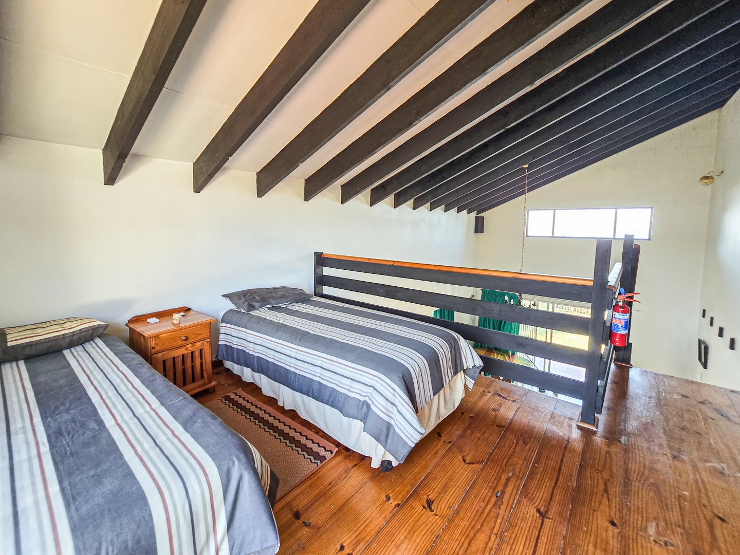 The house features an open-plan design, creating a seamless flow between the living, dining, and kitchen areas. The lounge and dining room open onto a covered patio. The garden area has a wooden deck where you can take in the stunning sea views—ideal for morning coffees or evening sundowners.