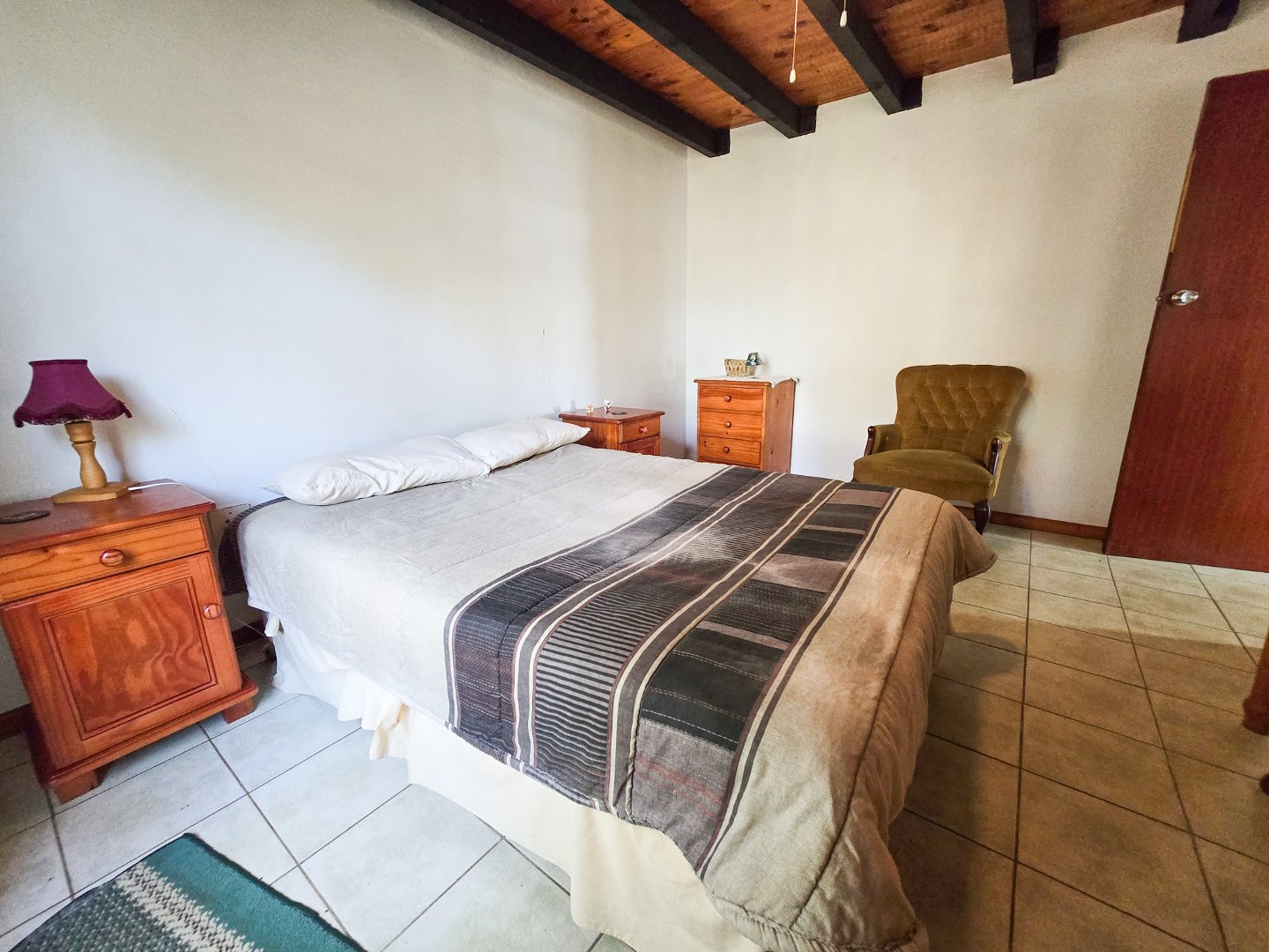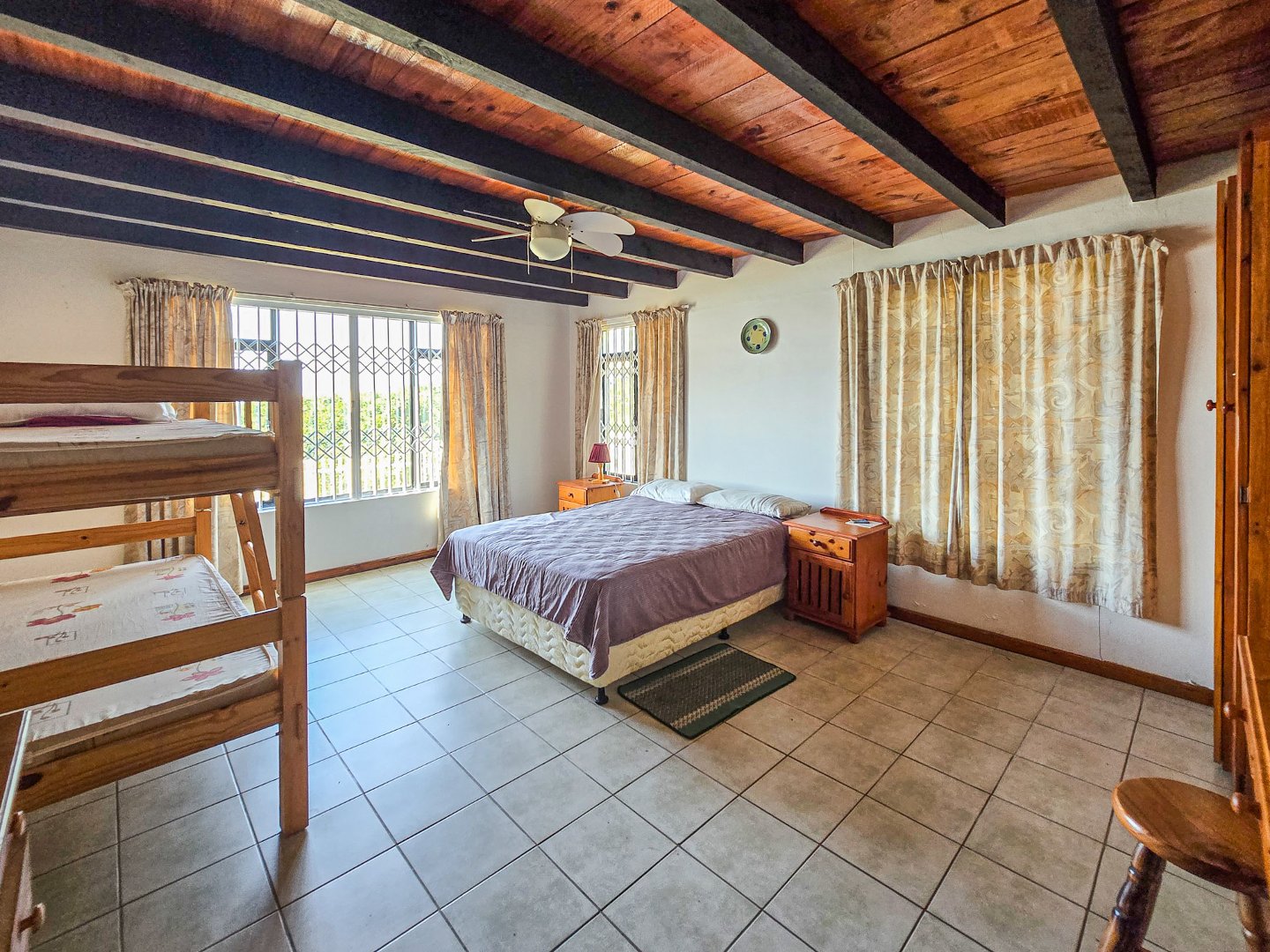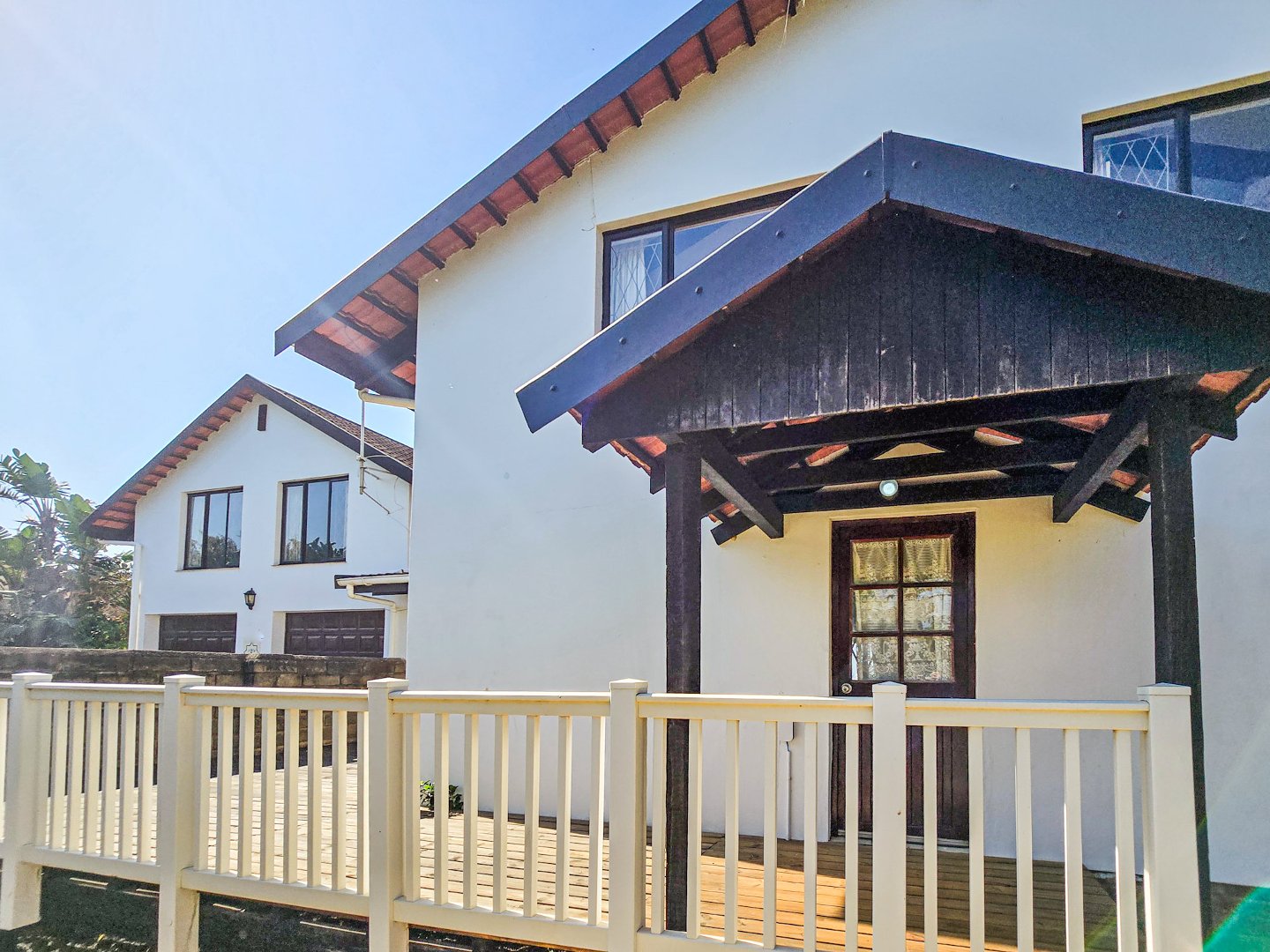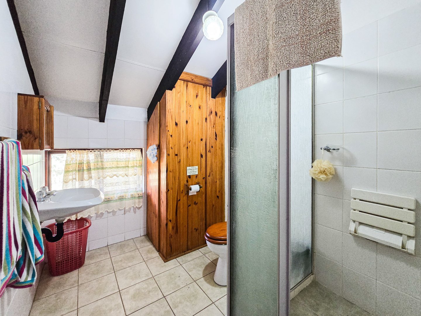 The house features an open-plan design, creating a seamless flow between the living, dining, and kitchen areas. The lounge and dining room open onto a covered patio. The garden area has a wooden deck where you can take in the stunning sea views—ideal for morning coffees or evening sundowners.