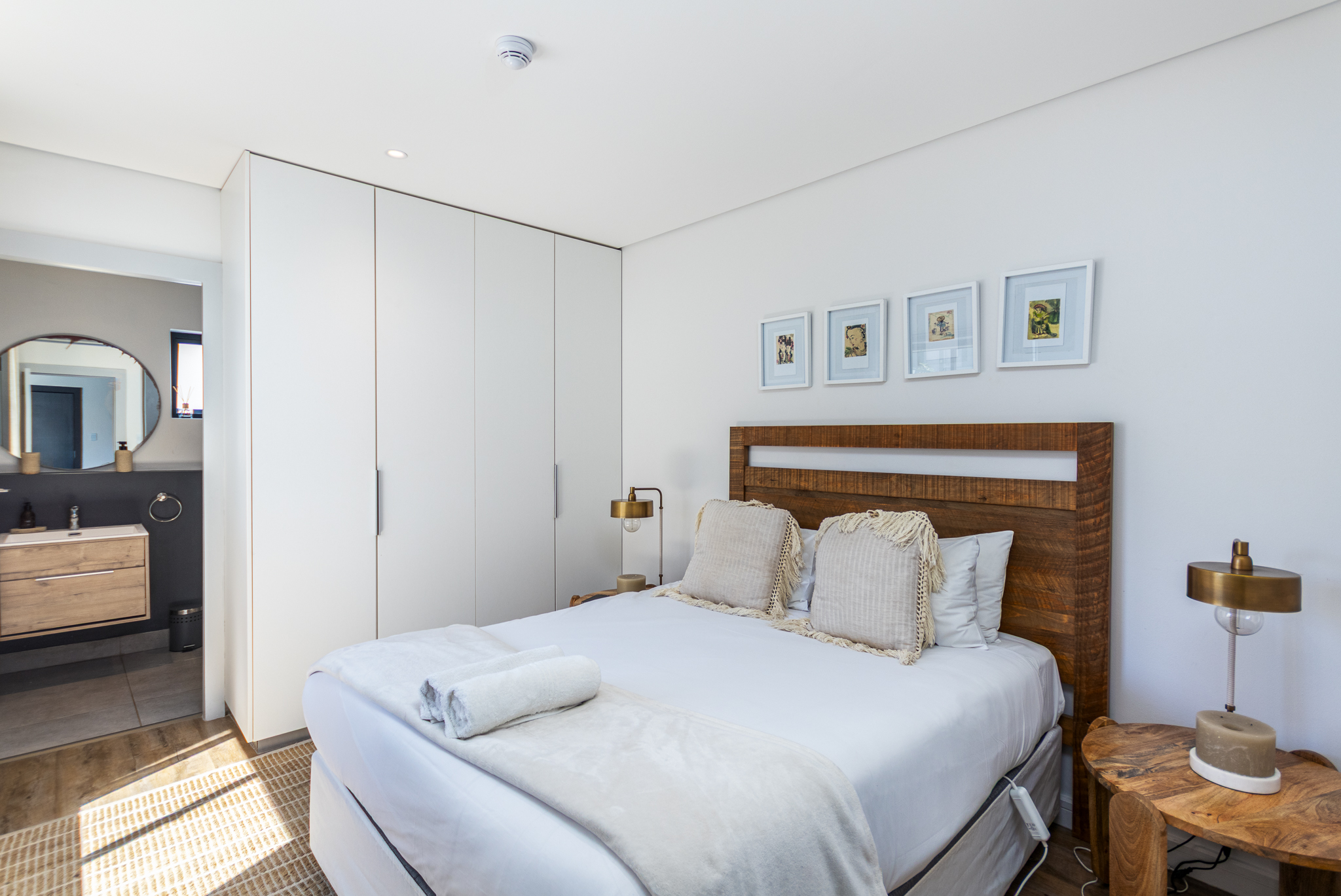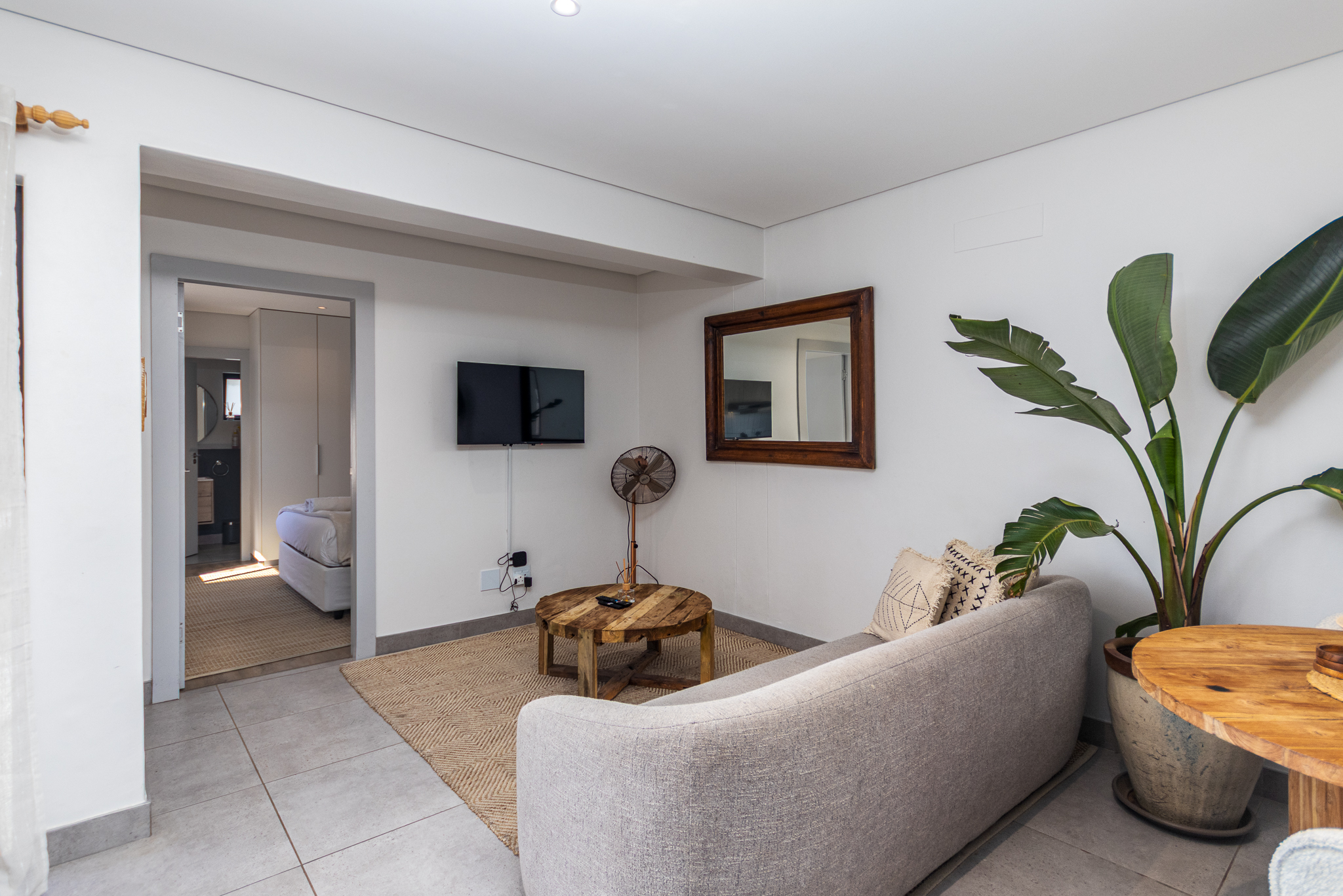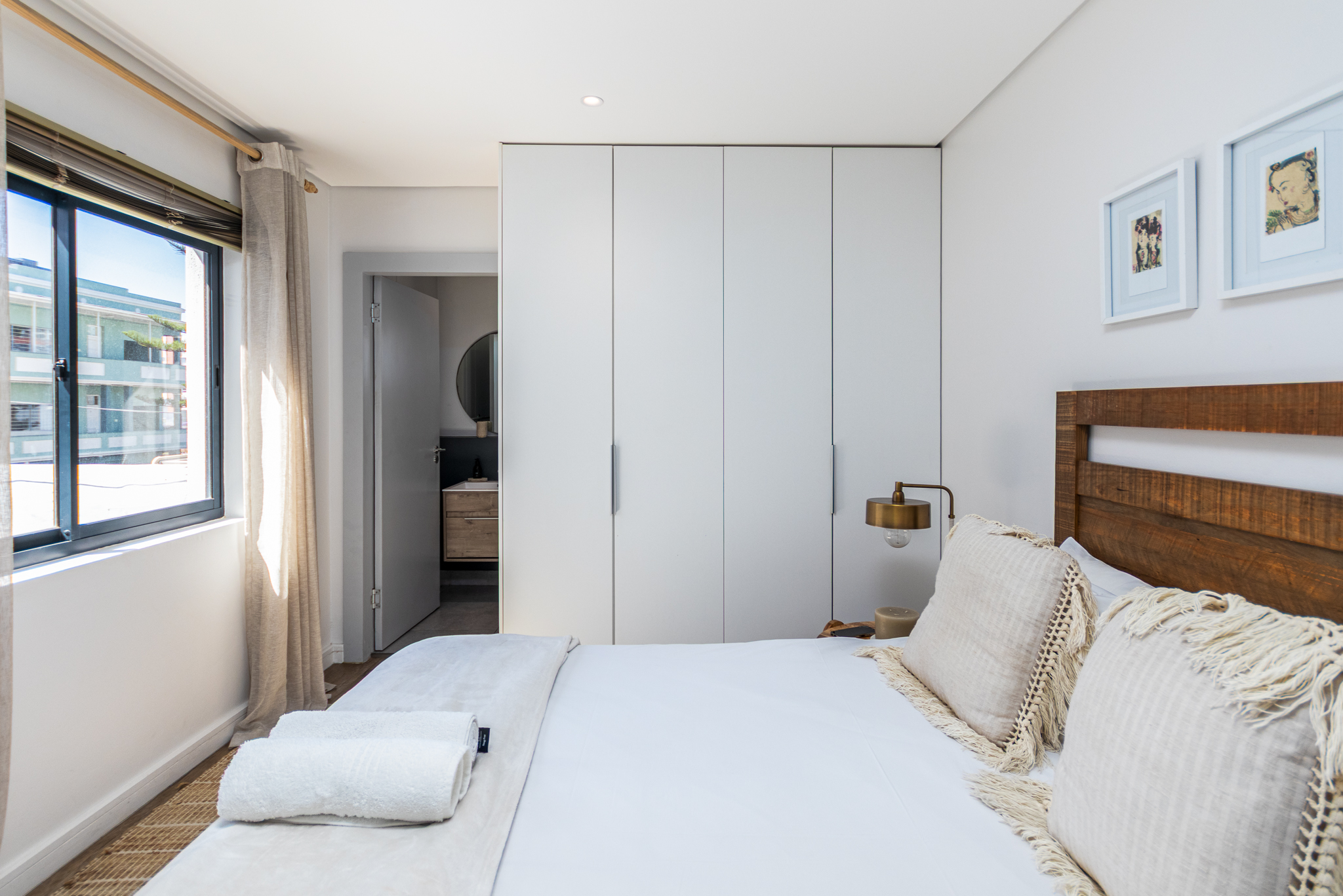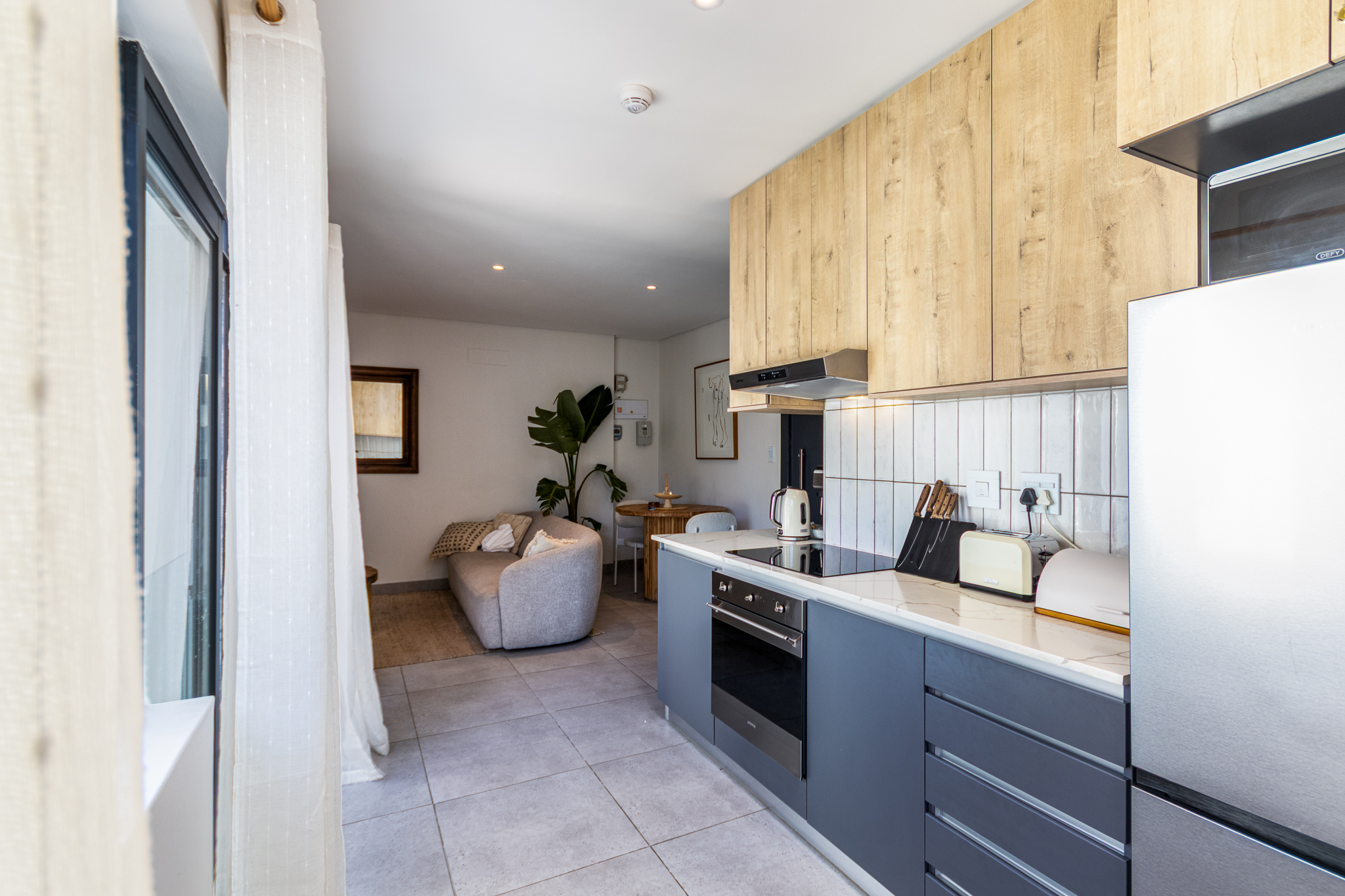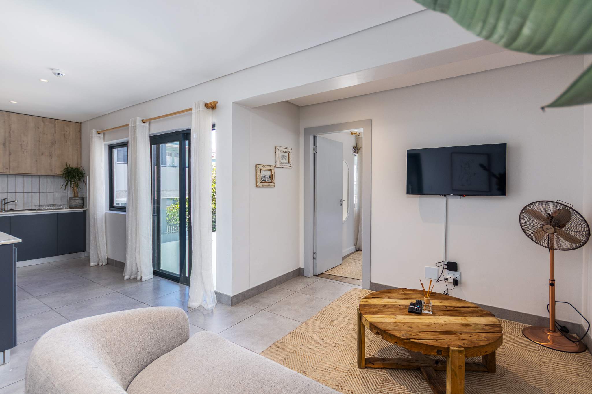 The open-plan living and kitchen area is sleek and functional, flowing seamlessly onto the living space and creating a light, comfortable environment. The bedroom is well-proportioned with built-in cupboards, while the bathroom features modern fixtures and a clean, minimalist aesthetic.