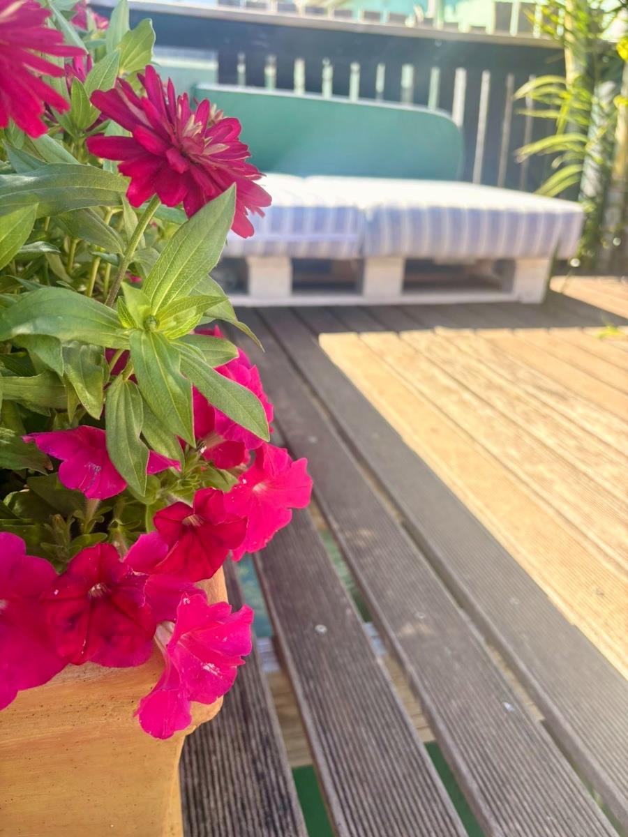 Outdoor living is a highlight, with a private wooden patio featuring a lounger, small dining table and plunge pool, perfect for relaxed afternoons. An upper deck adorned with plants offers a tranquil retreat with a sofa and sea views, ideal for sunset drinks and evening relaxation.
