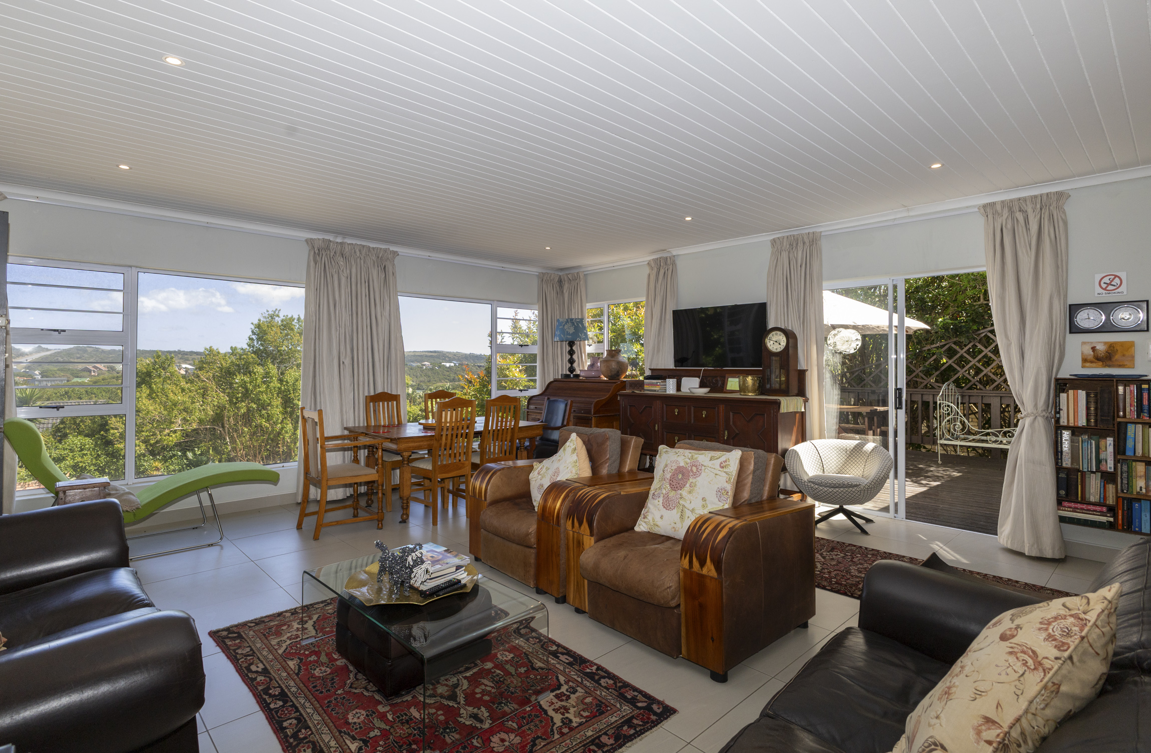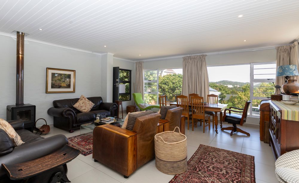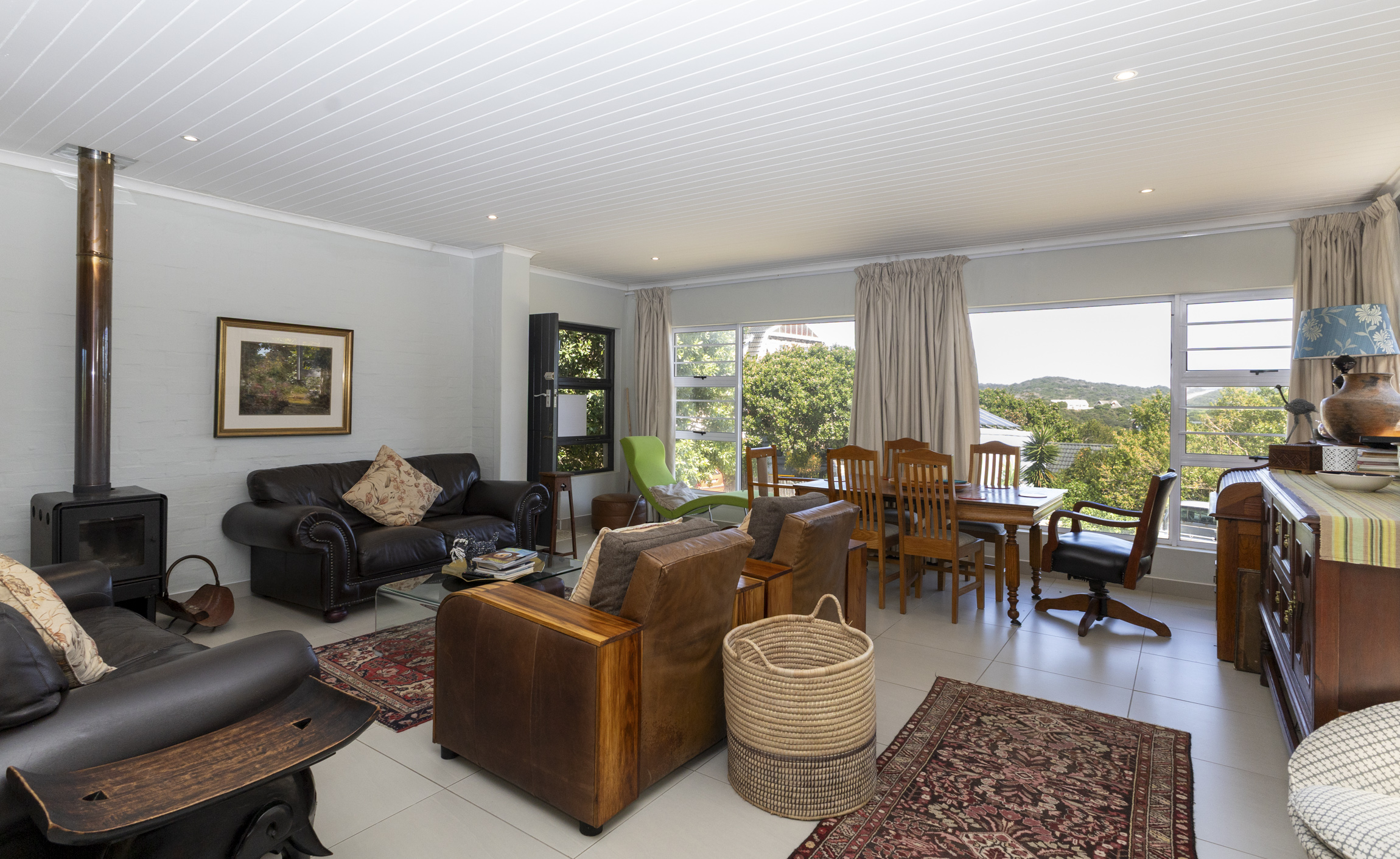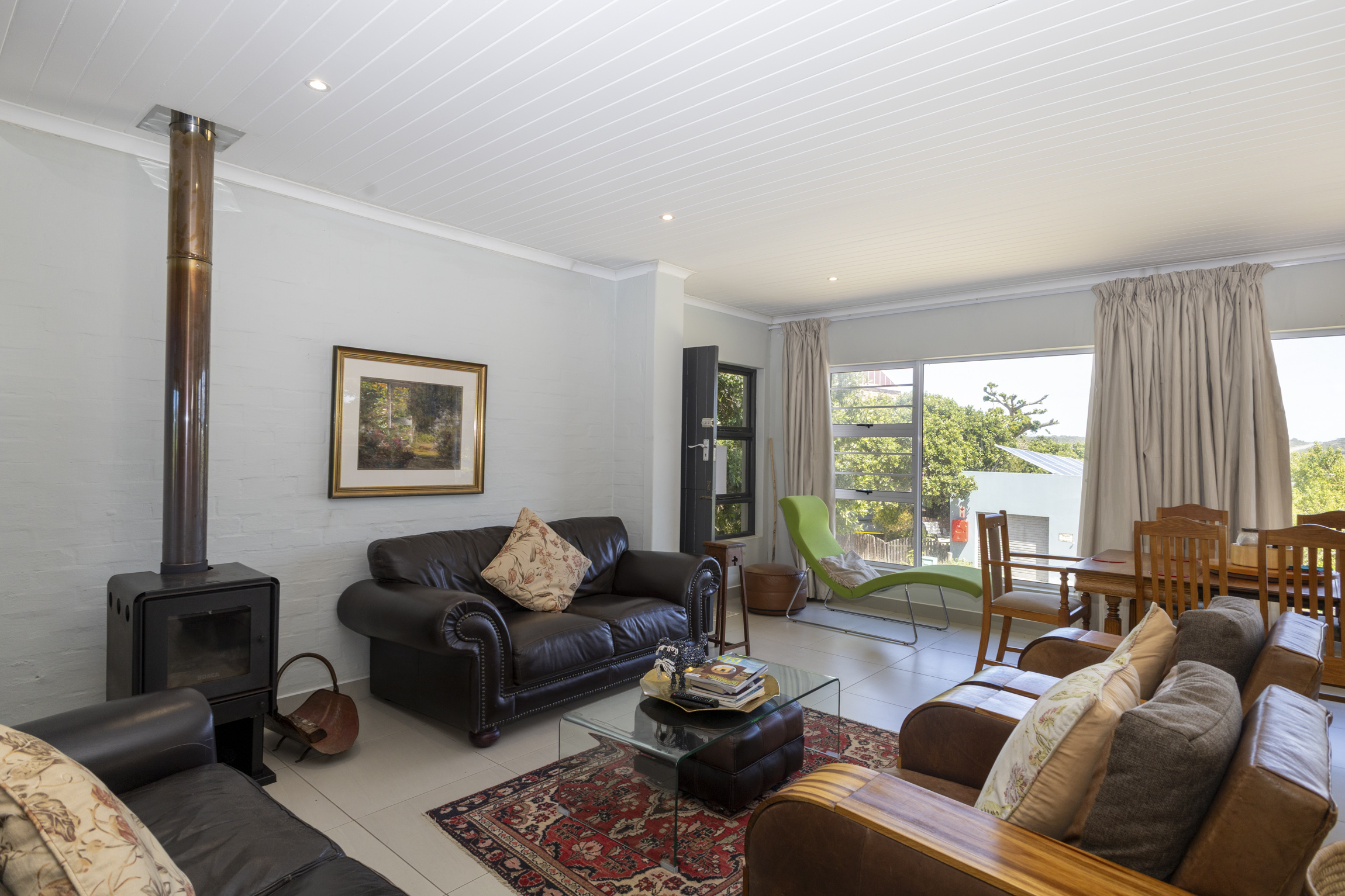 At the top of the stairs you are welcomed into a generous open-plan lounge, dining area, and kitchen. Abundant natural light floods the interiors through aluminium-framed windows, while a cozy fireplace adds both warmth and atmosphere on cooler evenings.