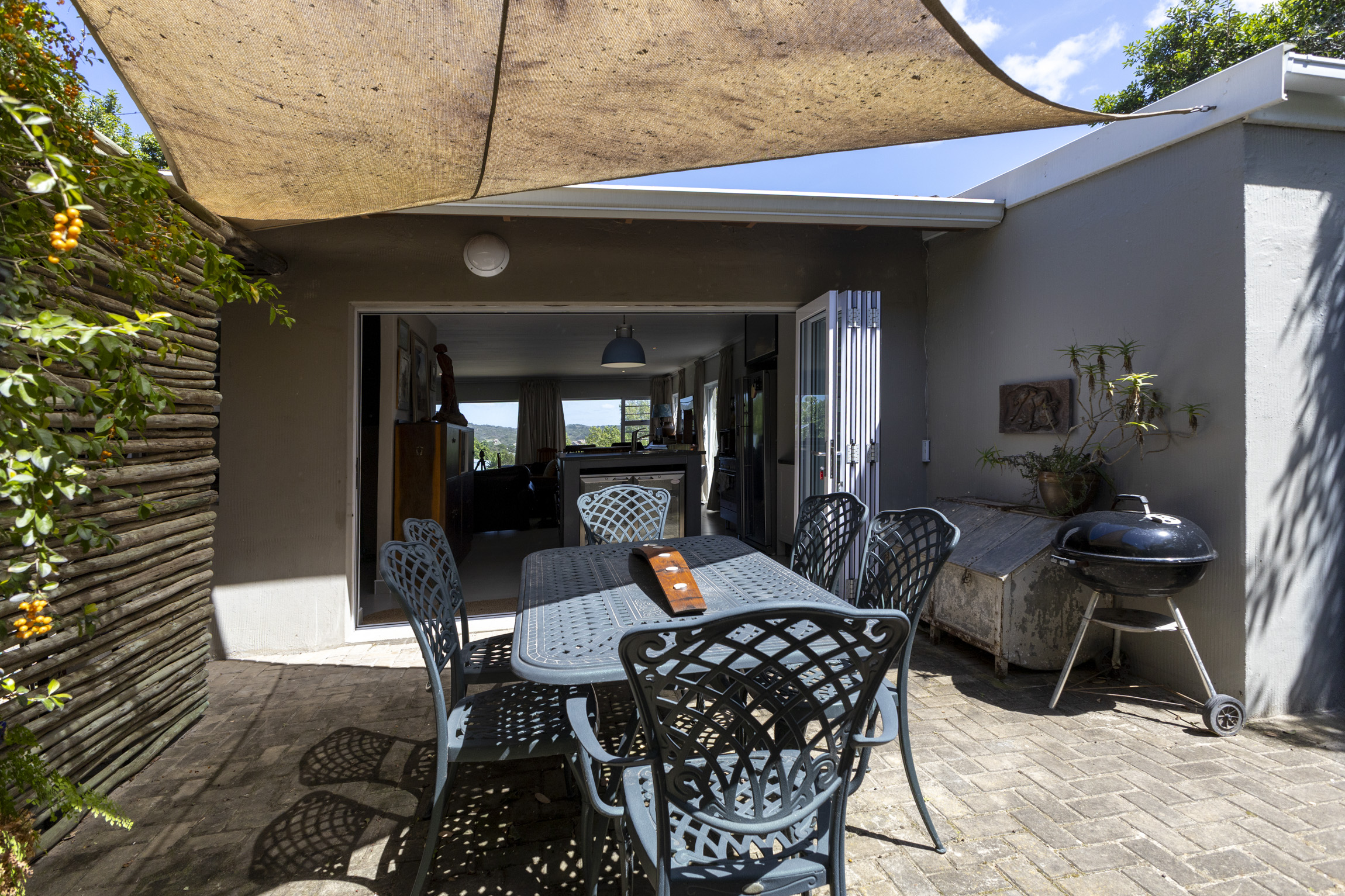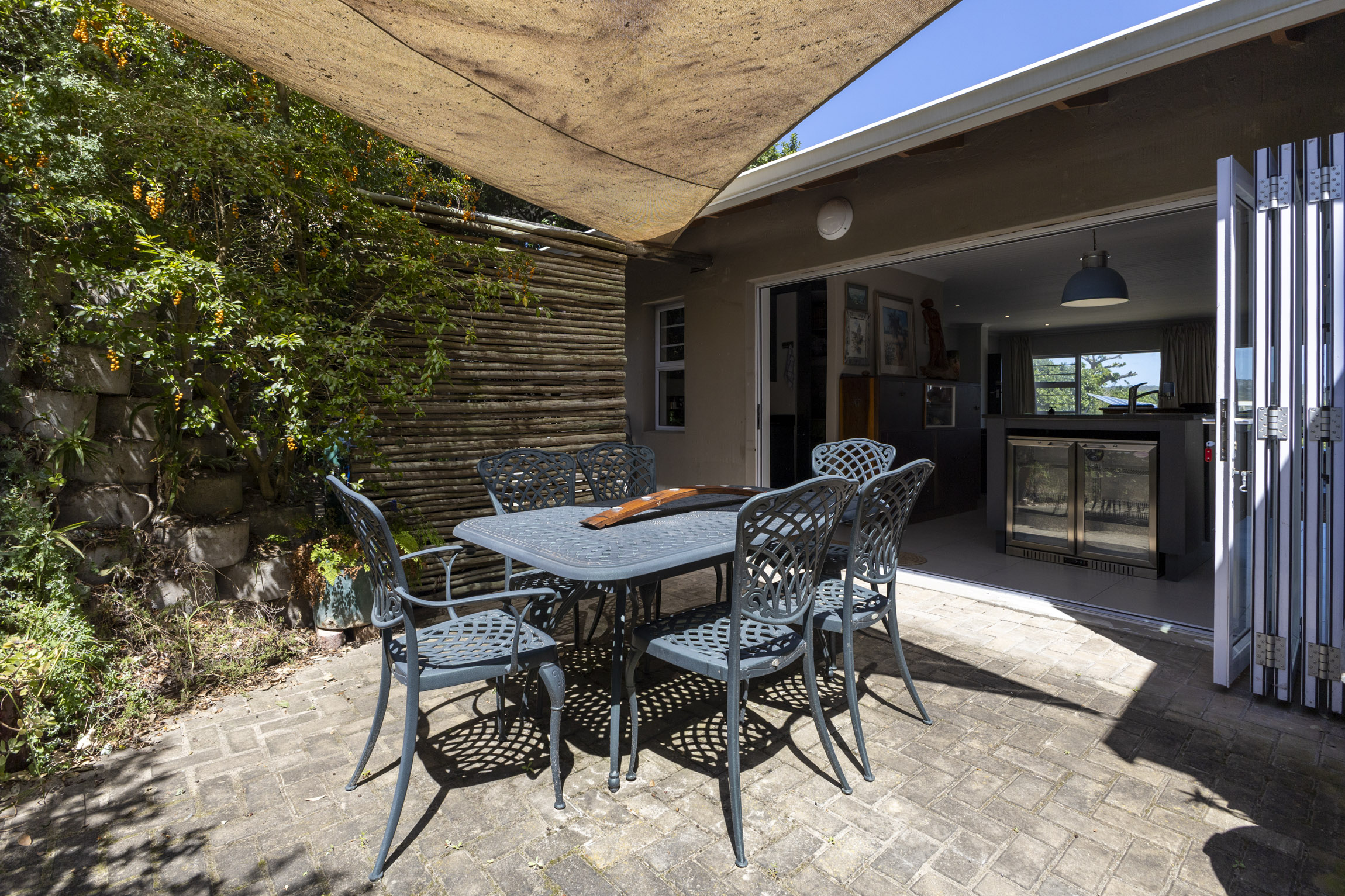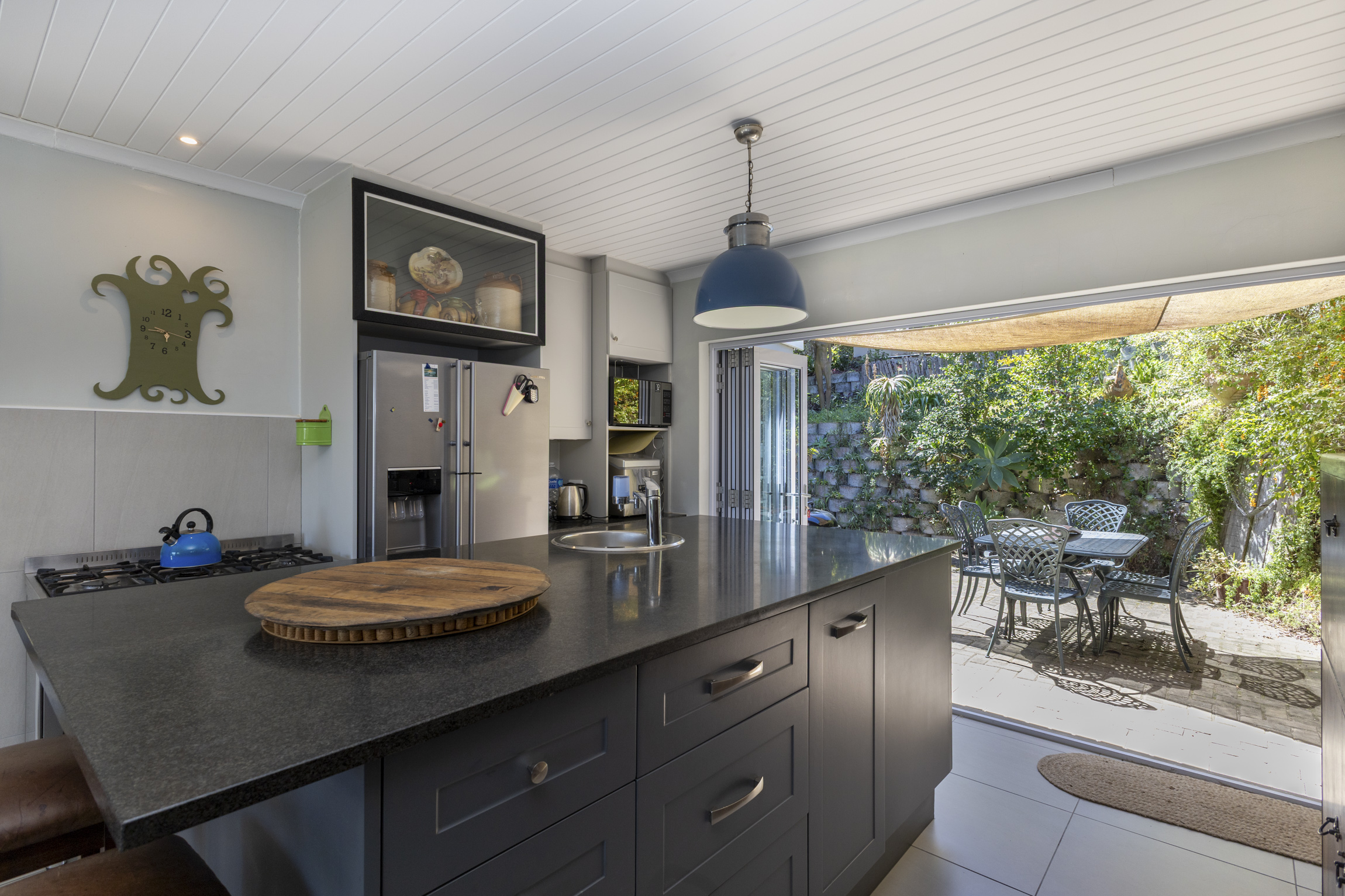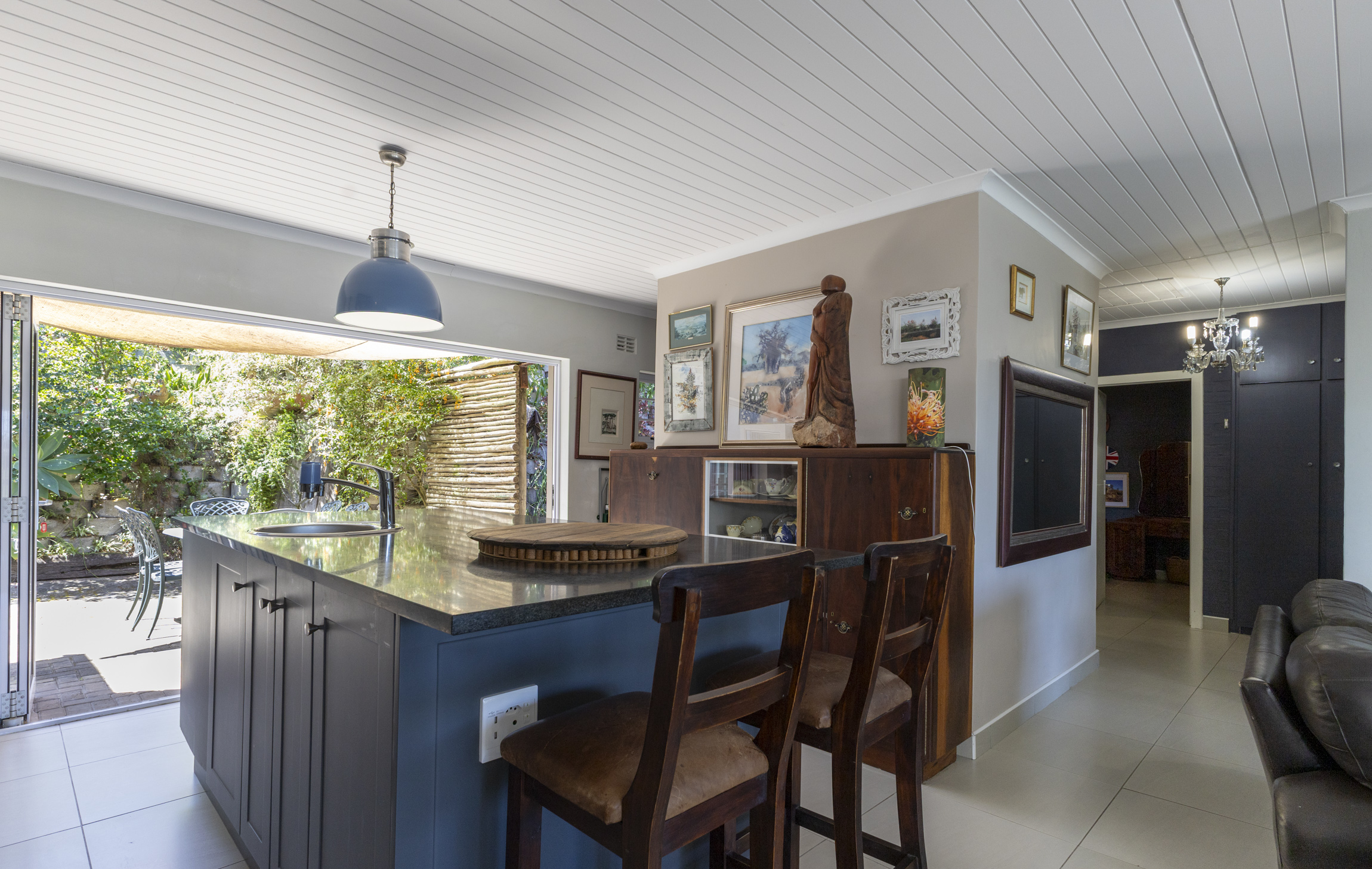 The modern kitchen is a true centerpiece, boasting a sizeable island, modern appliances, and cleverly integrated storage. A discreet scullery with laundry facilities is positioned just off the kitchen. Aluminium stackable doors open effortlessly to a sheltered dining patio, creating a relaxed connection between indoor comfort and outdoor entertaining.