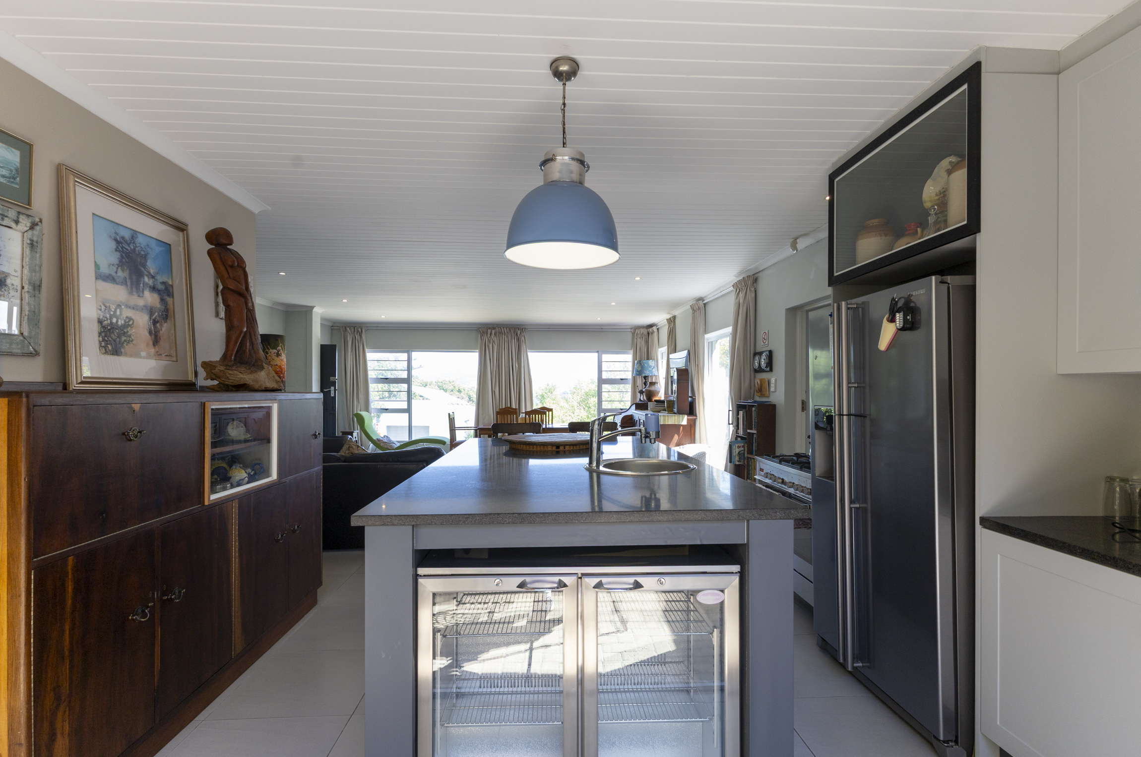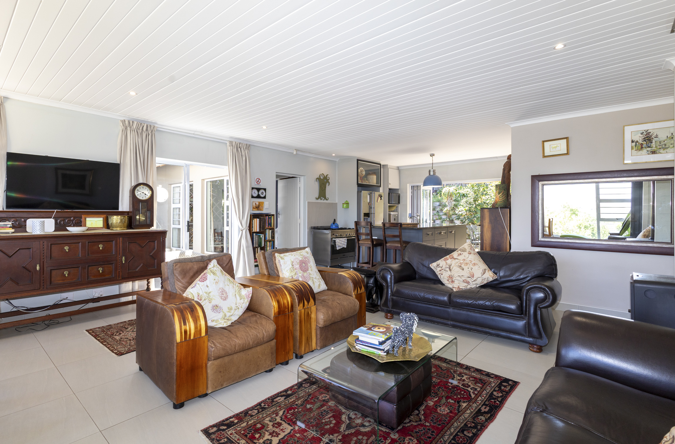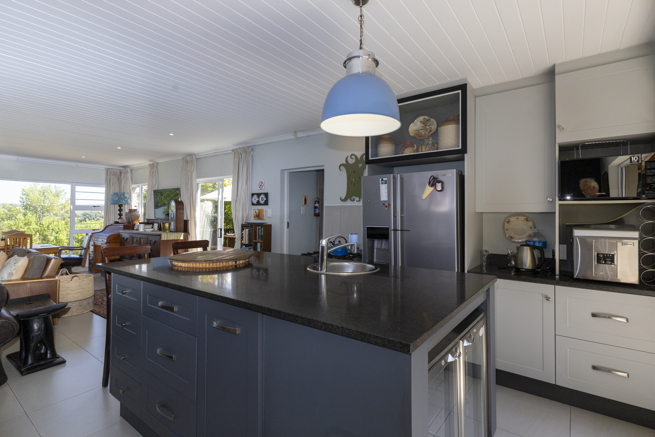 The modern kitchen is a true centerpiece, boasting a sizeable island, modern appliances, and cleverly integrated storage. A discreet scullery with laundry facilities is positioned just off the kitchen. Aluminium stackable doors open effortlessly to a sheltered dining patio, creating a relaxed connection between indoor comfort and outdoor entertaining.