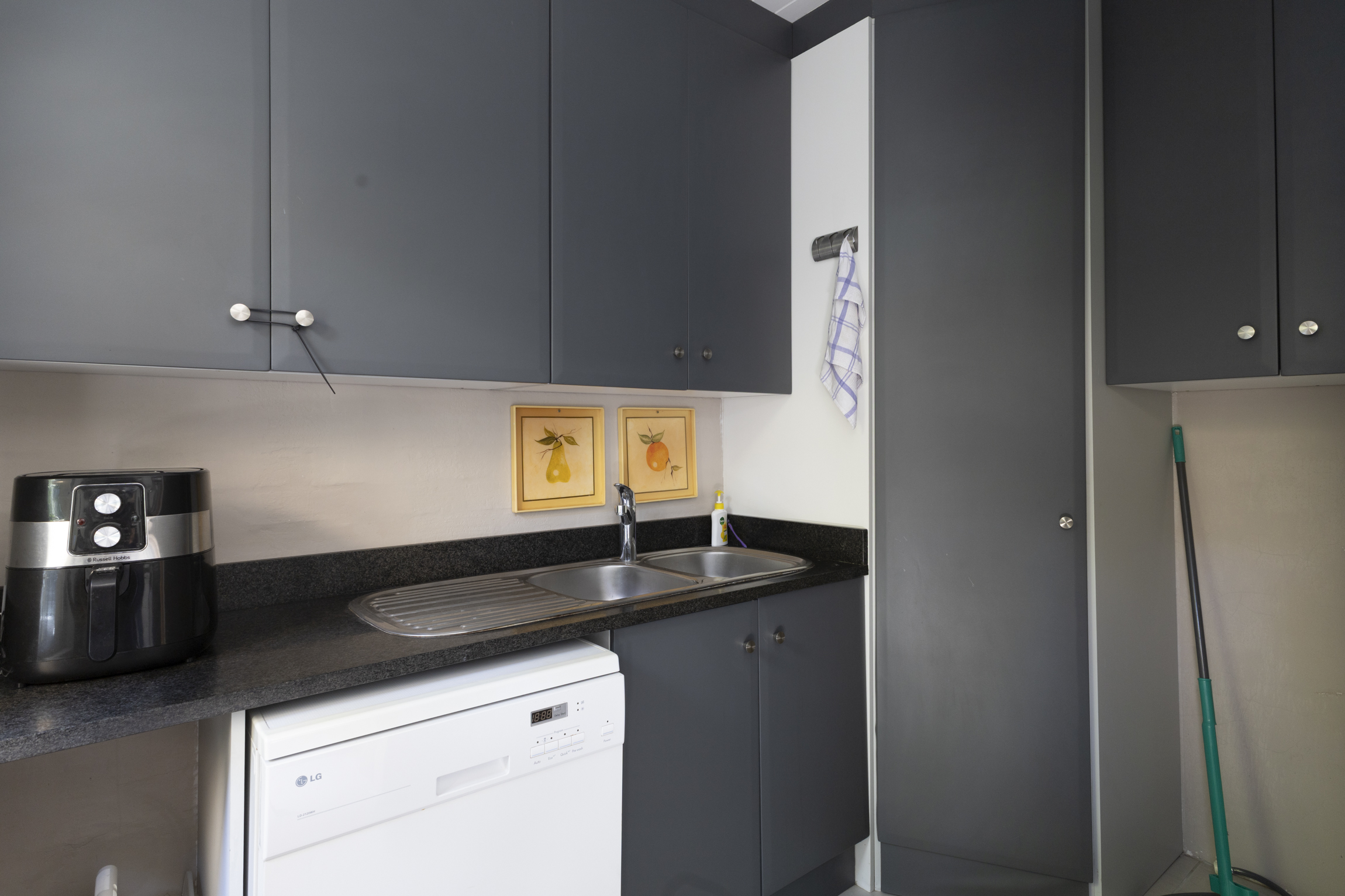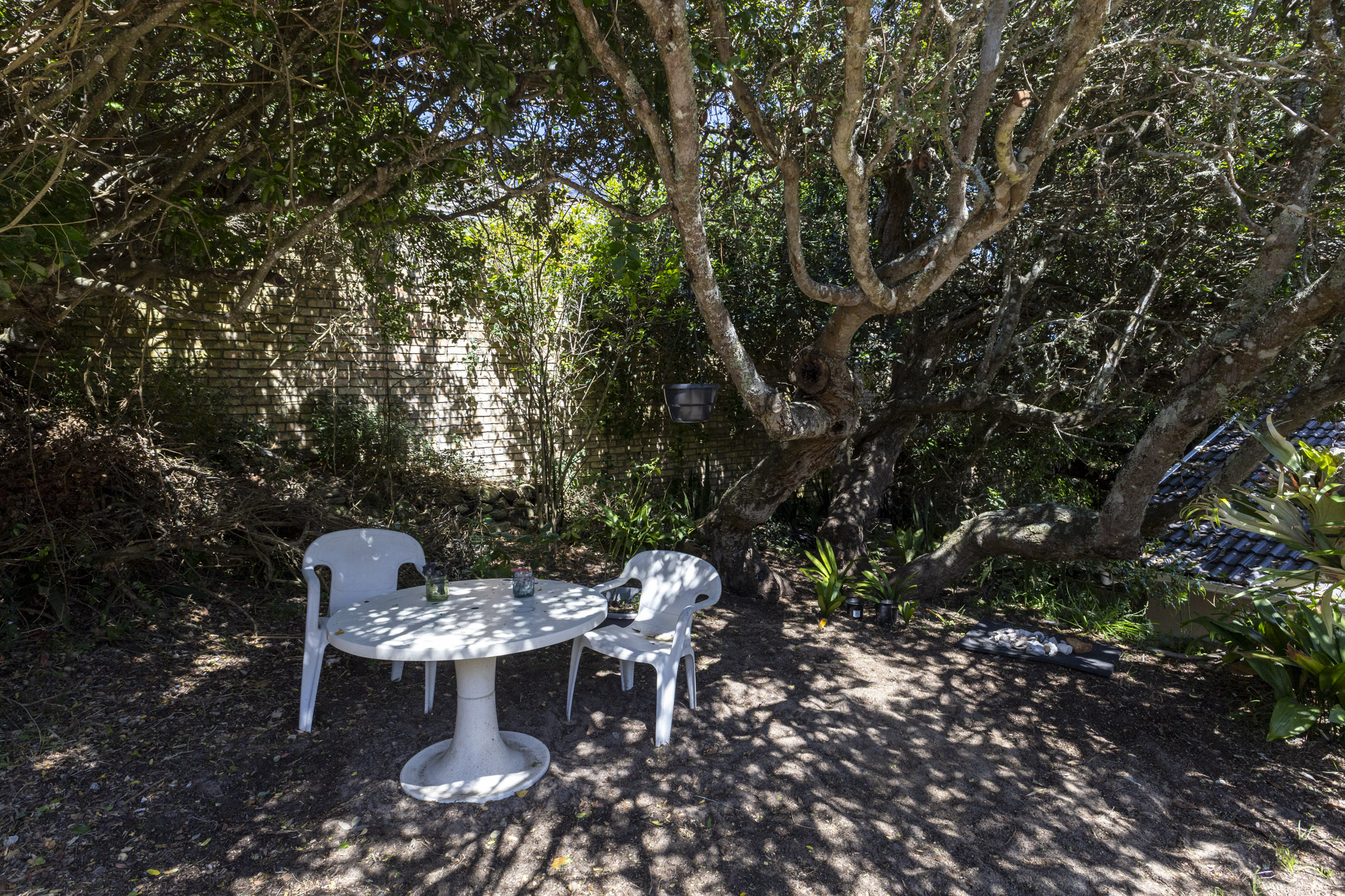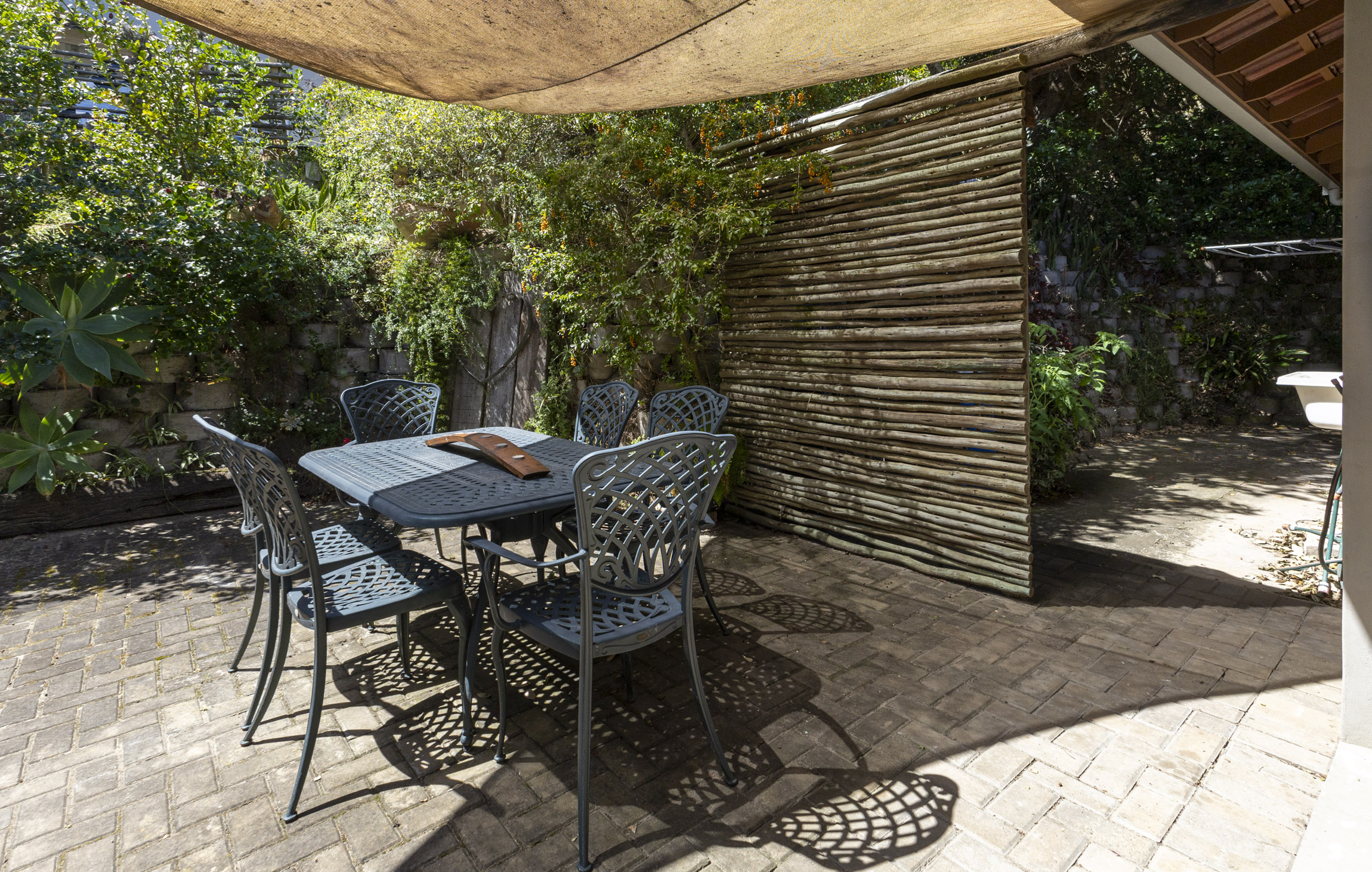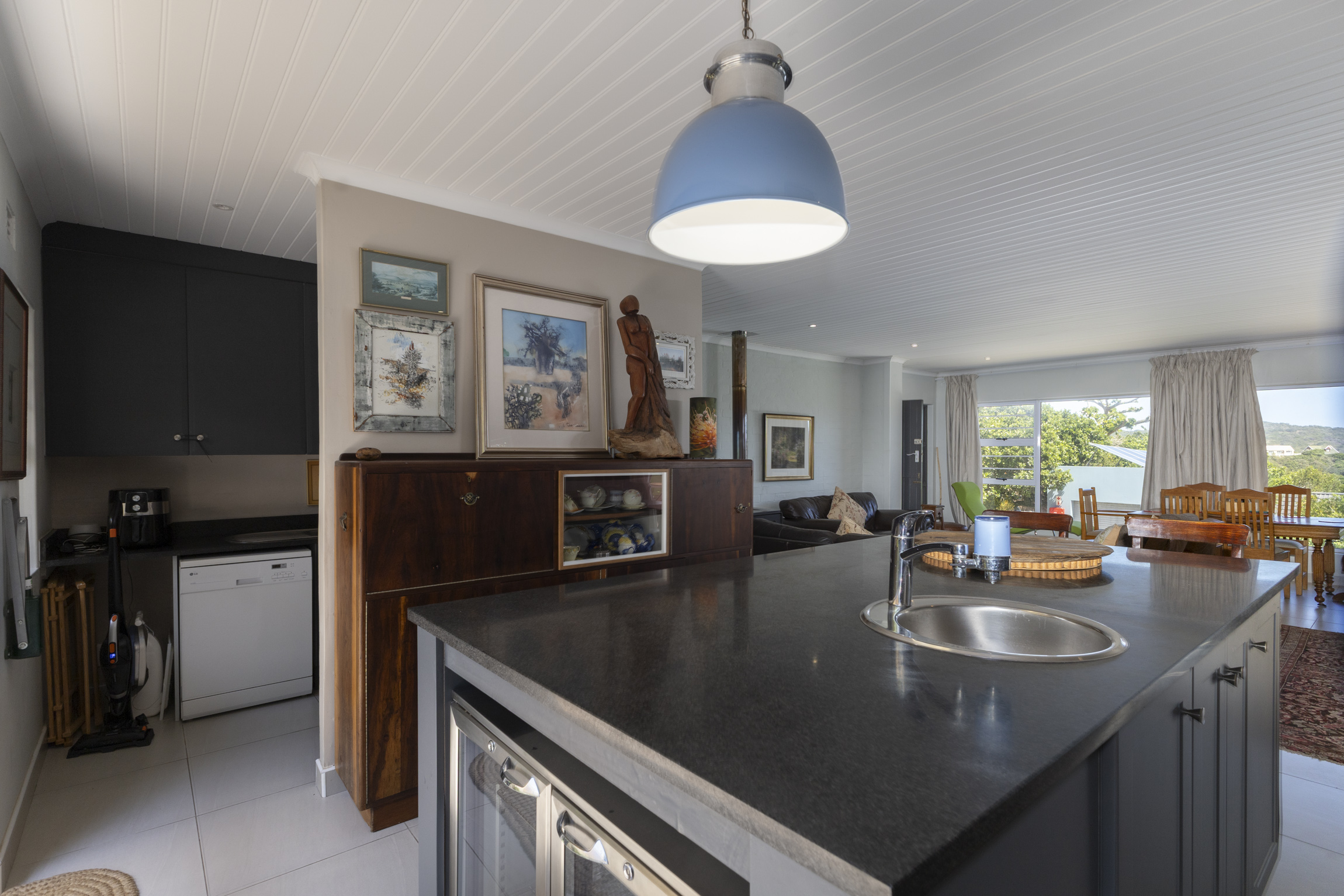 The modern kitchen is a true centerpiece, boasting a sizeable island, modern appliances, and cleverly integrated storage. A discreet scullery with laundry facilities is positioned just off the kitchen. Aluminium stackable doors open effortlessly to a sheltered dining patio, creating a relaxed connection between indoor comfort and outdoor entertaining.