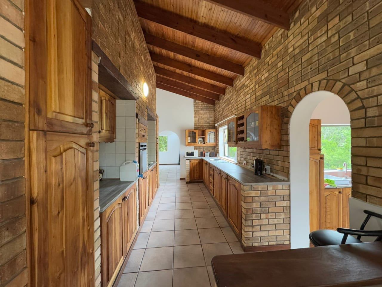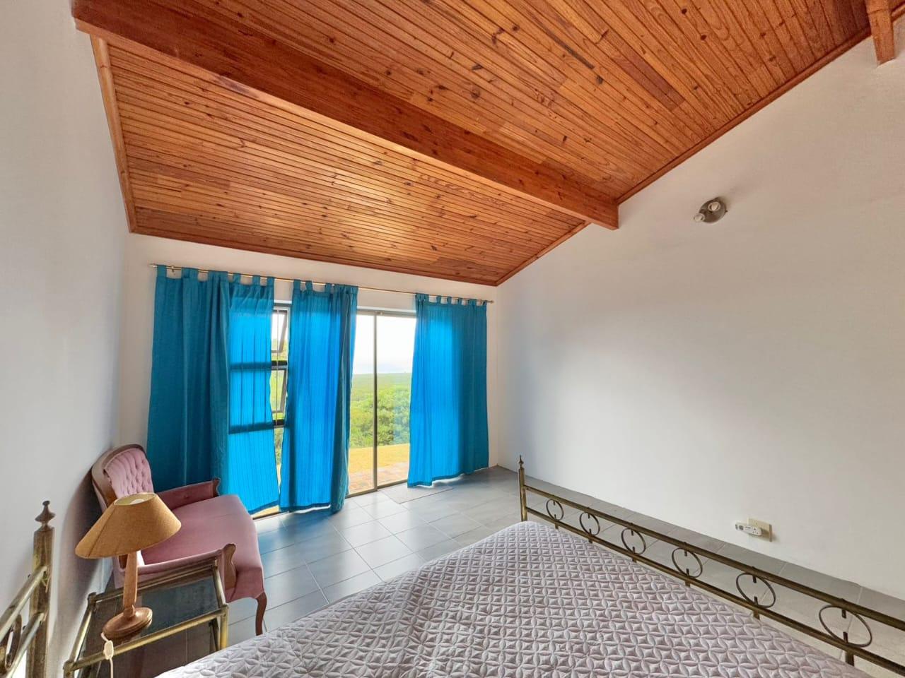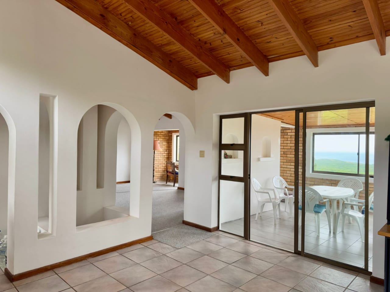 The established garden, filled with mature trees, creates a serene and welcoming environment. Local wildlife, including bushbuck, are occasional visitors, and birdsong forms part of daily life. The property is secured with an entrance gate, ensuring privacy and peace of mind.