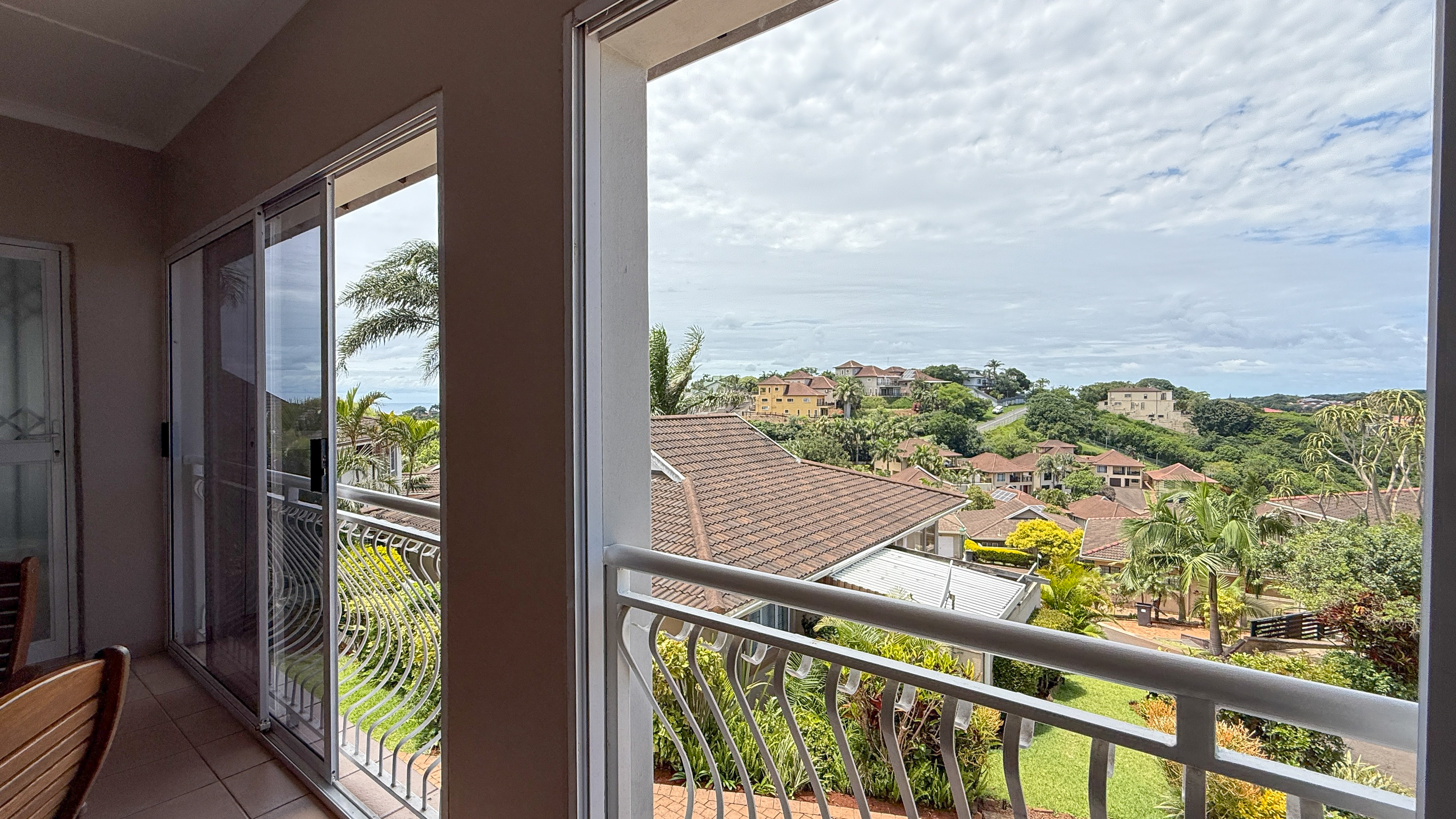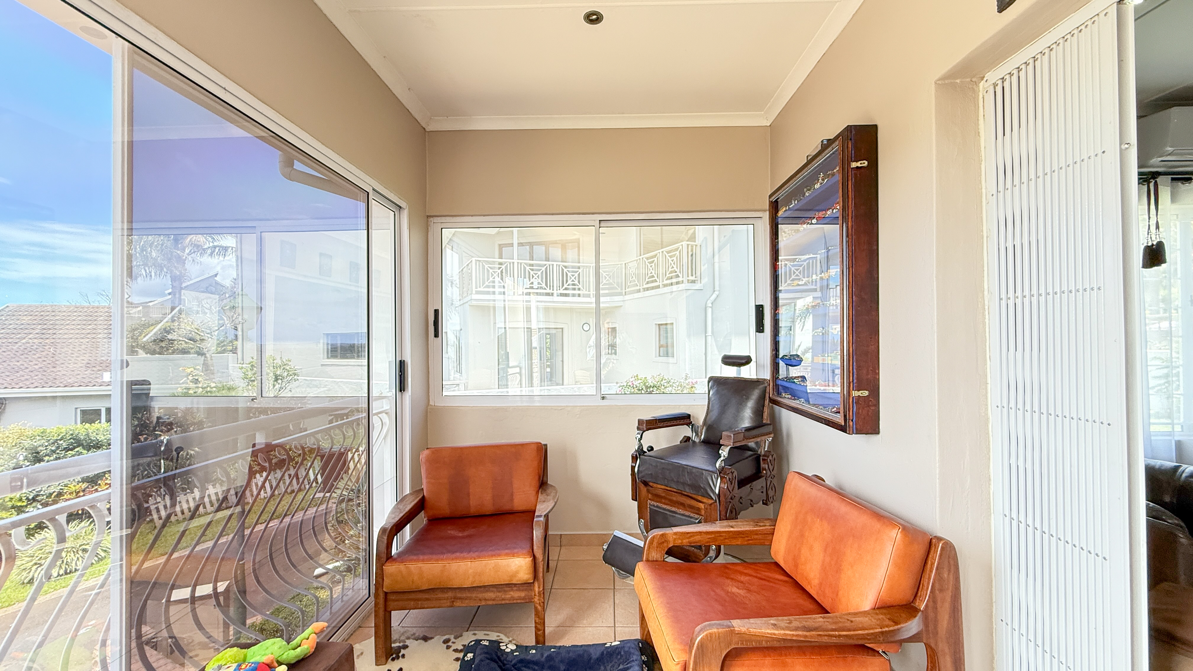 Enclosed glass-paneled balcony with sliding doors for year-round relaxation.
