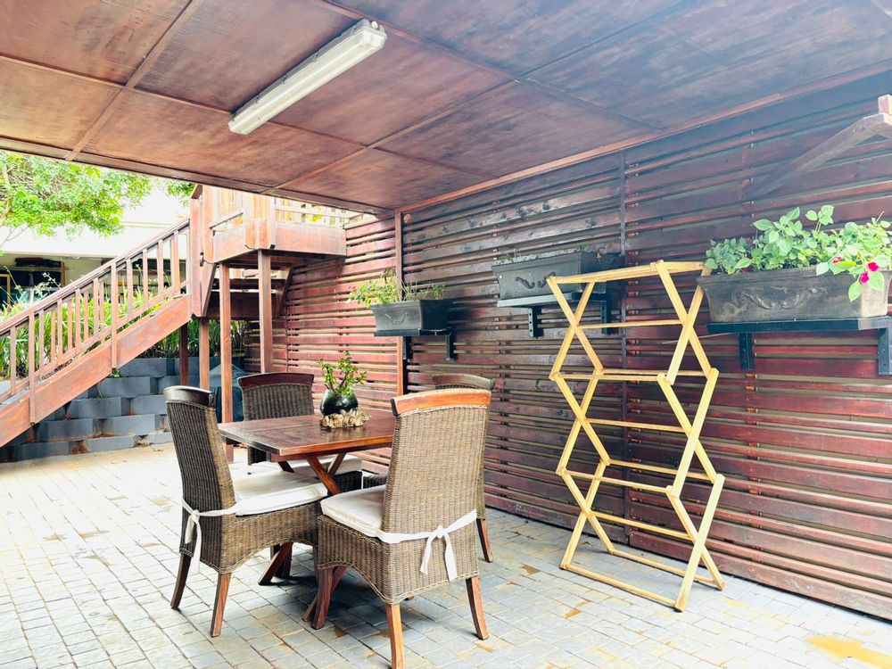 This elevated residence boasts an open layout that seamlessly connects the inviting lounge area to a wooden decked balcony, where you can indulge in breathtaking views of lush greenery and the skyline. The balcony features a comfortable entertainment space, complete with a built-in braai and a casual seating area, perfect for soaking in the stunning surroundings.