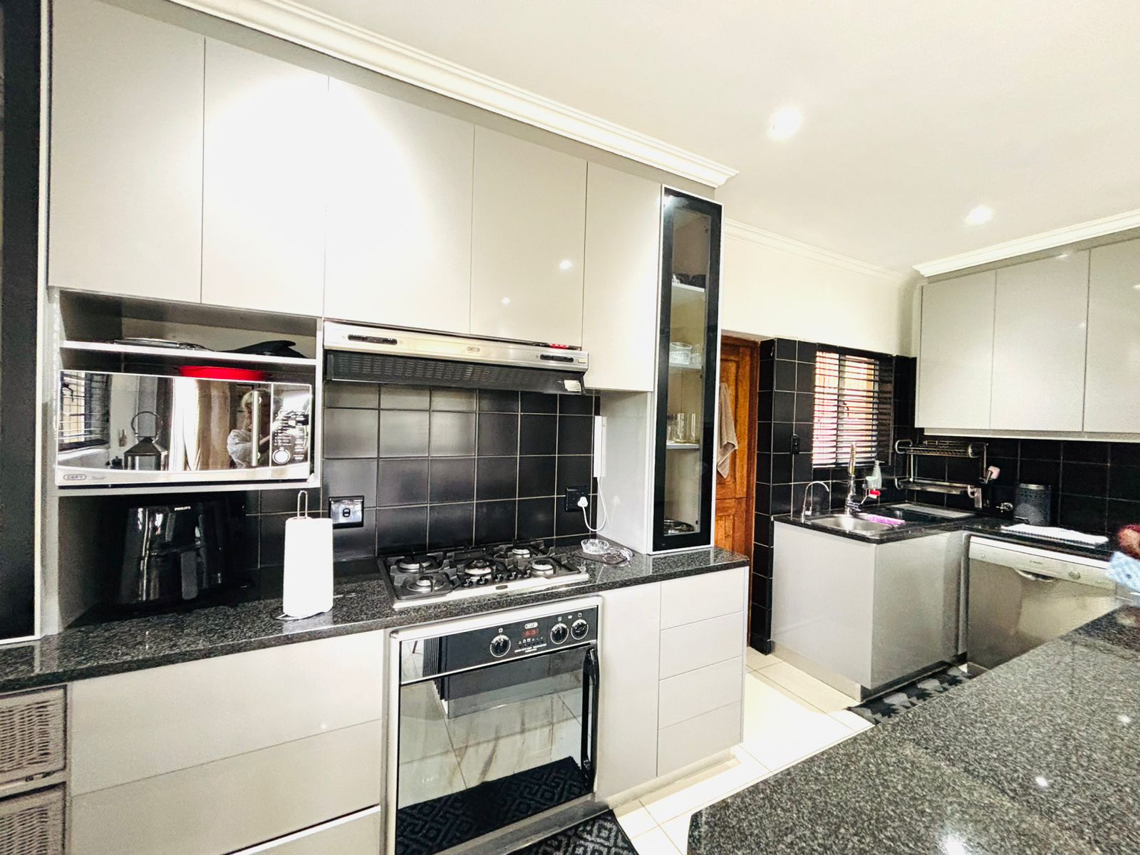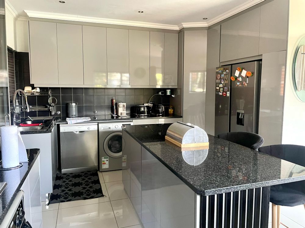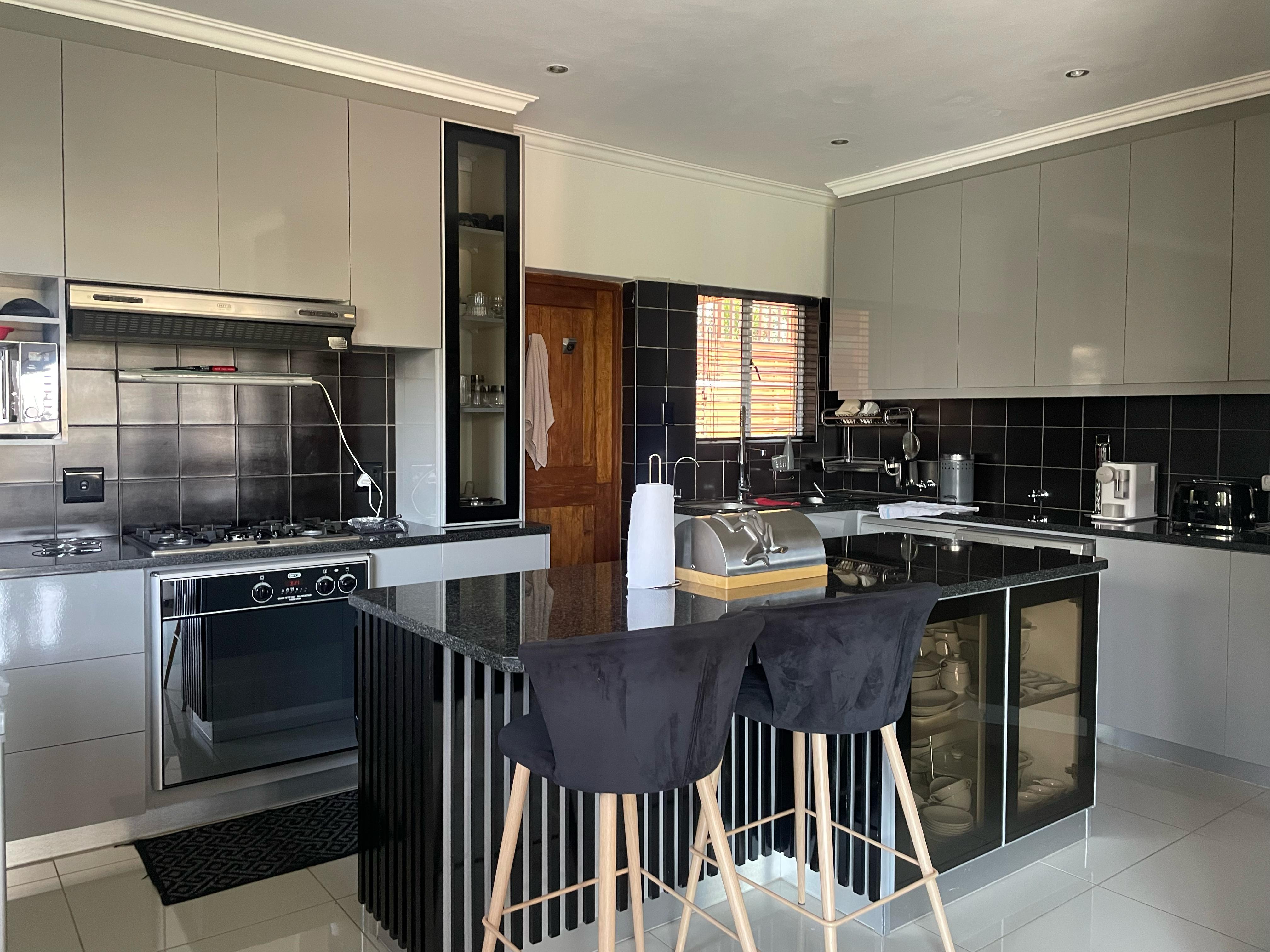 The kitchen is a stunning combination of grey cabinetry and charcoal tiles, enhanced by silver and black accents. It serves as the centerpiece of the home and is fully equipped with a gas hob, designated space for a double door fridge, a pantry, and a kitchen island.