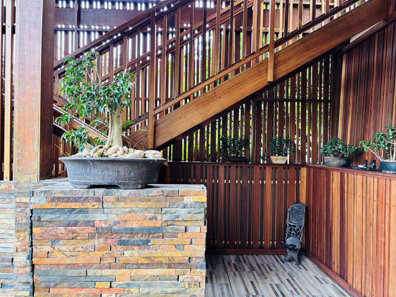 The lounge is spacious enough to accommodate your furniture and includes a built-in feature wall for your TV unit. Sliding doors open onto the balcony and side yard, all fitted with screens to keep insects and monkeys at bay.