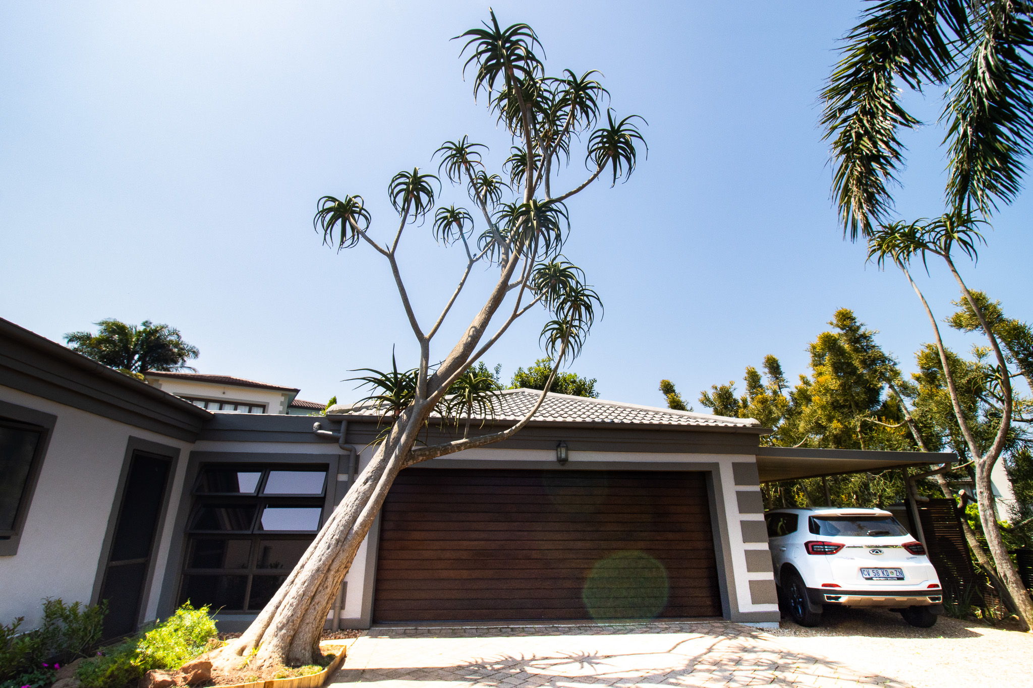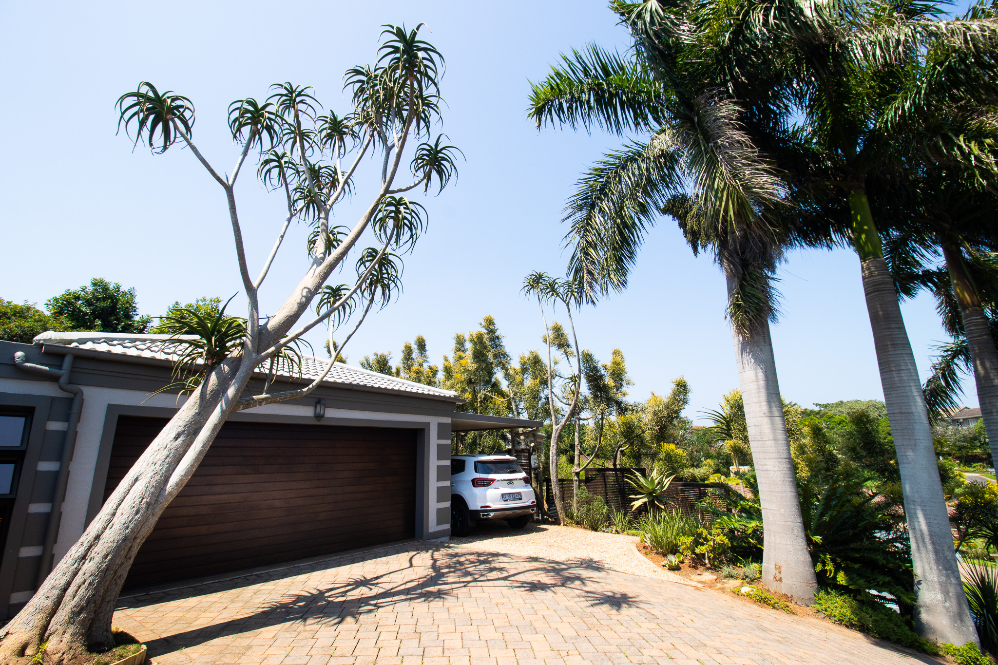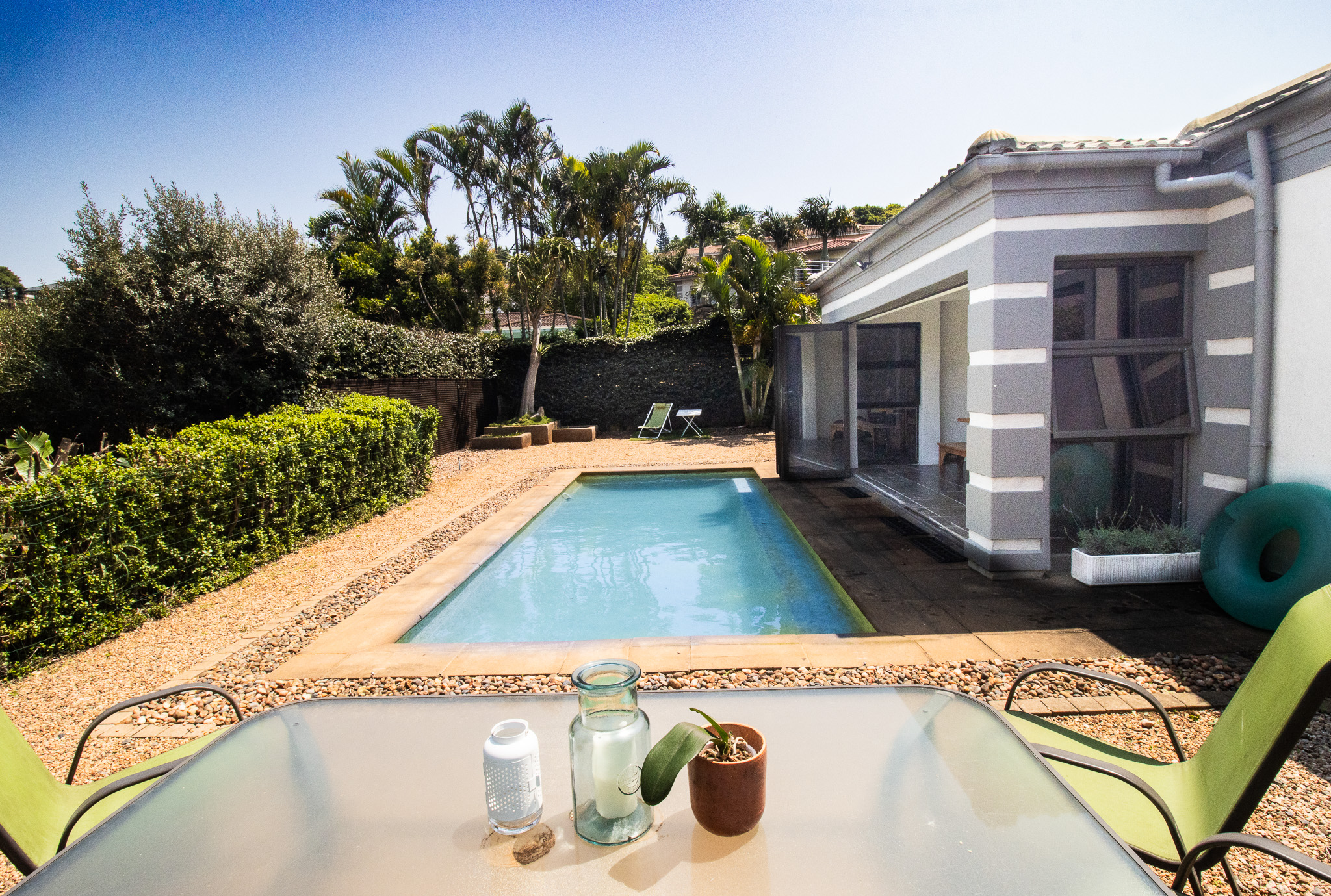 The enclosed patio offers a 2nd lounge and dining area which opens onto a gorgeous pool with brilliant entertainment space & easy living style. Stunning elevated views, with a palm-fringed driveway and manicured gardens. Double automated garage + carport, long enough for 2 vehicle parking spaces for visitors or extended family. Well equipped with cupboards throughout. Shutters, blinds, monkey screens on opening windows. Aircons in all 4 bedrooms and the living area. Aluminium windows and concertina sliding doors are a breeze to maintain. The pretty pool gives hours of fun, and this area is fenced and walled. 3 Jojo water tanks. assist with keeping the gardens green all year round.