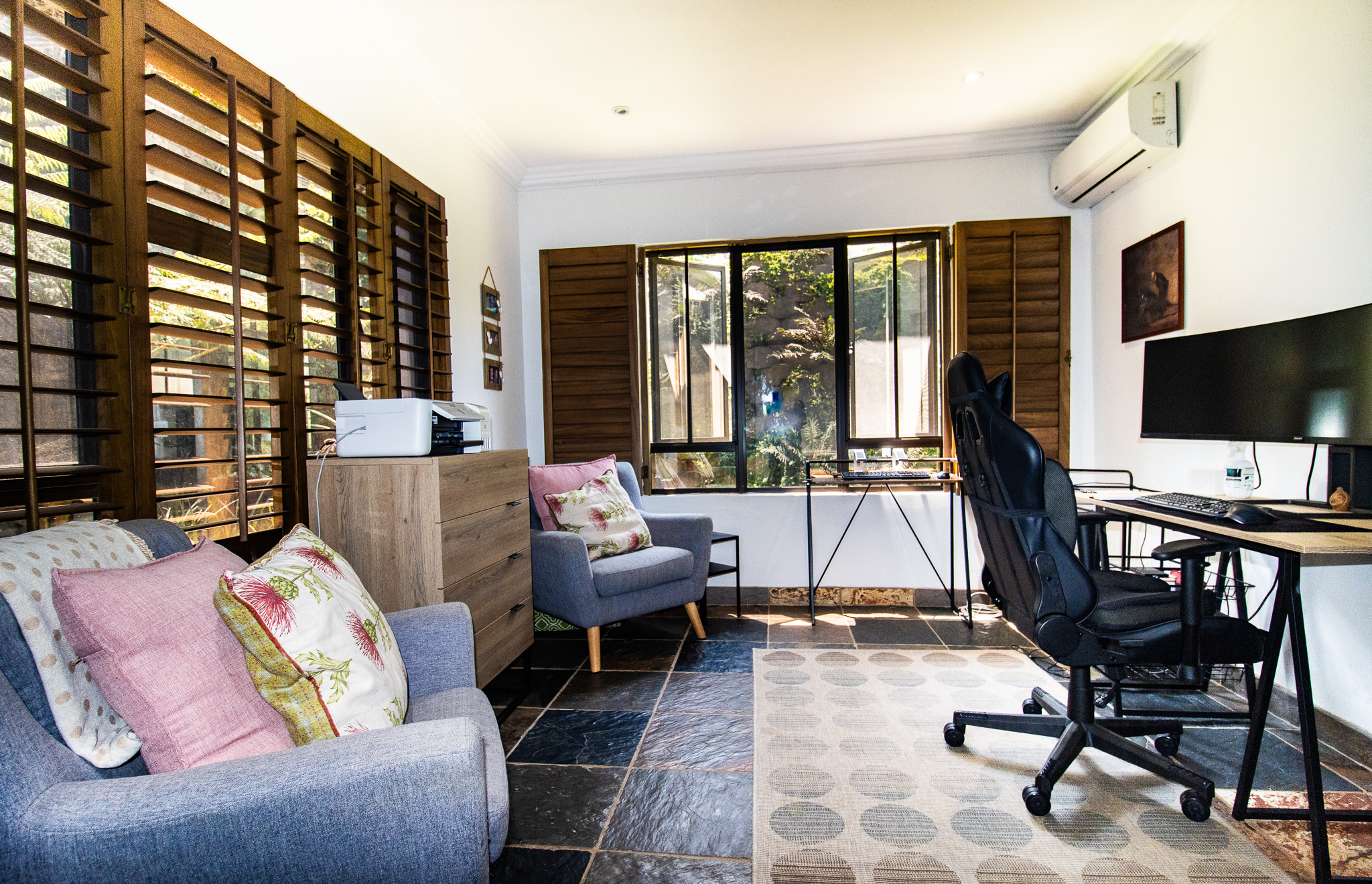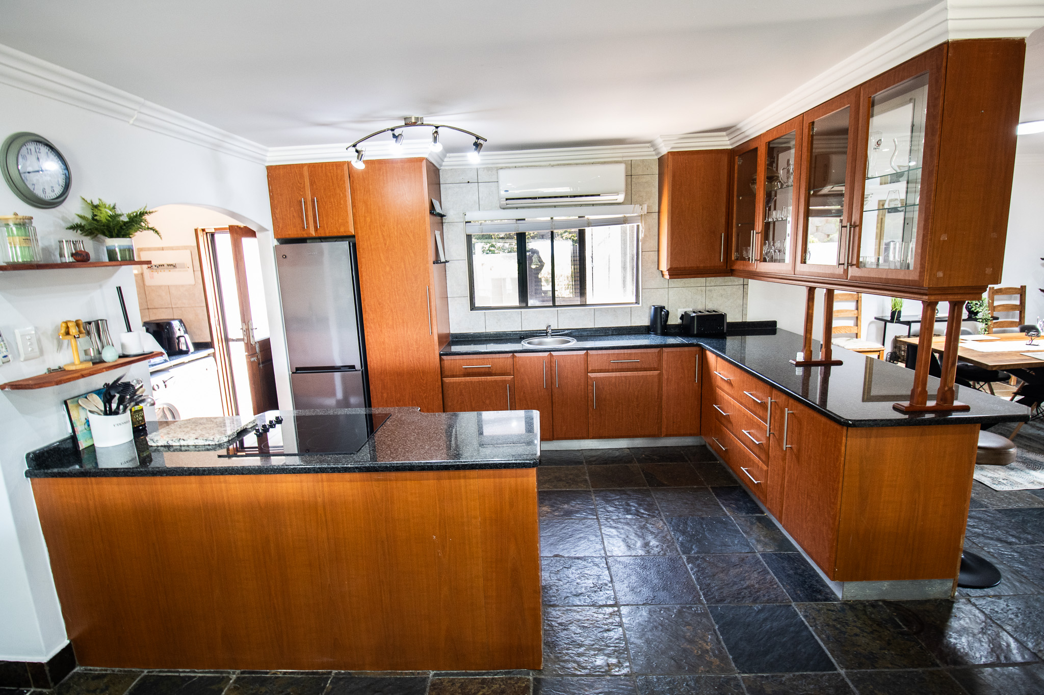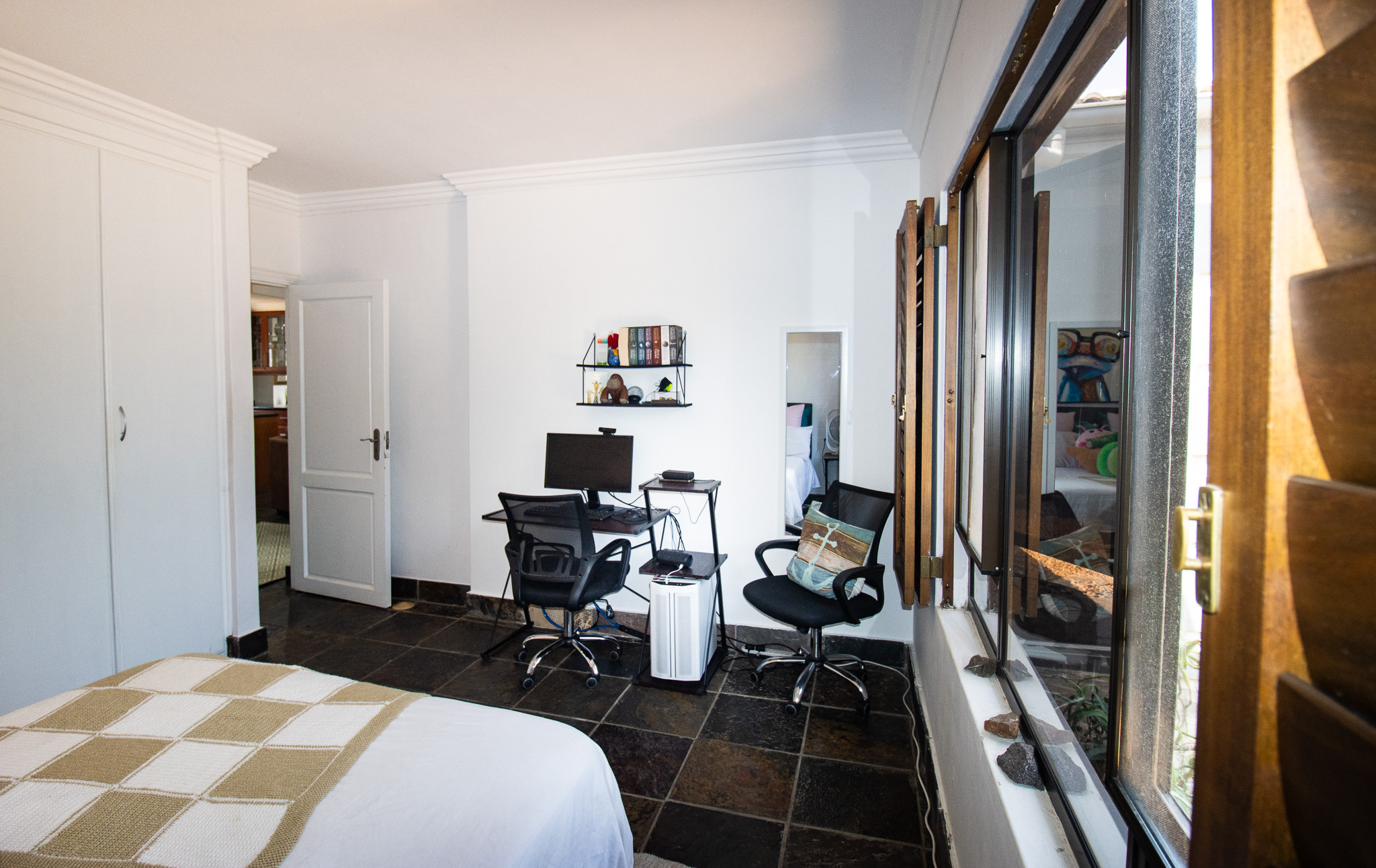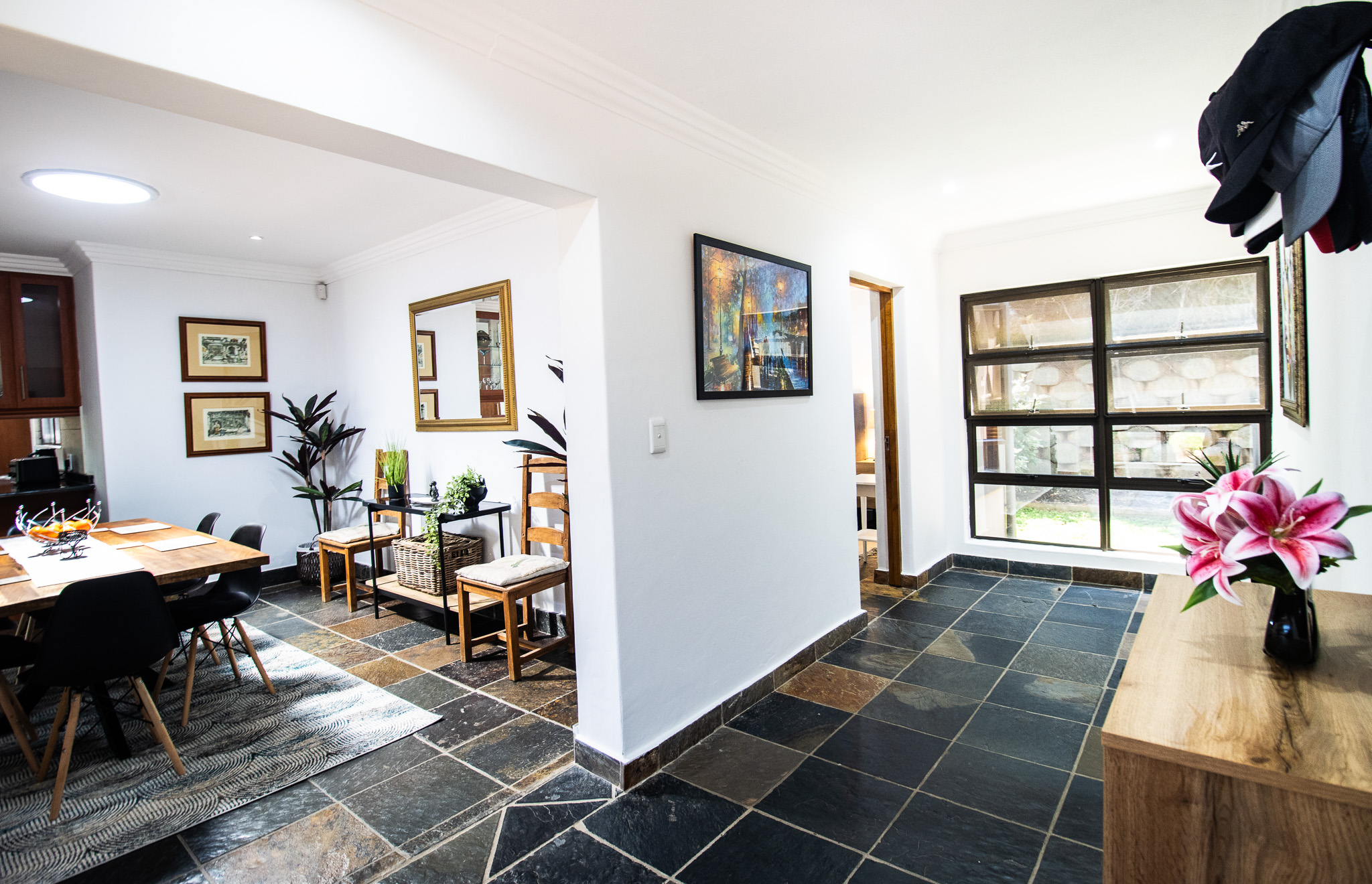 Exclusive Sole Mandate - Immaculate, Interesting, spacious & homely - all wrapped in this package. 4 bedrooms with 2 en-suite bathrooms and a 3rd family bathroom with shower and bath. Study + additional open area that can be used as photo gallery, small lounge or computer gaming station. Open plan living and dining with fitted kitchen, granite tops, and scullery with space for 2 undercounter appliances. Large enclosed, paved yard area.