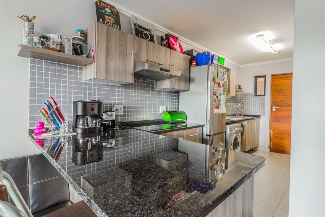 The open-plan kitchen is fitted with granite countertops and stone-ash cupboards, offering a sleek and functional workspace with space for two under-counter appliances. The kitchen flows effortlessly into the spacious lounge area, which opens onto a balcony with space for a braai, ideal for entertaining or relaxing.