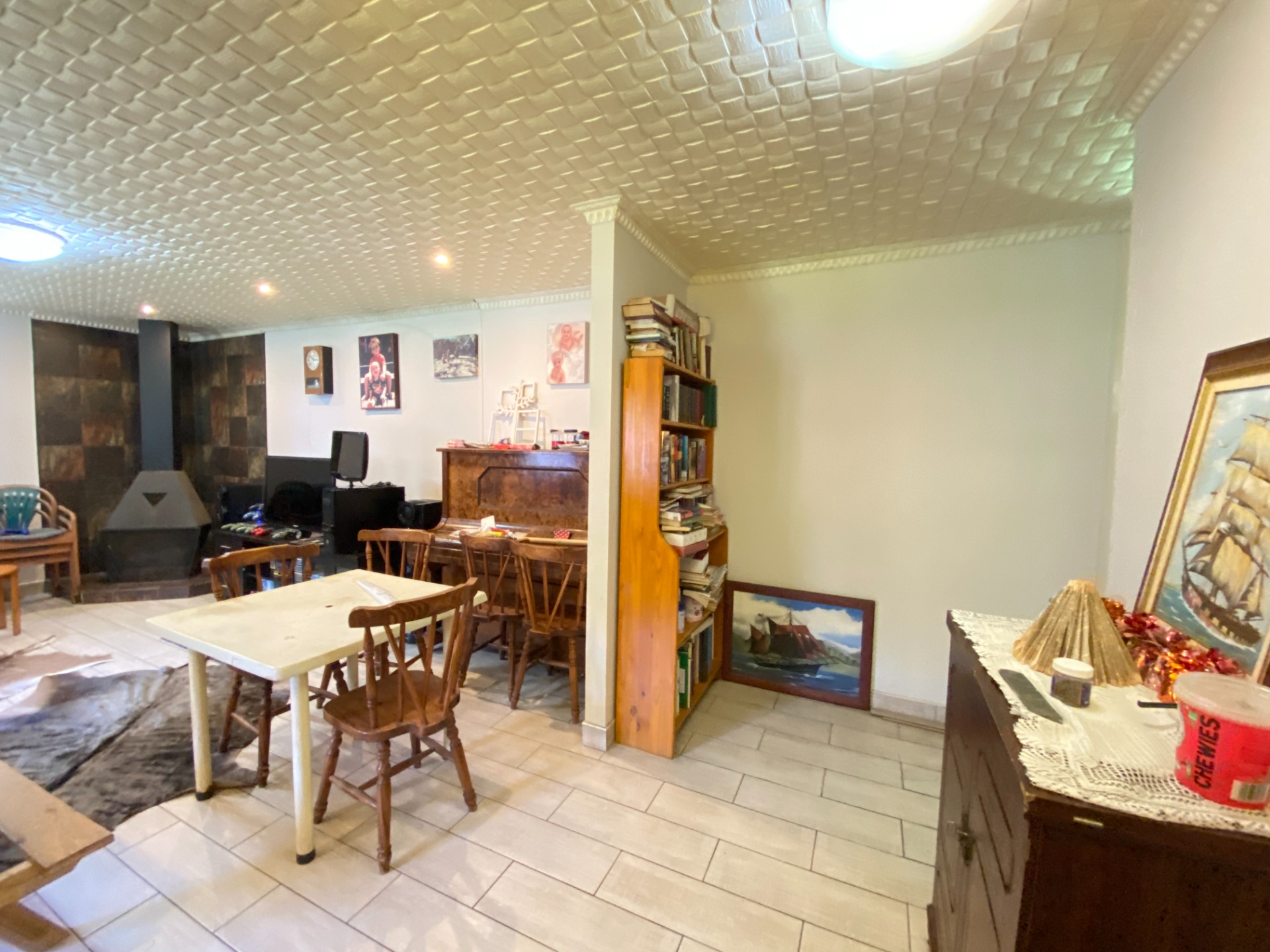 The living area of this home is beautifully decorated with tiles and enhanced by downlights, creating a stylish and well-lit atmosphere. The fireplace is a focal point of the space, adding warmth and charm.