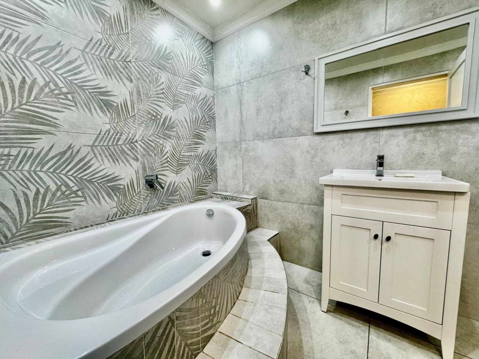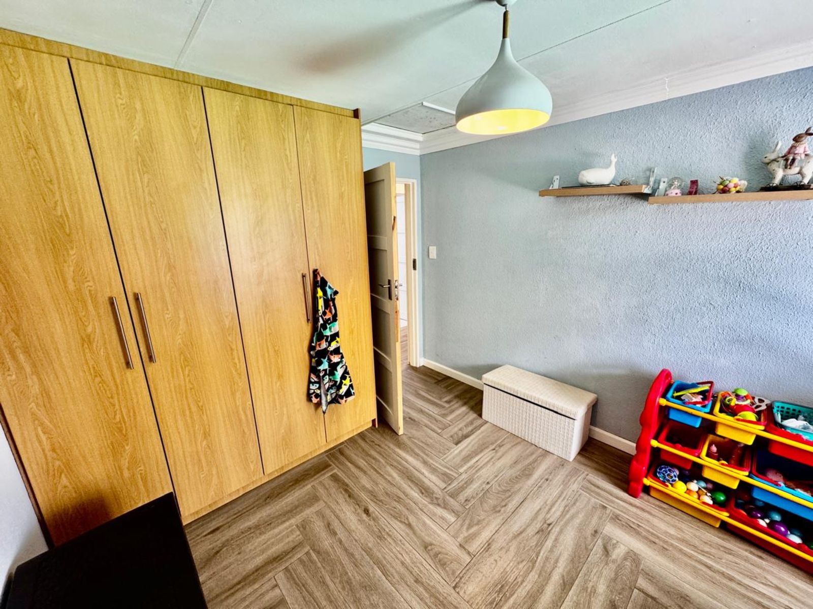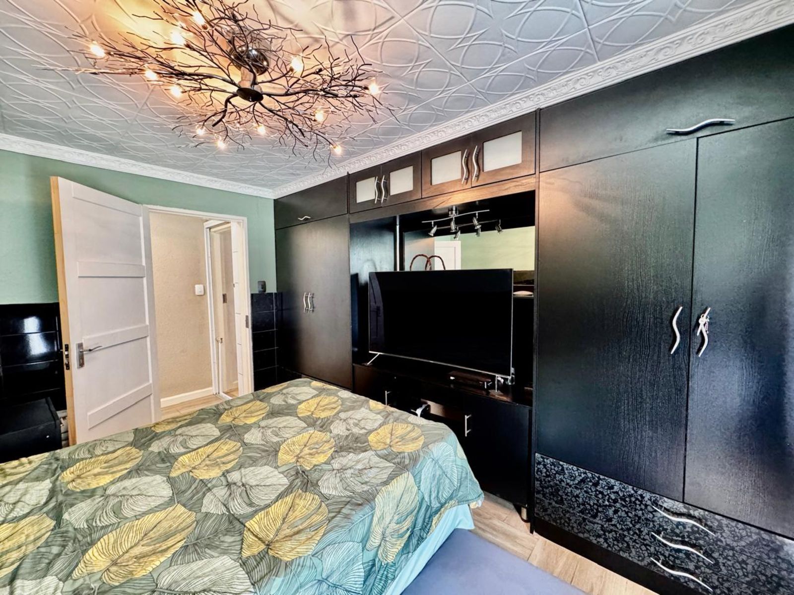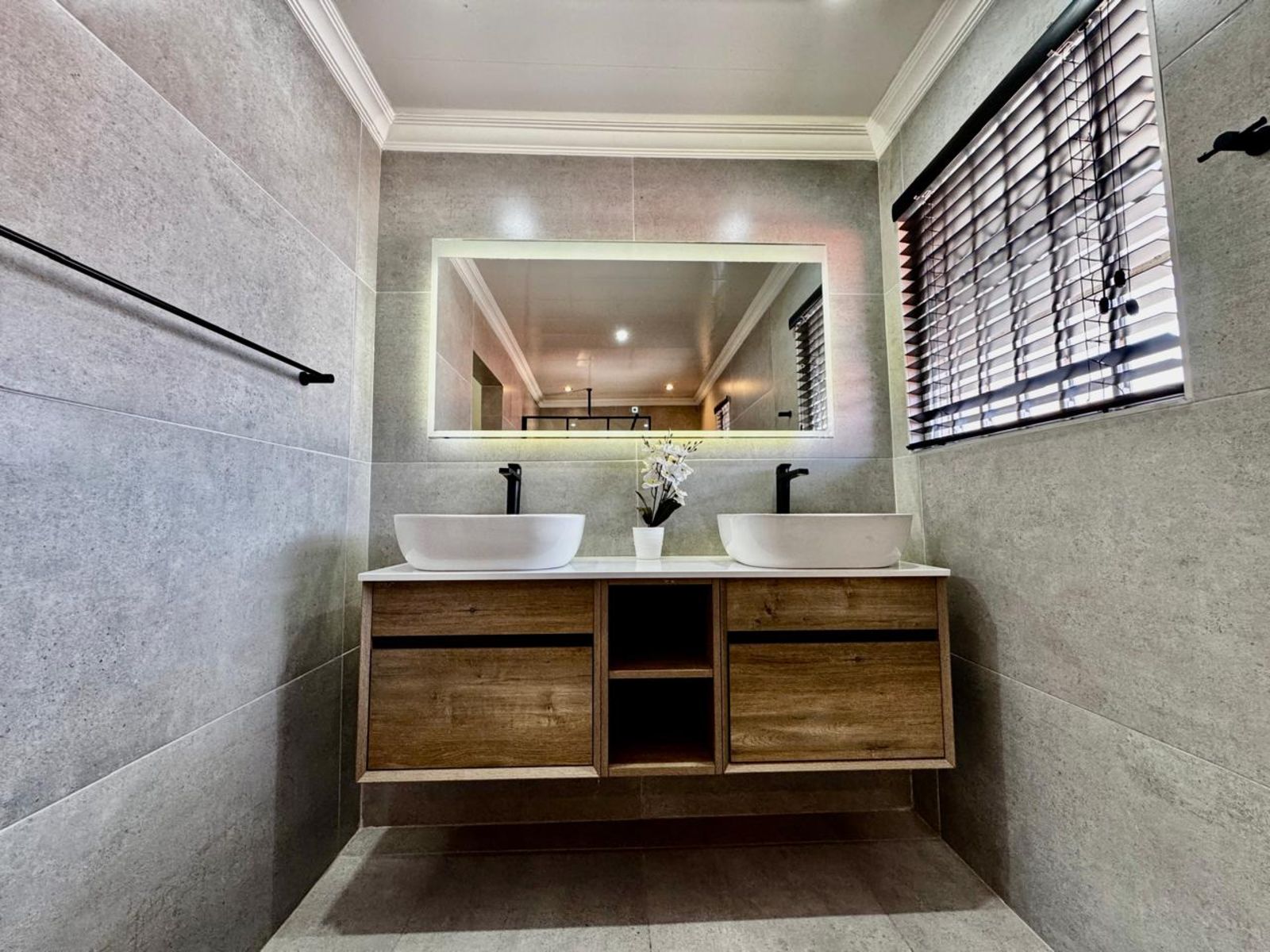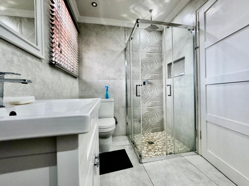 The home boasts three stylish bedrooms, all with modern built-in cupboards and contemporary tiling. The main bedroom is a standout, featuring a built-in dressing table and a luxurious en-suite bathroom with a his-and-hers basin setup. The second full family bathroom** is equally impressive, with elegant finishes that exude sophistication.