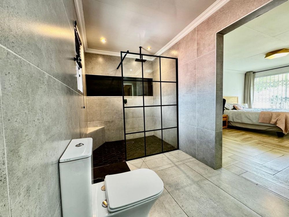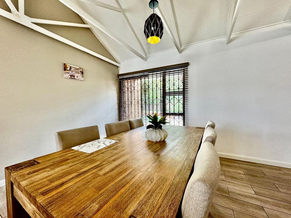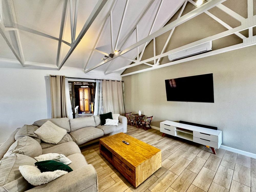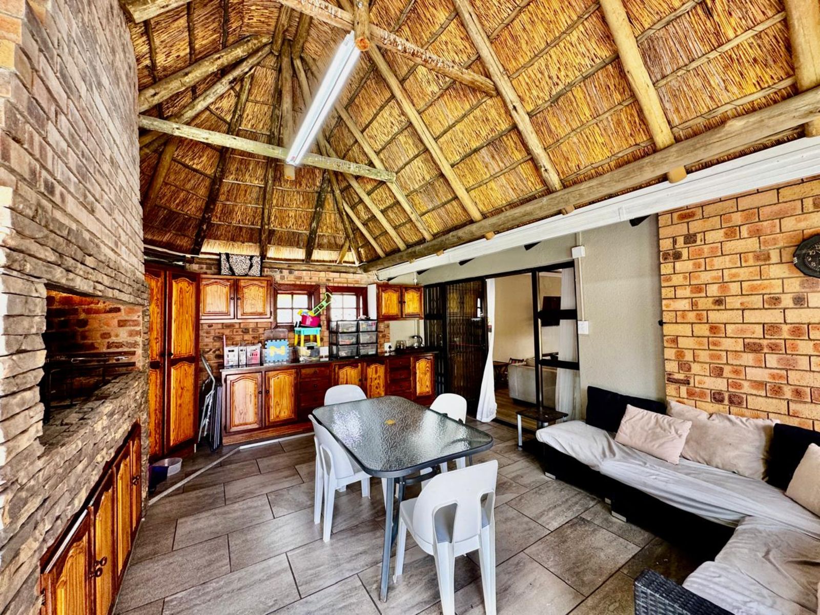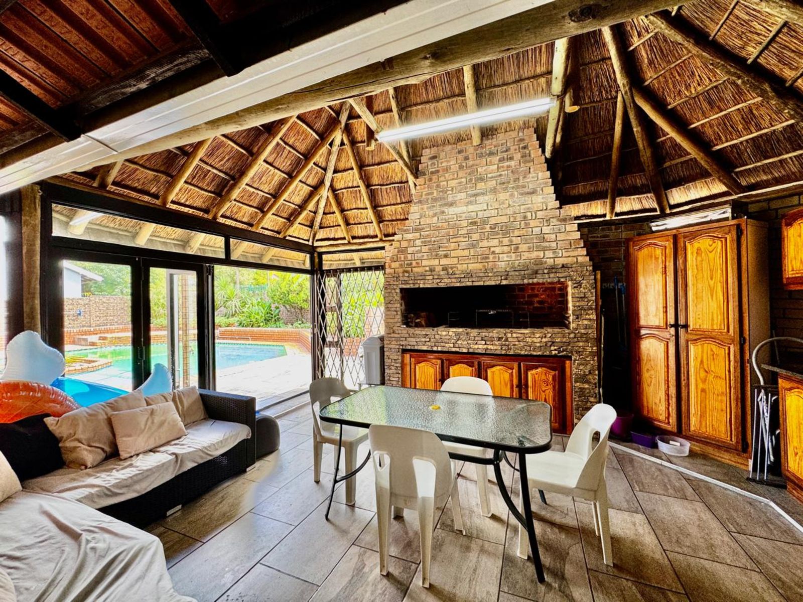 The indoor entertainment area is built for year-round enjoyment, complete with built-in cupboards and a built-in braai—the perfect space for hosting unforgettable get-togethers. Stacking doors seamlessly connect this space to the outdoor entertainment oasis, where you’ll find a sparkling swimming pool and a cozy boma area—ideal for relaxing under the stars.