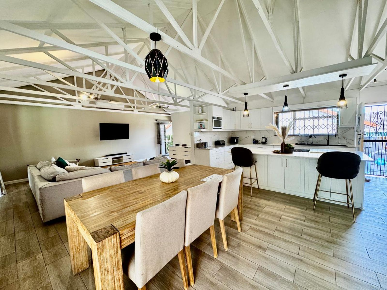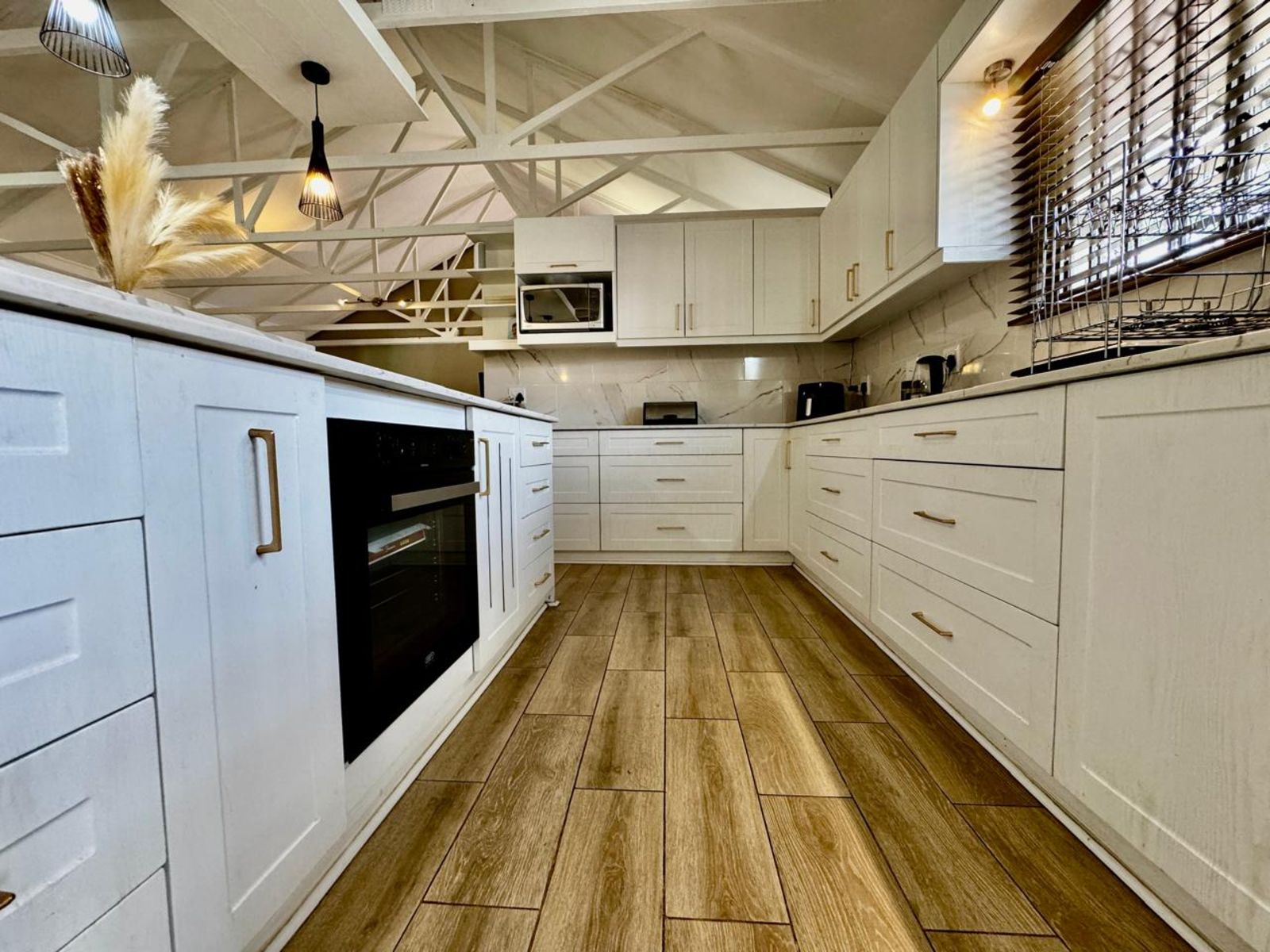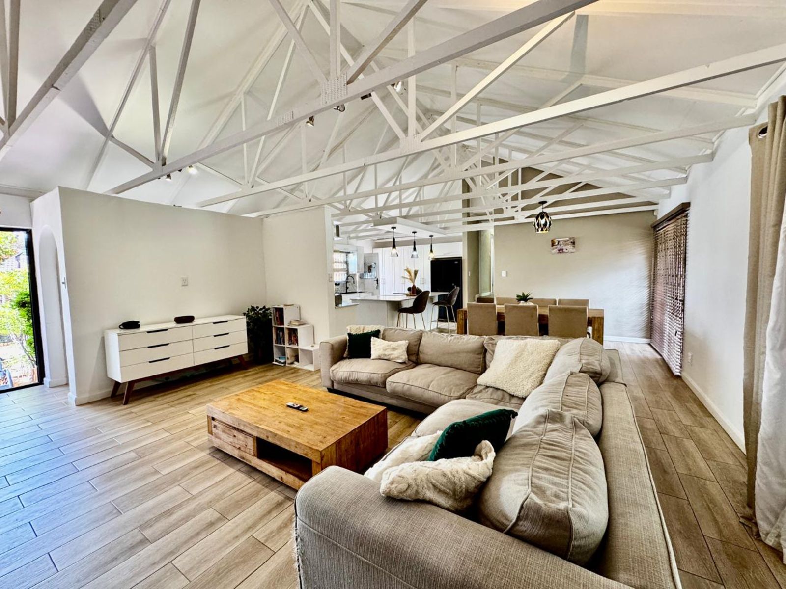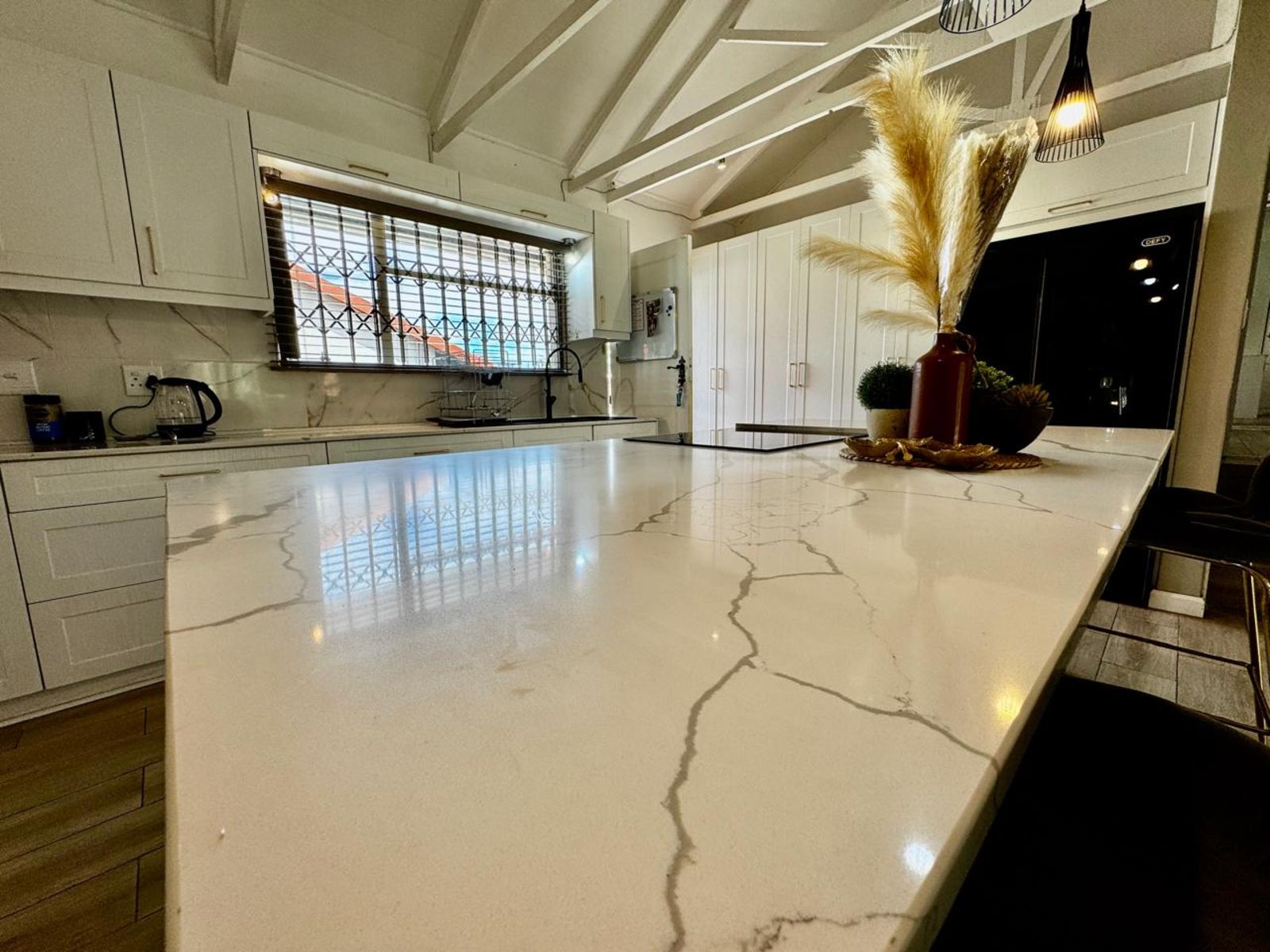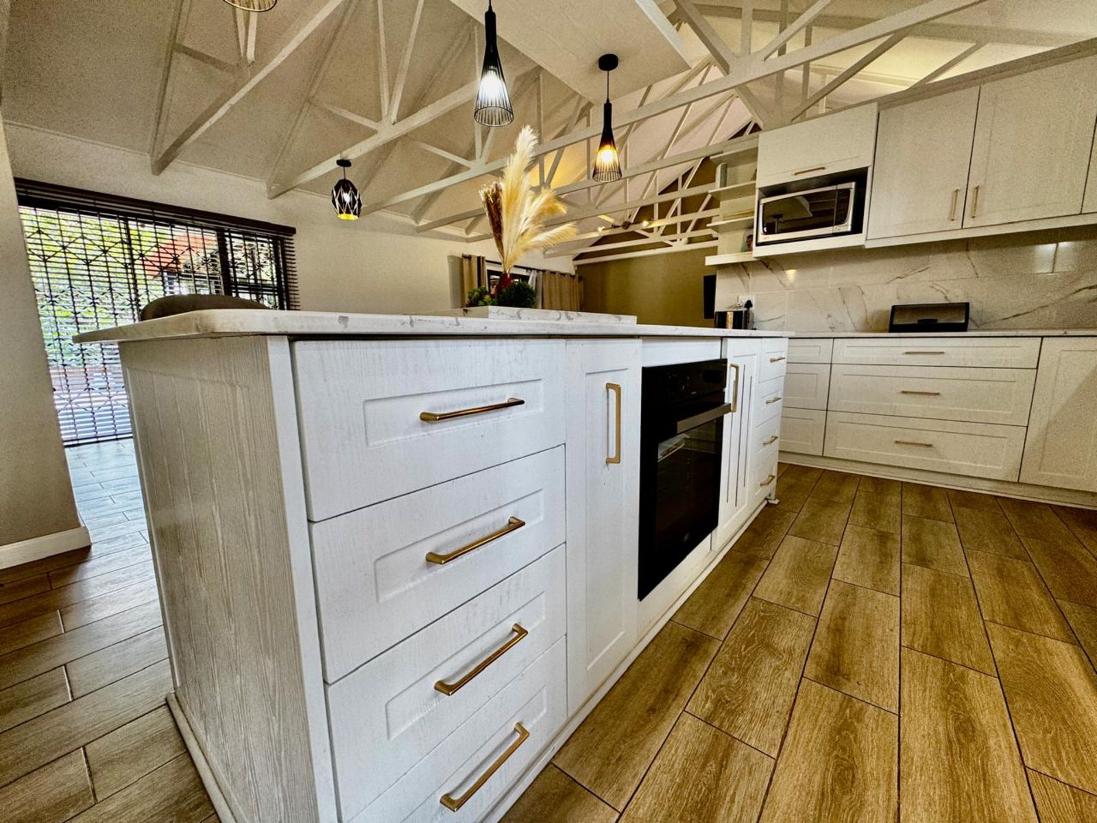 Step into a stunning open-plan living area, where exposed beams with built-in lighting create an inviting ambiance. The heart of the home is the designer kitchen, featuring sleek white melamine built-in cupboards, elegant Caesarstone countertops, and a central island that doubles as a breakfast nook—perfect for social gatherings. Smart storage solutions keep appliances like the washing machine and dishwasher tucked away for a sleek, clutter-free aesthetic.