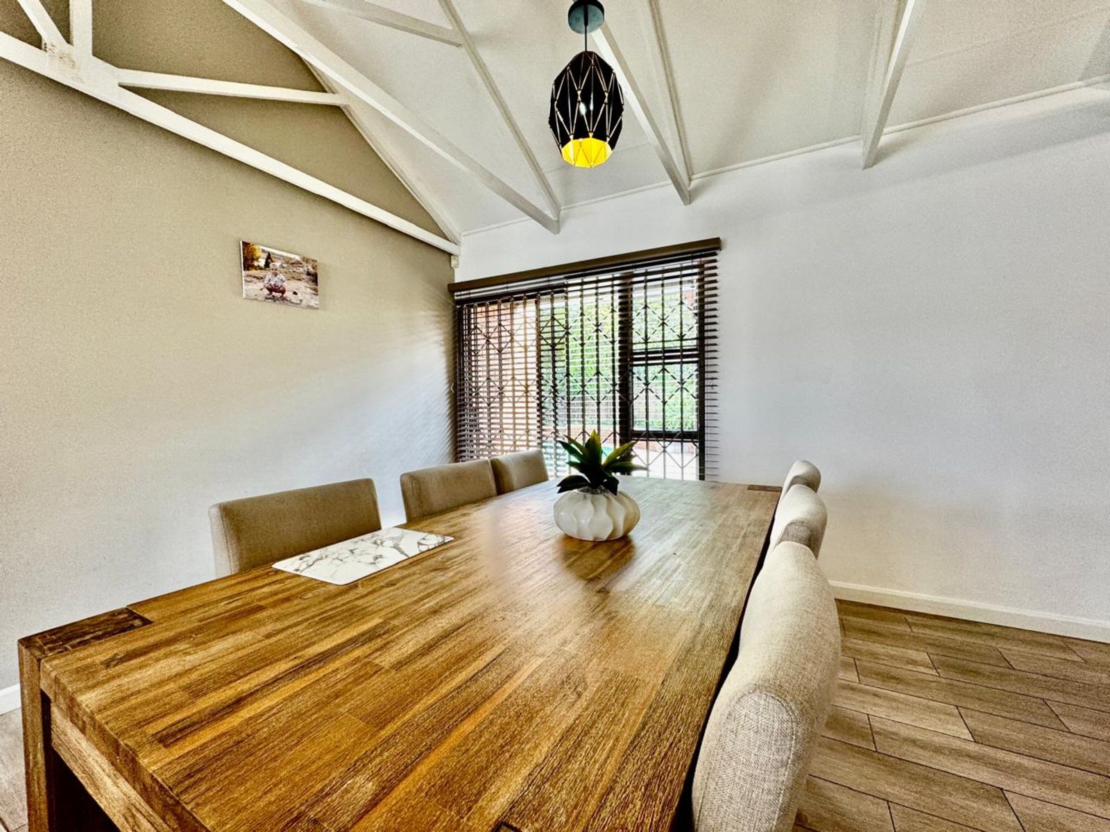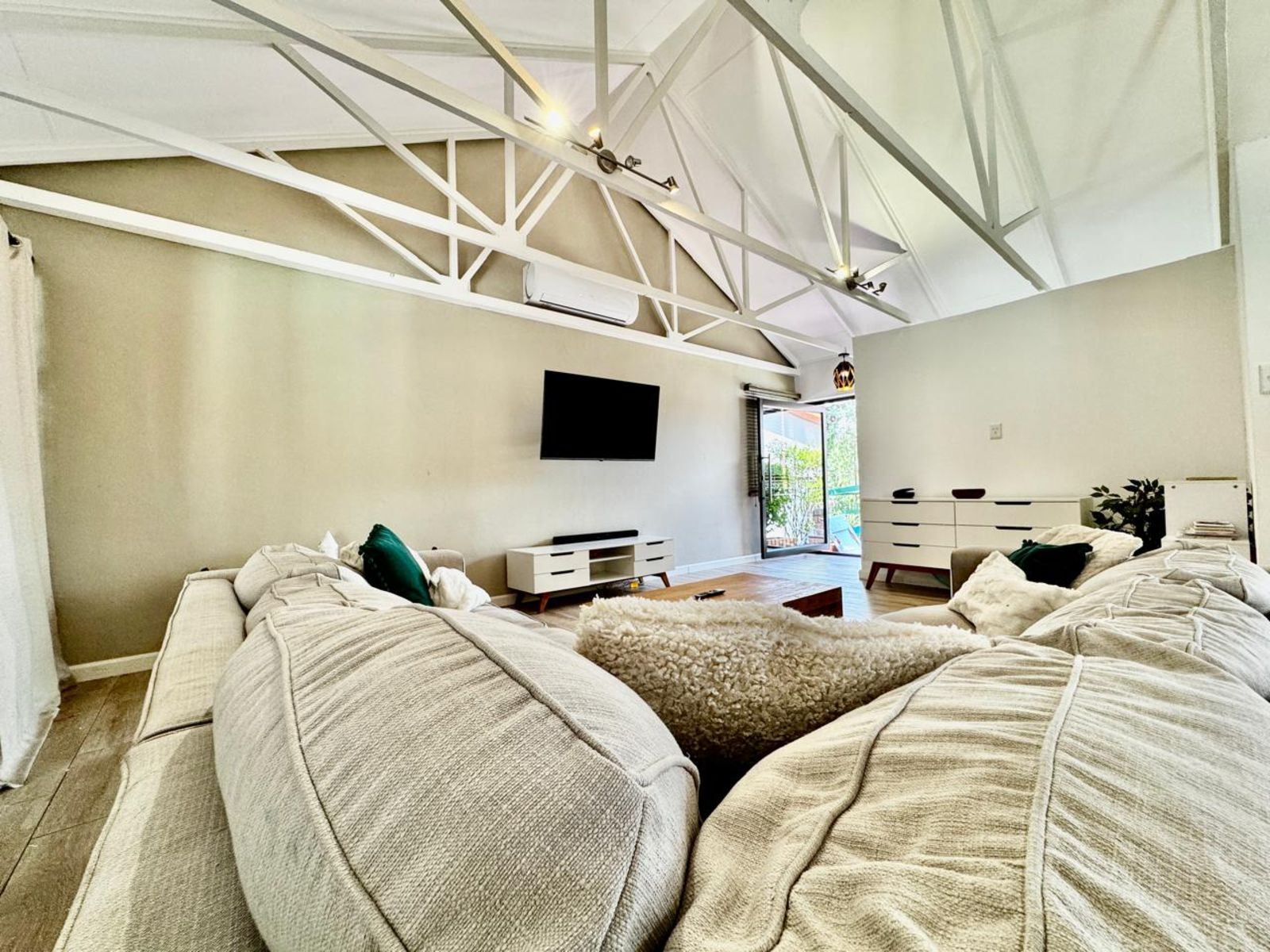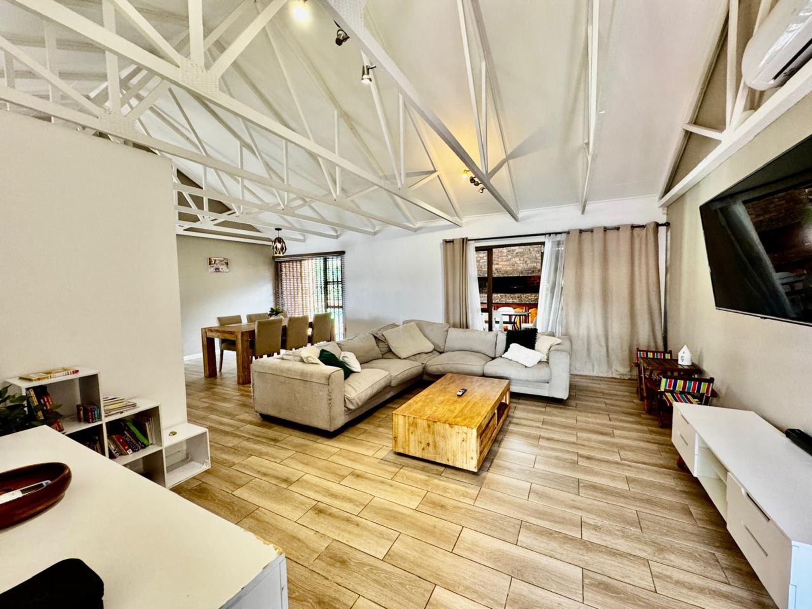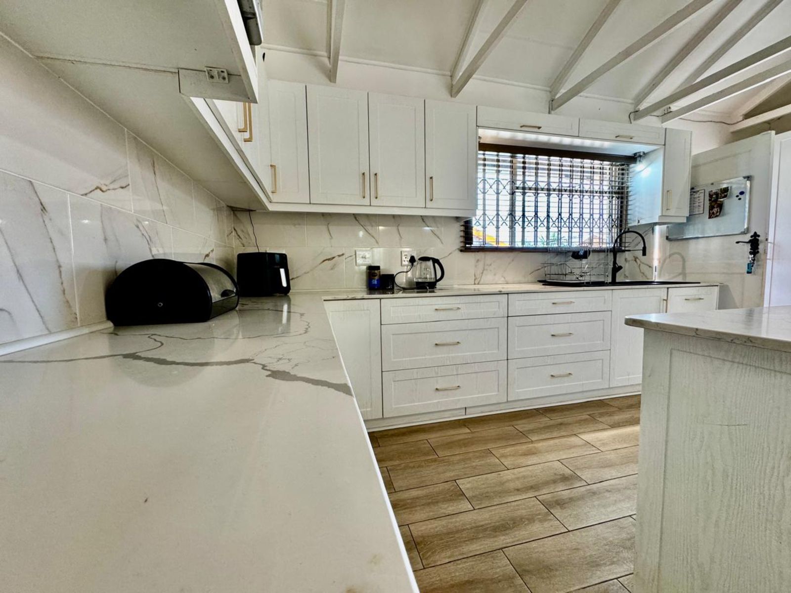 Step into a stunning open-plan living area, where exposed beams with built-in lighting create an inviting ambiance. The heart of the home is the designer kitchen, featuring sleek white melamine built-in cupboards, elegant Caesarstone countertops, and a central island that doubles as a breakfast nook—perfect for social gatherings. Smart storage solutions keep appliances like the washing machine and dishwasher tucked away for a sleek, clutter-free aesthetic.