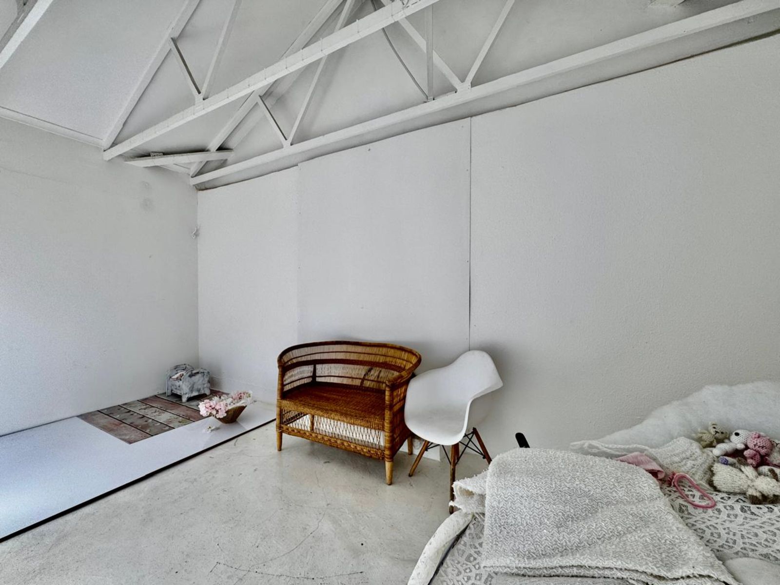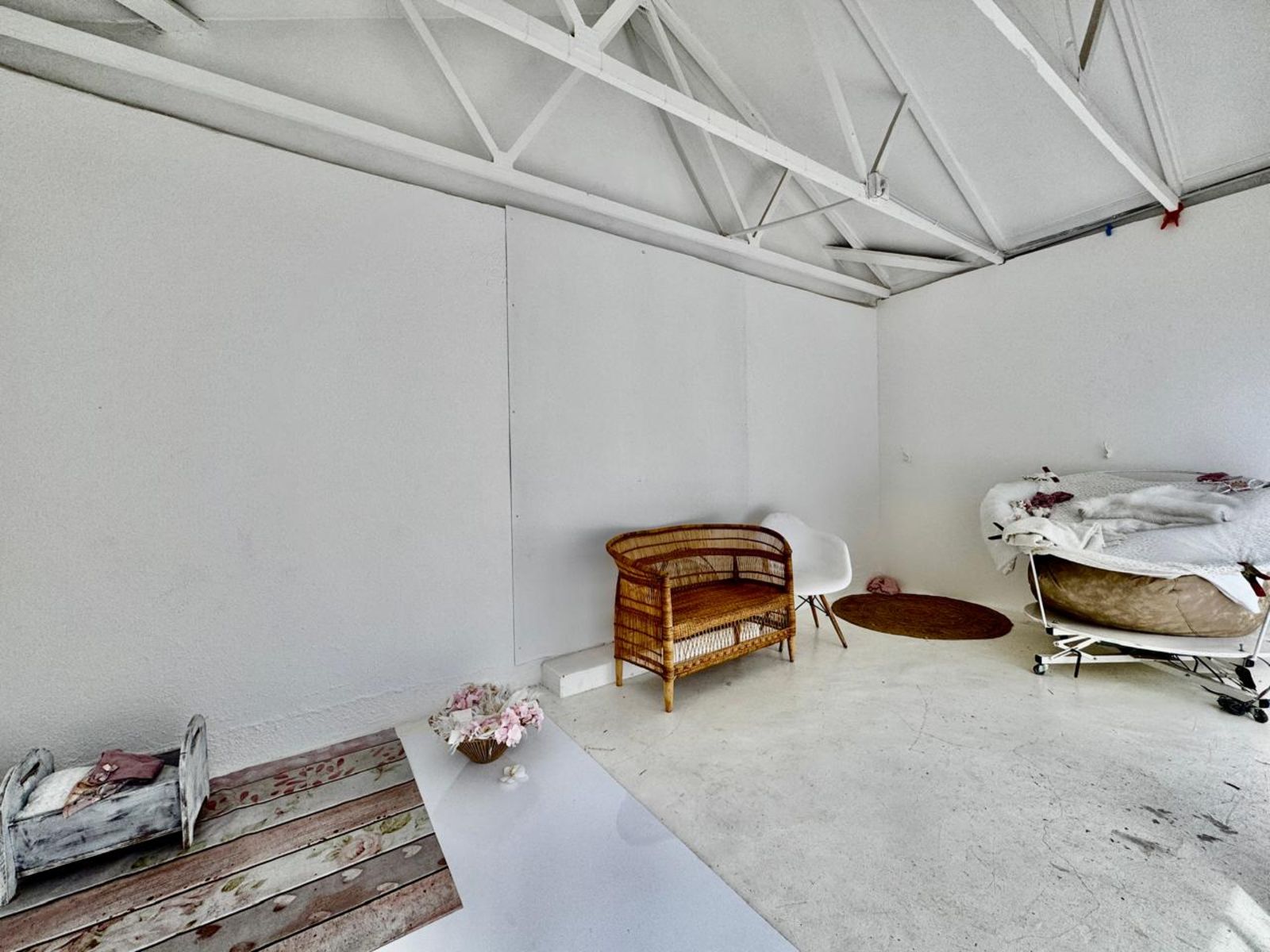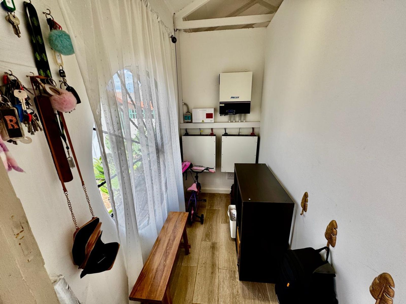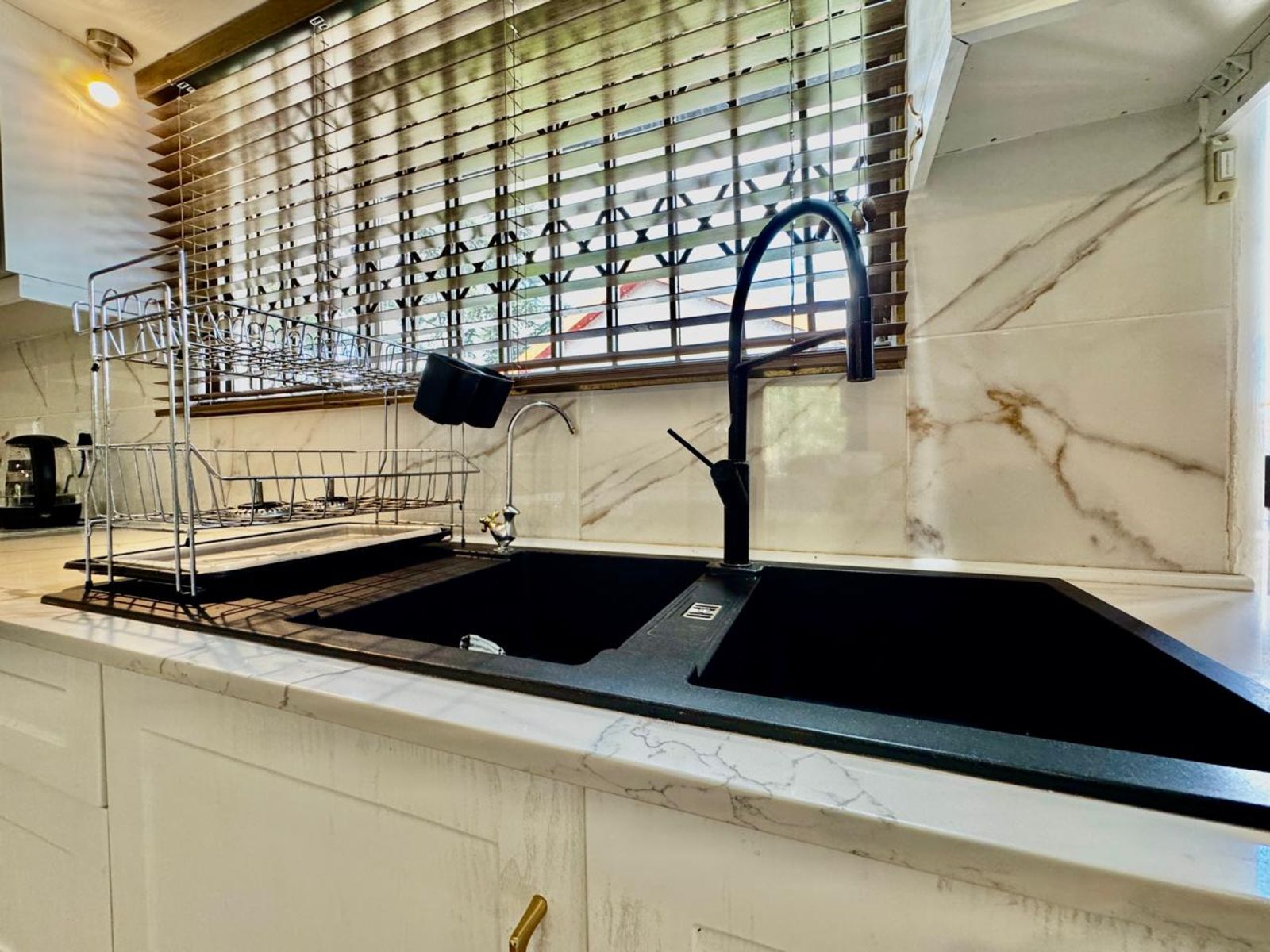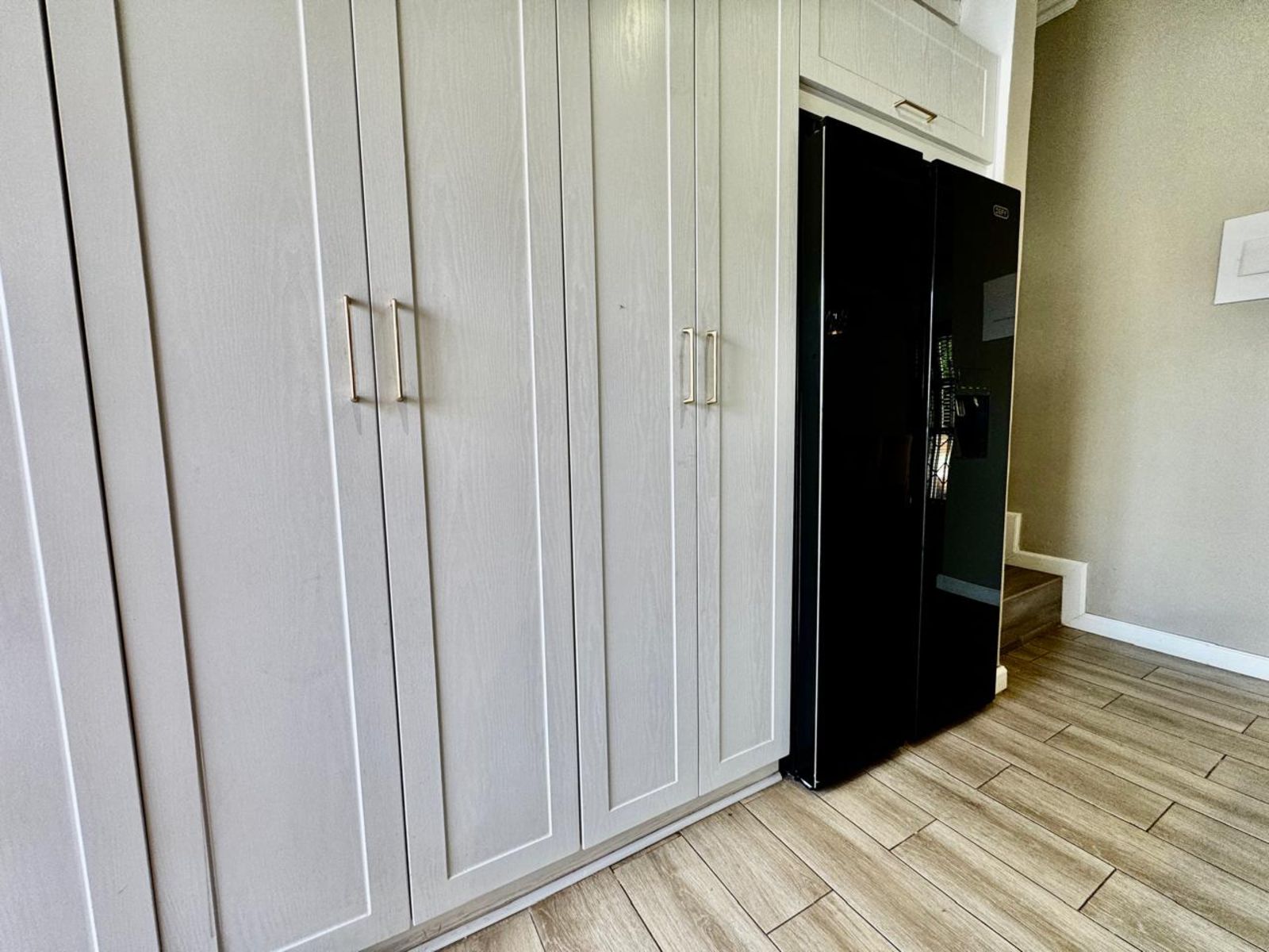 Step into a stunning open-plan living area, where exposed beams with built-in lighting create an inviting ambiance. The heart of the home is the designer kitchen, featuring sleek white melamine built-in cupboards, elegant Caesarstone countertops, and a central island that doubles as a breakfast nook—perfect for social gatherings. Smart storage solutions keep appliances like the washing machine and dishwasher tucked away for a sleek, clutter-free aesthetic.